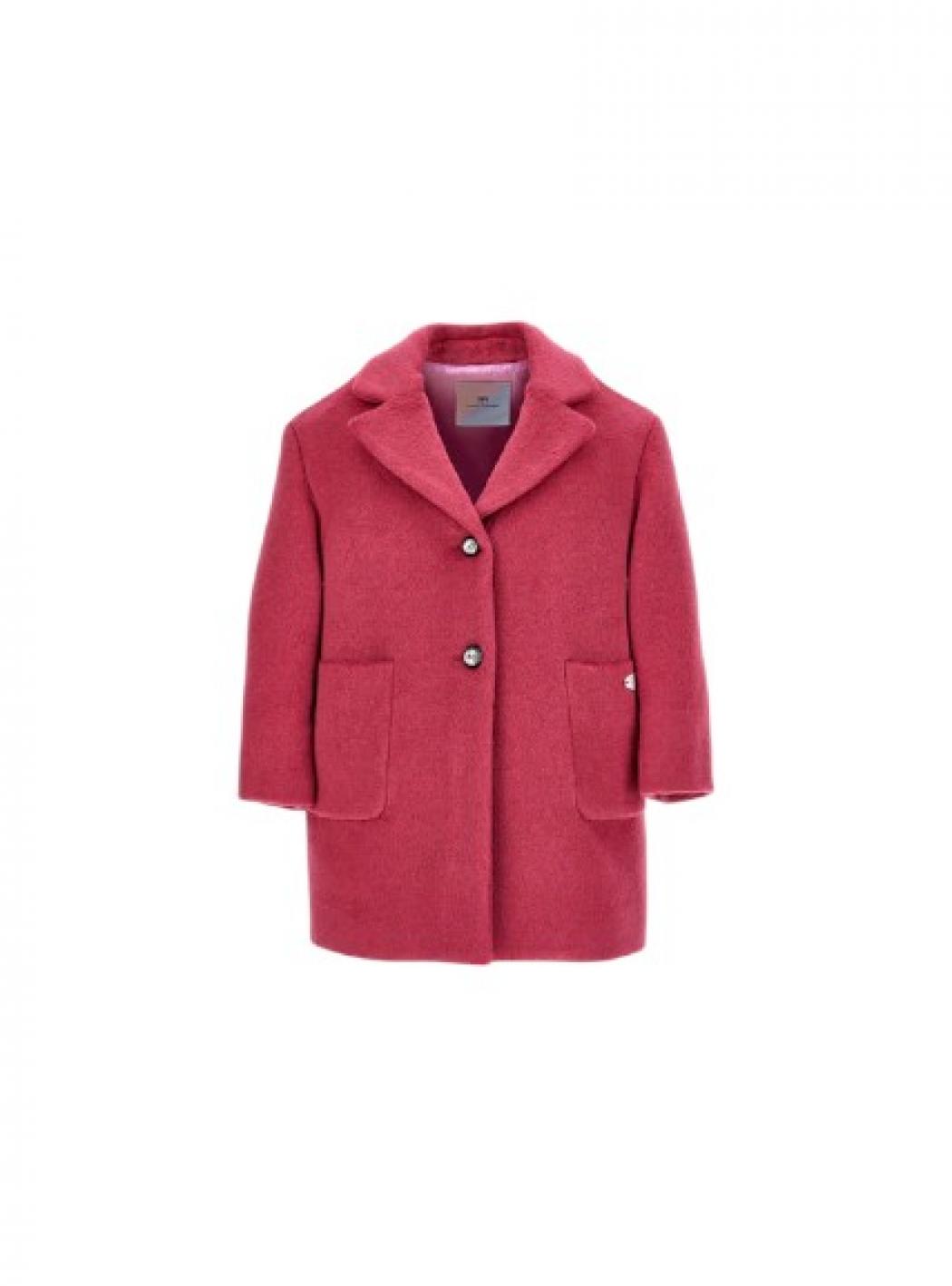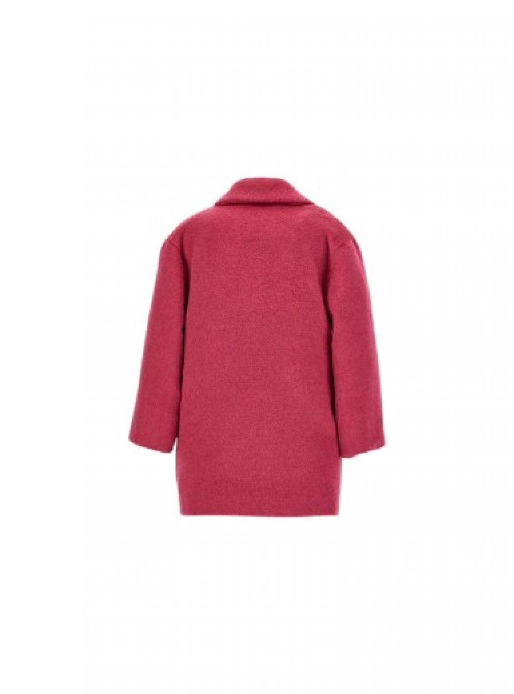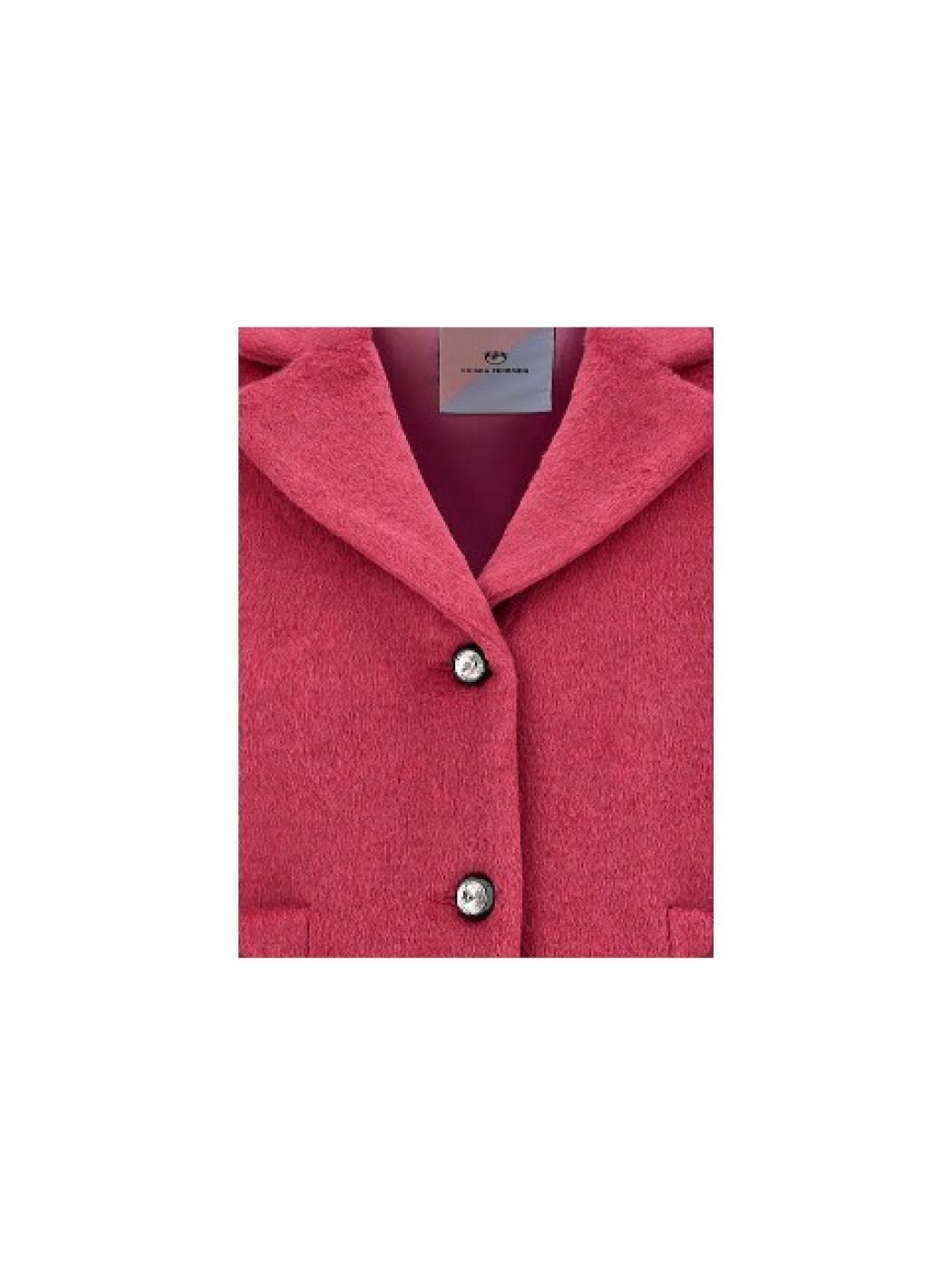 Fuchsia rose, finition texturée, étiquette de logo argent, lance révers, fermeture avant avec boutons, manches longues, deux poches avant appliquées et bord droit.