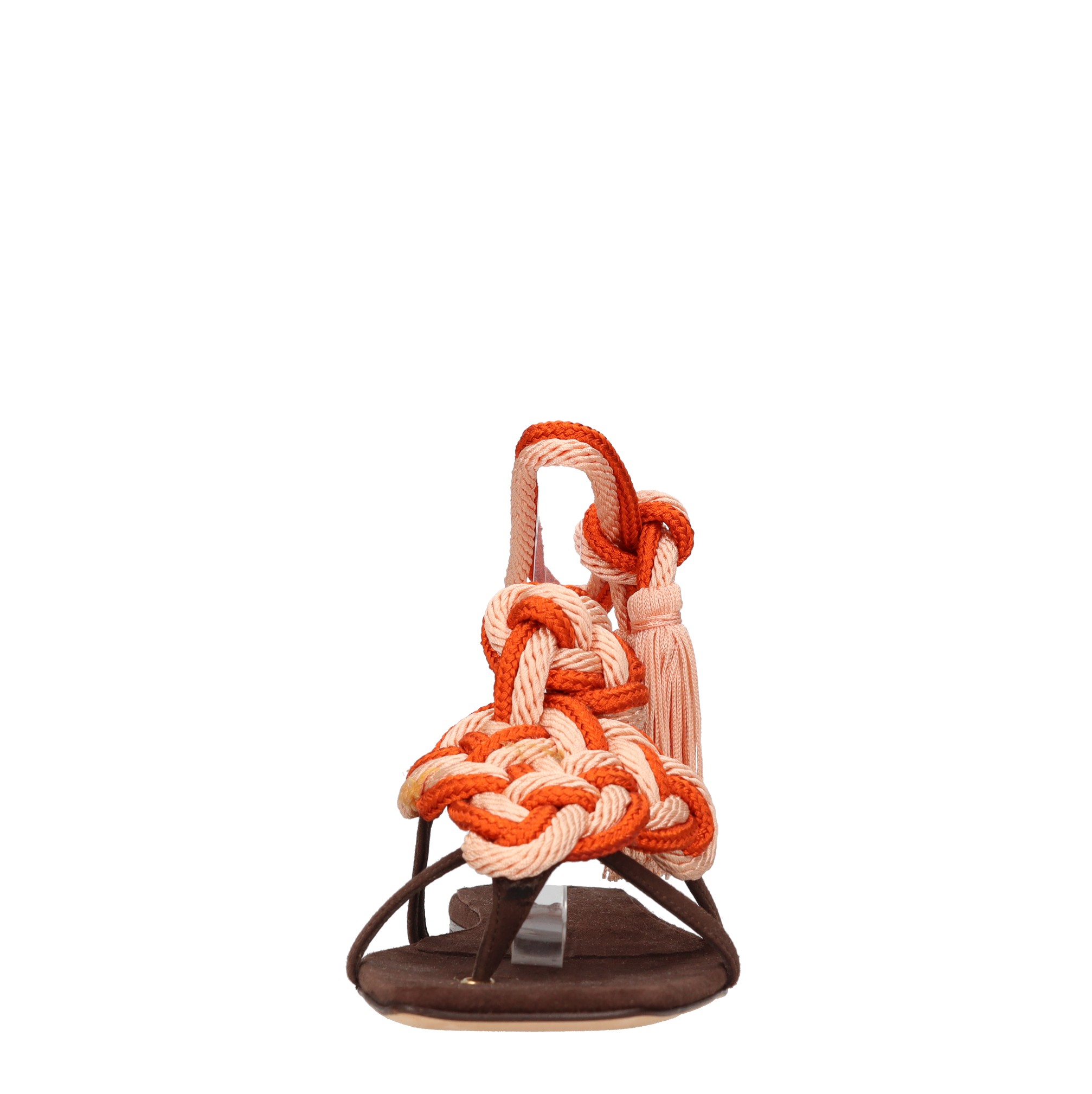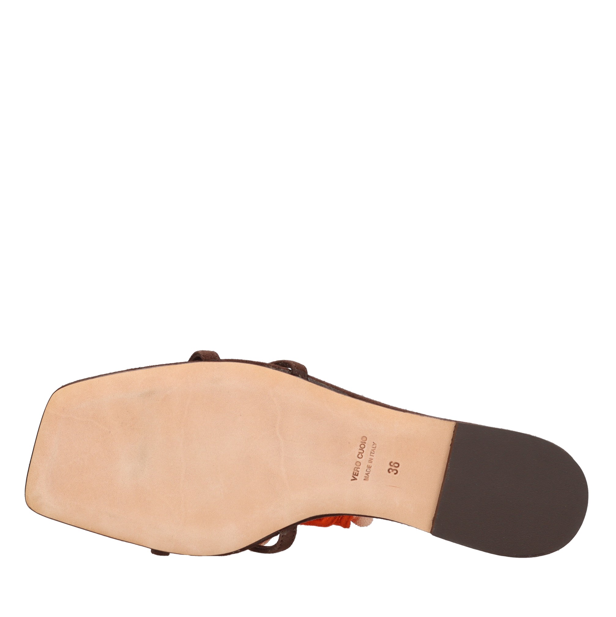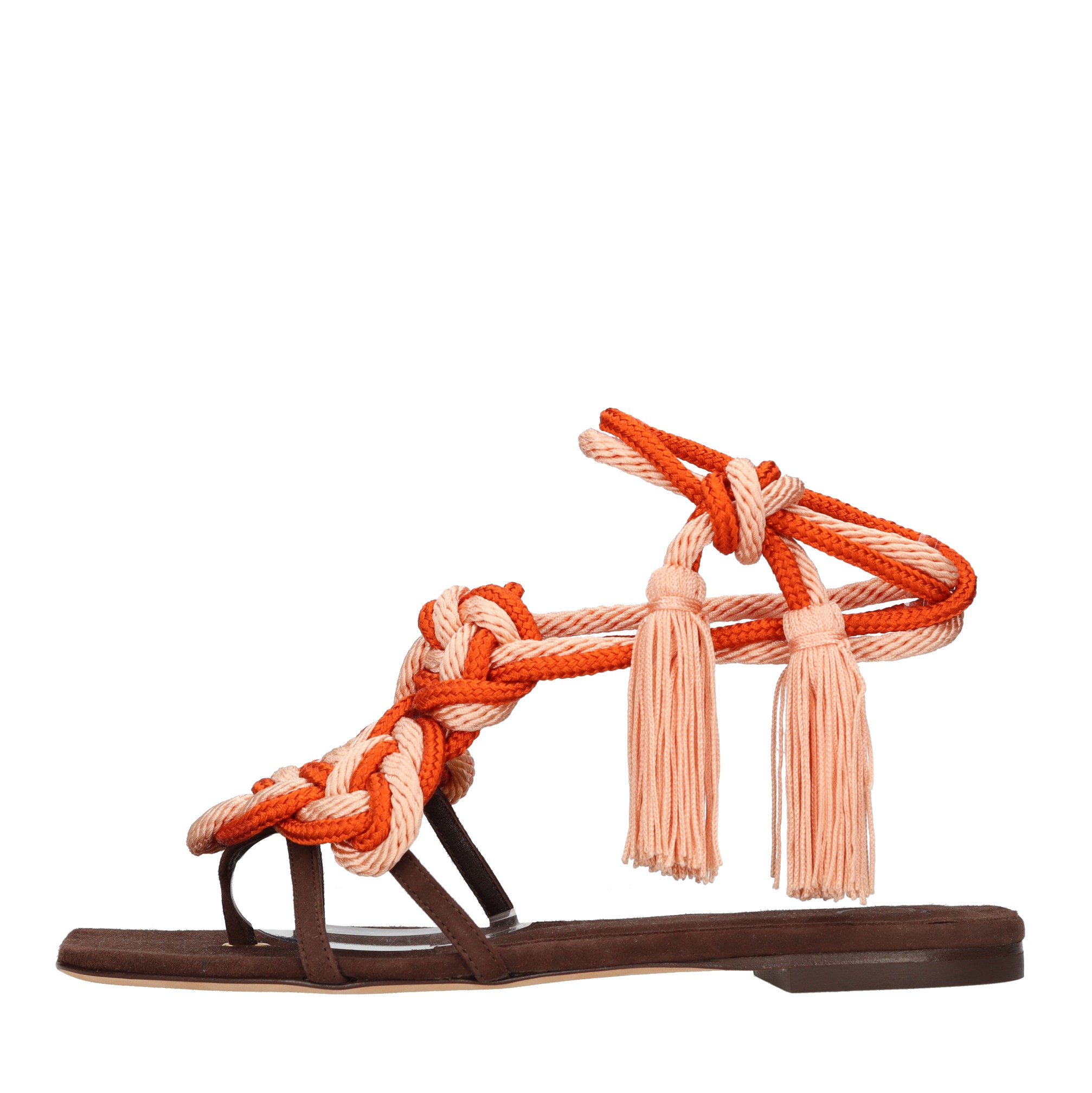 Sandales plates en daim et tissu. Semelle extérieure en cuir. Dessus intérieur en cuir.
