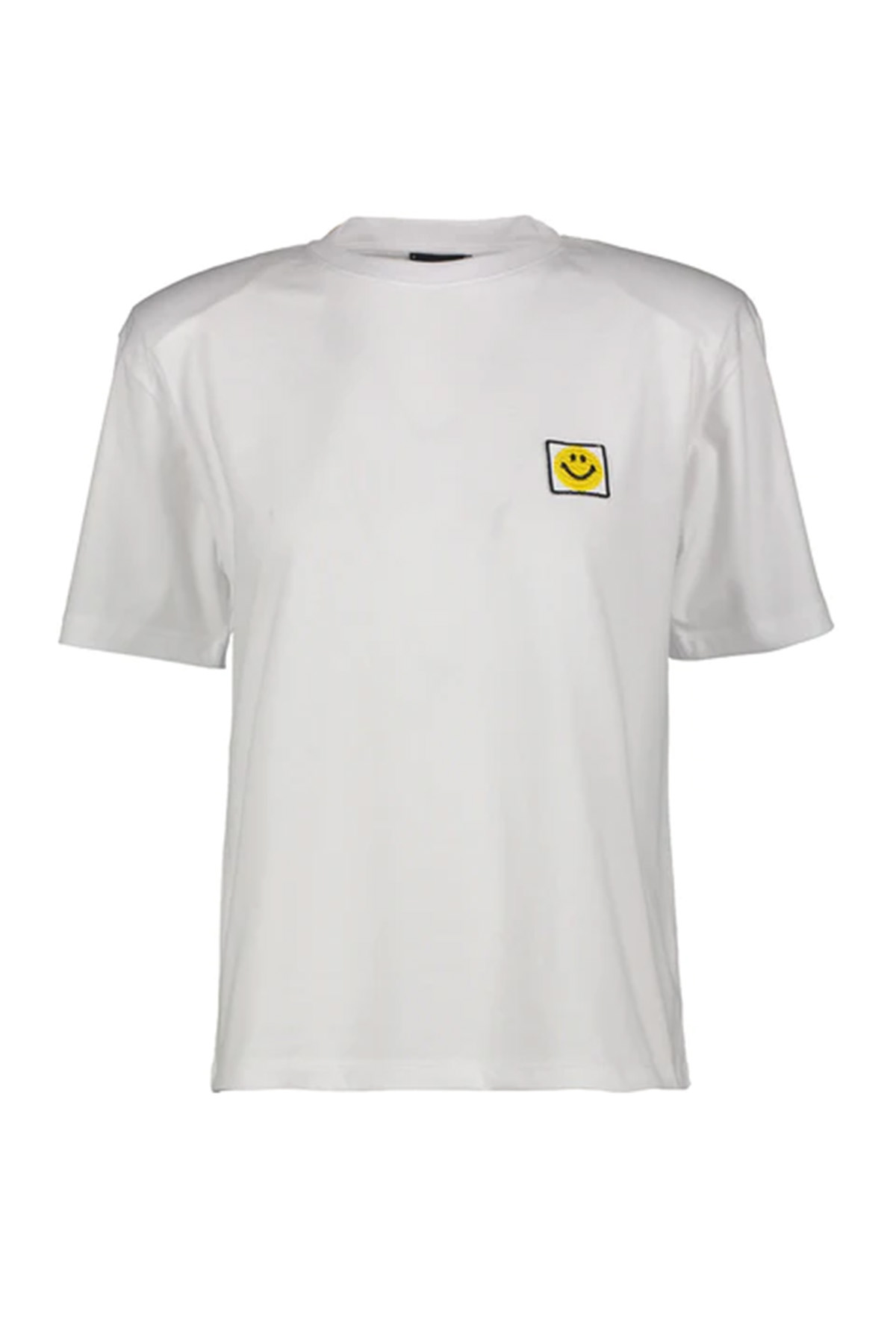 Modèle col rond, manches courtes, bretelles appliquées, ourlet droit. Composition 100% coton Made in Italy