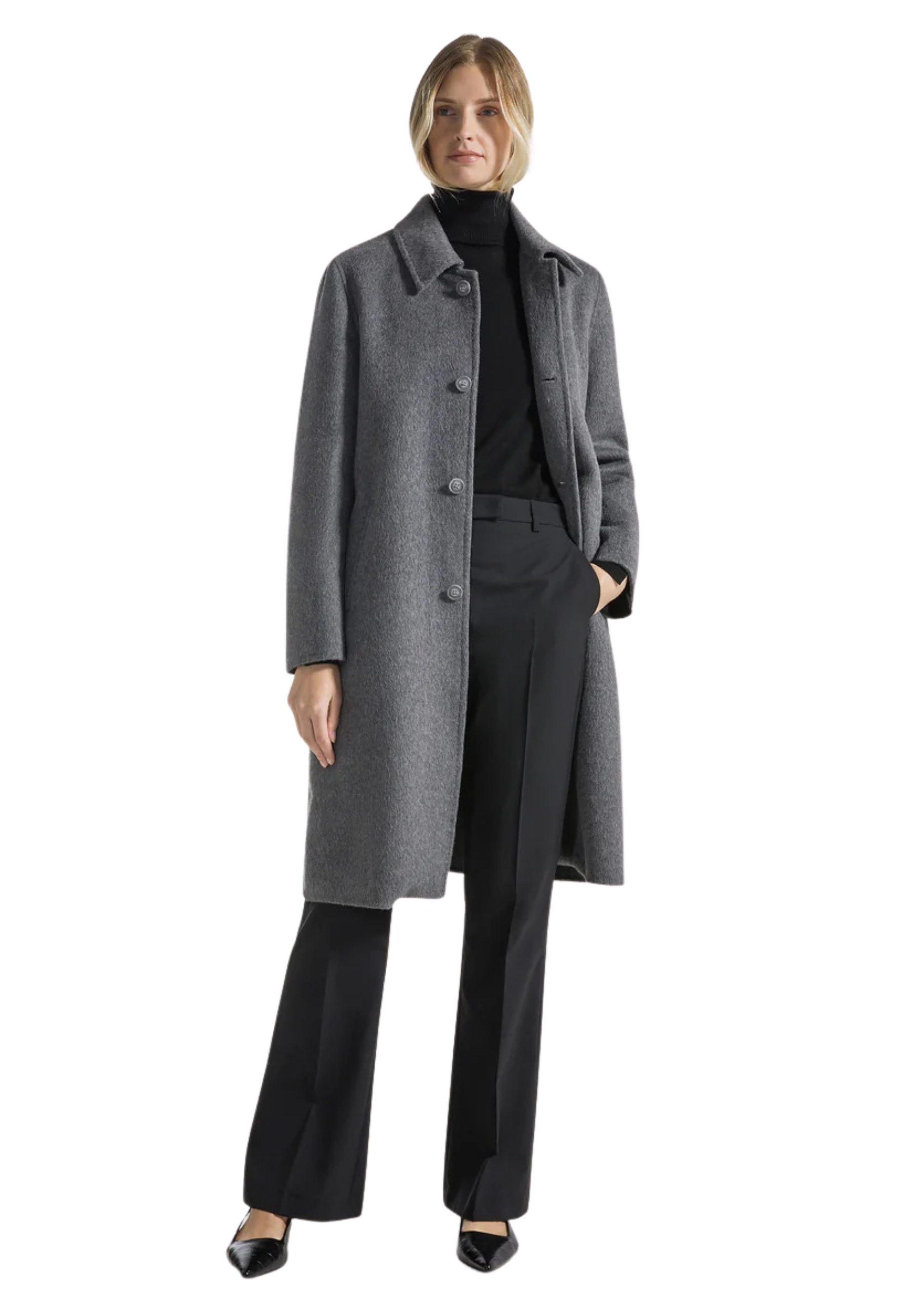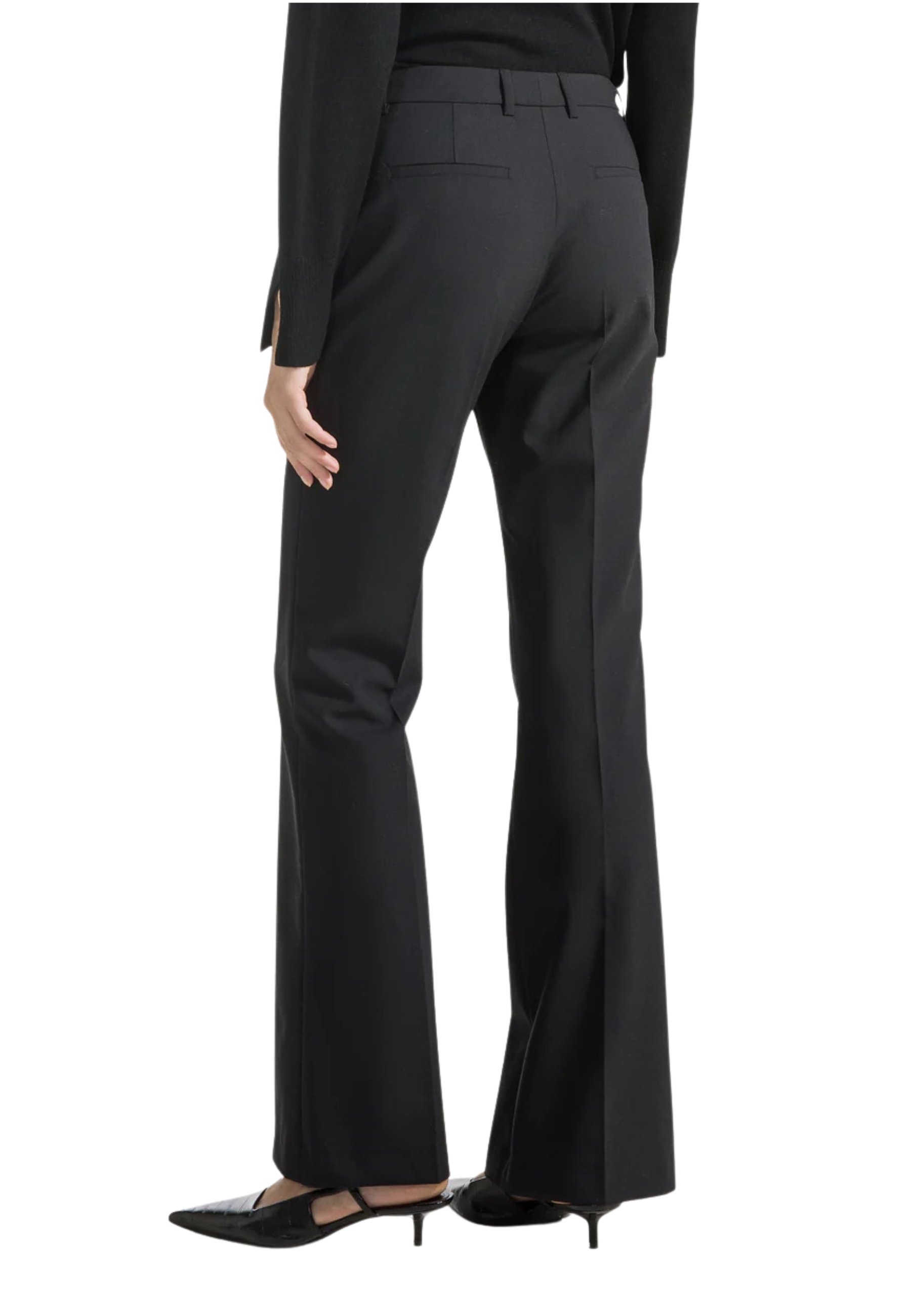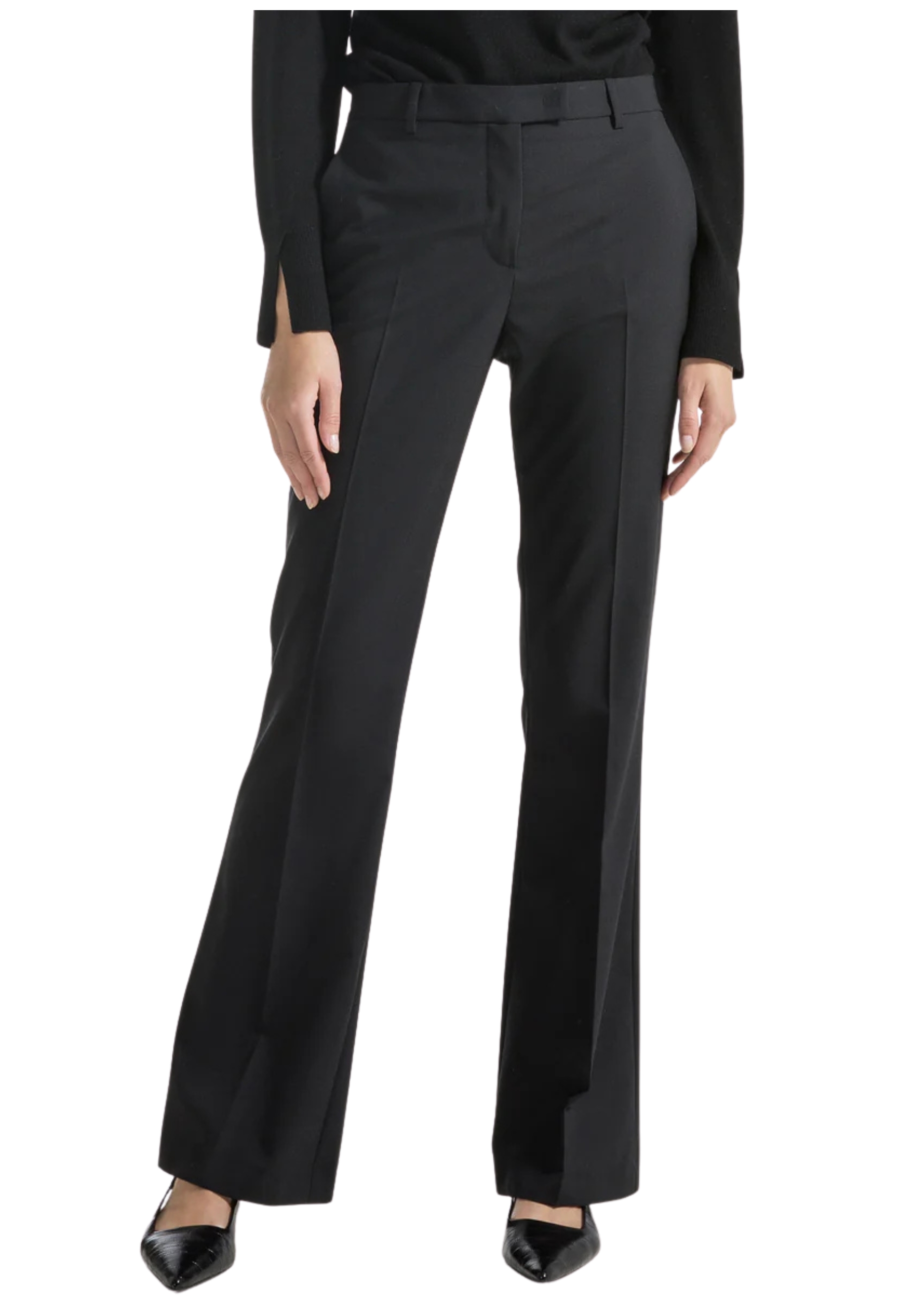 Pantalon longue jambe droite avec inspiration masculine coupé en mélange de laine fraîche. Au milieu. Poches latérales avant et poches en filetage arrière. Fermeture avant avec fermeture éclair et crochets.