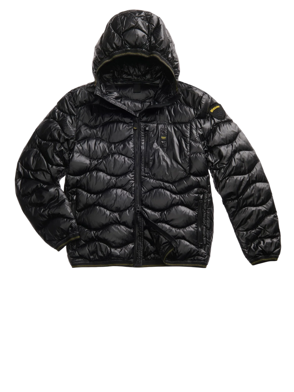 Veste matelassée avec vagues horizontales. Taschina appliqué sur la poitrine à gauche pour donner au vêtement emblématique Blauer une touche plus fonctionnelle. Rembourrage naturel en plumes, chaud et pas volumineux; dédié à ceux qui veulent être toujours à la mode à chaque occasion. Capuche fixe Feuillée en ton Plume rembourrée 90/10 gr.165 Fermeture zippée Couverture cursor sur le cou Poches zippées Poche zippée sur la poitrine Élastique doublée sur le profil de la capuche, le poignet et le bas. Double poches intérieures: ouvert et avec velcro Patch et boucle avec logo
