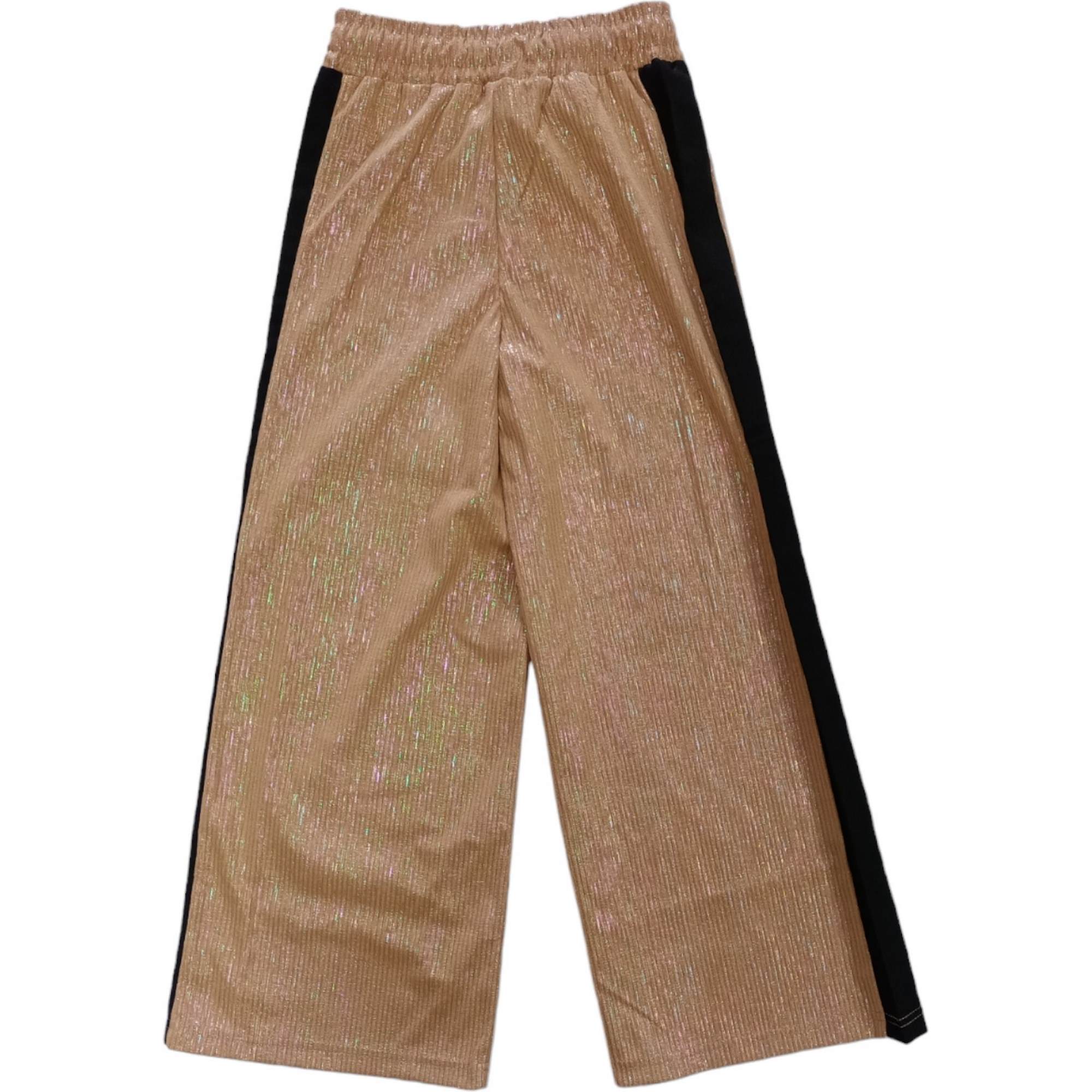 GAELLE Hose in Kamelfarbe mit goldenen Reflexionen und schwarzen Seitenbändern mit weißem Logo seitlich bedruckt.