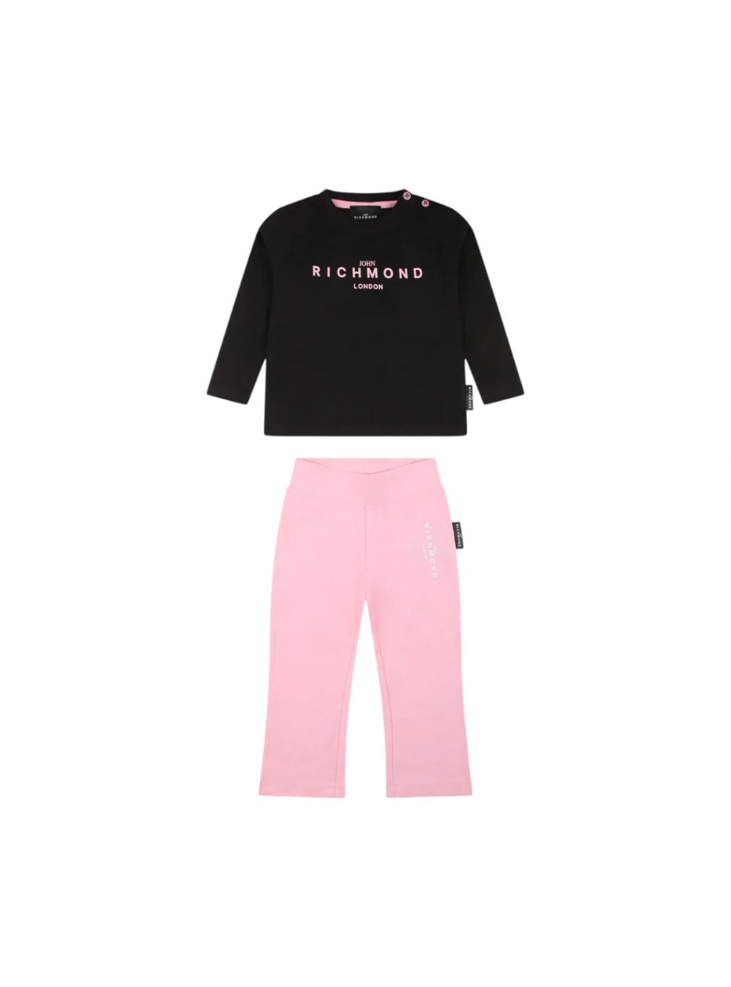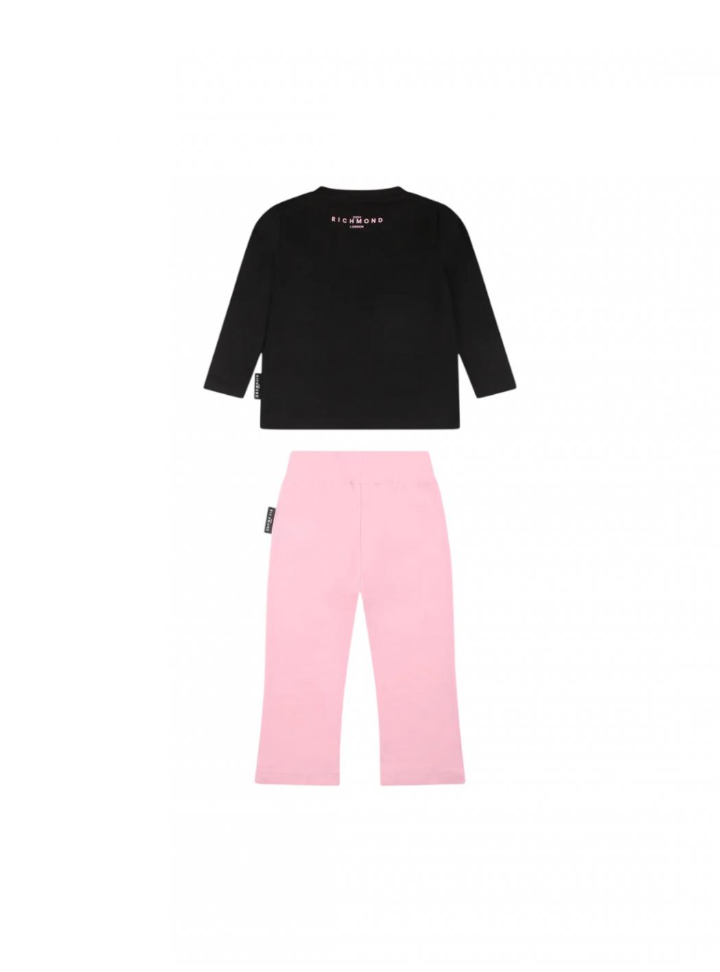 Schwarzer Baumwollanzug, bestehend aus T-Shirts und Leggings. Schwarzes T-Shirt mit langen Ärmeln, mit Rippe Hals und Verschluss mit automatischen Knöpfen auf der Schulter; ist mit rosa Logo auf der Vorderseite und Rückseite verziert. Leggings Rose, mit elastischer Taille; sind mit Logo auf einem Bein und Seiten Patch-Logat verziert.