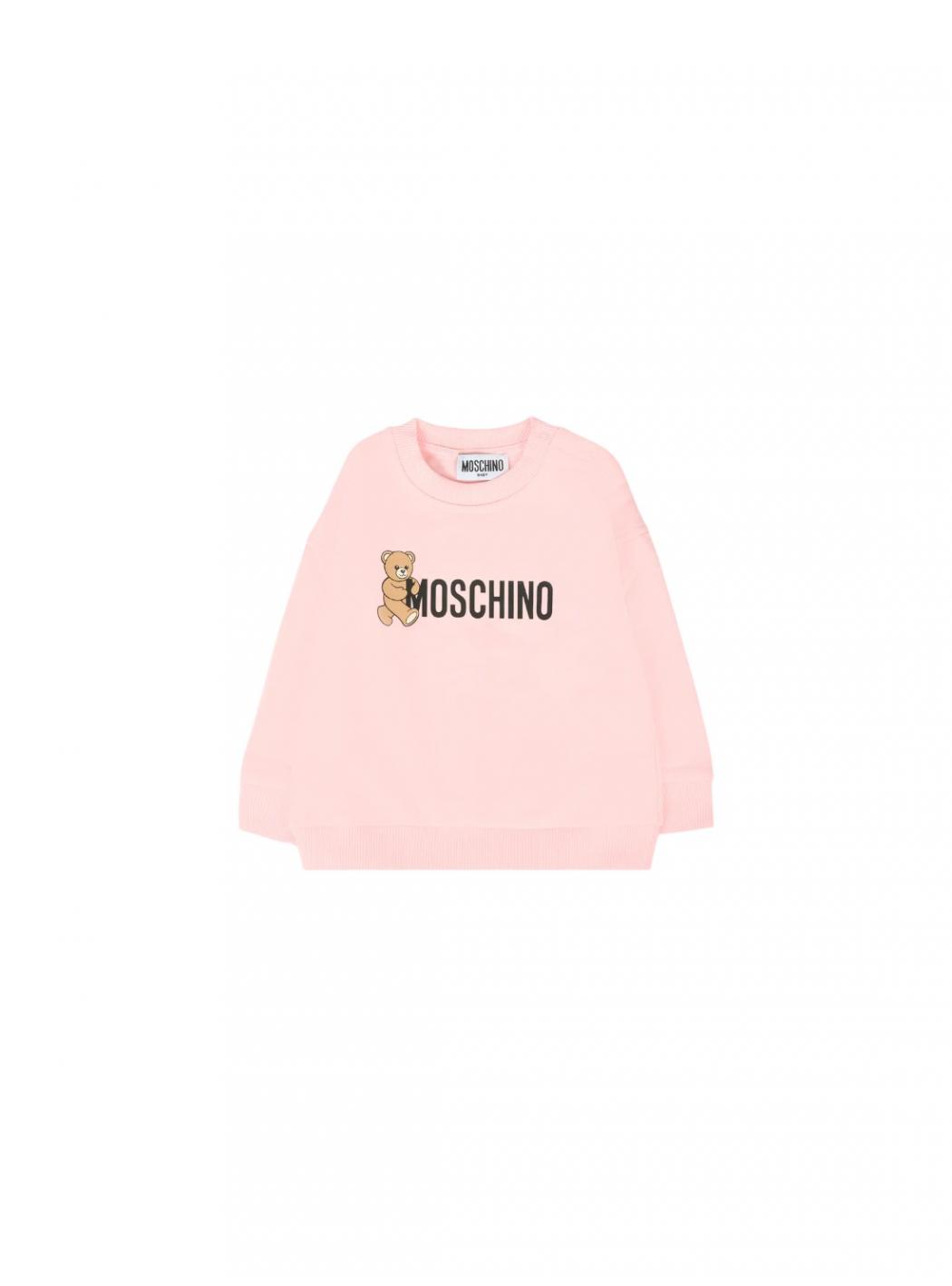 Marke rosa Sweatshirt Moschino Kinder, aus Baumwolle Sweatshirt, mit langen Ärmeln, Crew Hals, Saum und gerippten Manschetten und Verschluss mit automatischen Knöpfen auf der Schulter. Es ist mit Logo und Teddy Bear auf der Vorderseite verziert.