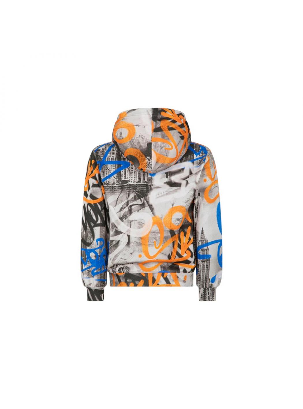 Winter-Sweatshirt mit digitalem All-over-Print und Kontrasthaube. Iconischer Seidendruck auf der Vorderseite.