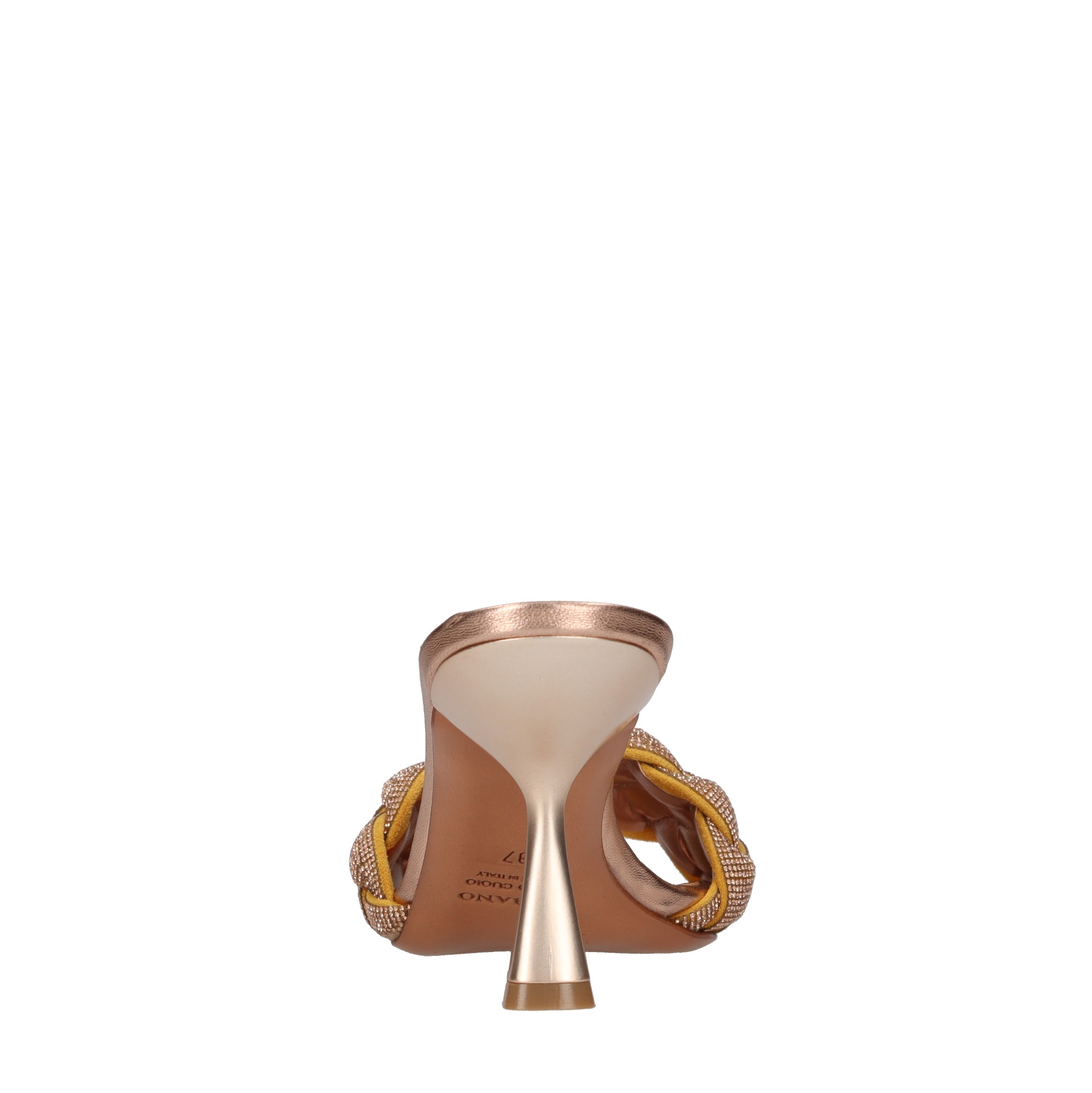 Strass-Pantoletten. Obermaterial aus Leder und Öko-Leder. Außensohle aus Leder. Roségoldene Farbe. Bei Nummer 37 kleine Flecken auf dem Leder. Fragen Sie nach Informationen.
