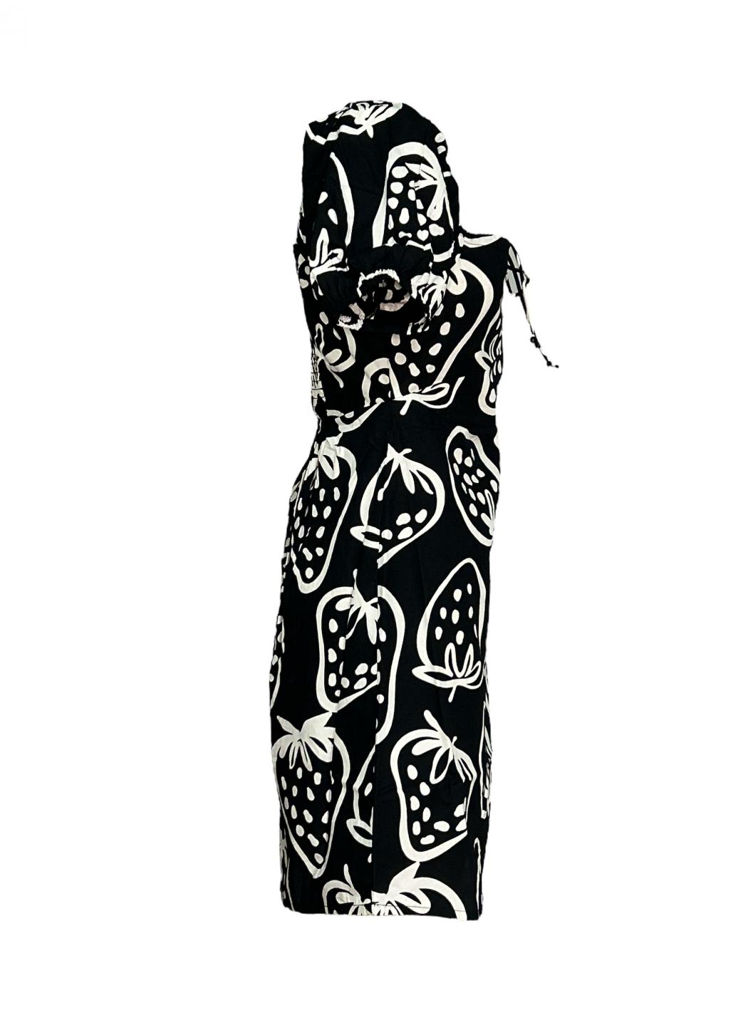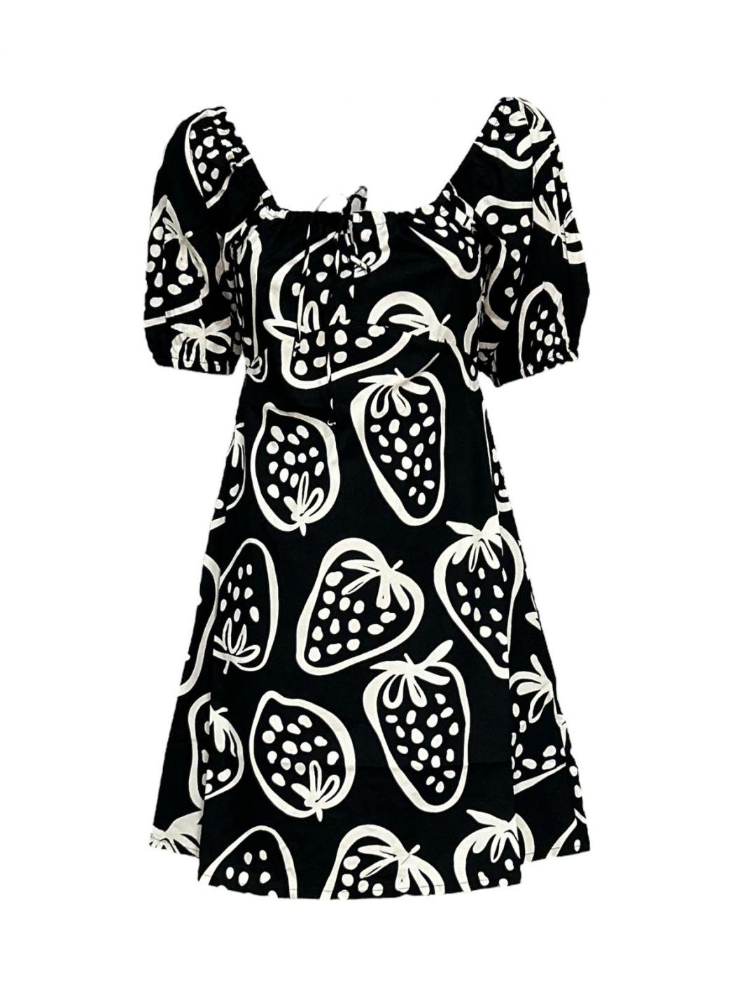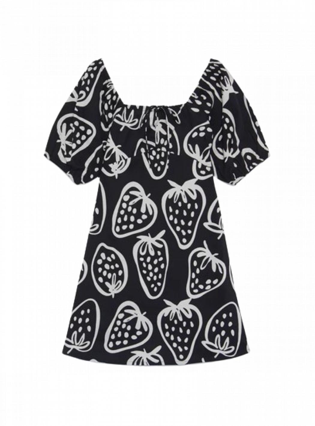 Kurzes Kleid aus Baumwolle mit schwarzem Erdbeerdruck. Mit quadratischem Ausschnitt und kurzen Ärmeln in elastisch. Vorhang gerollt auf der Brust mit geknüpften Bändern. Honeycomb zurück. Verschraubtes Muster und leicht gefackte Rock.