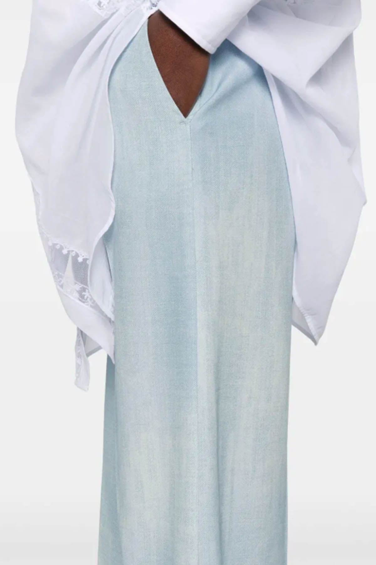 Modell mit seitlichem Reißverschluss, zwei schräge Seitentaschen, Taille mit Gürtelschlaufen, Details mit Stiften, langes Design. Viskosezusammensetzung 100% Made in Italy