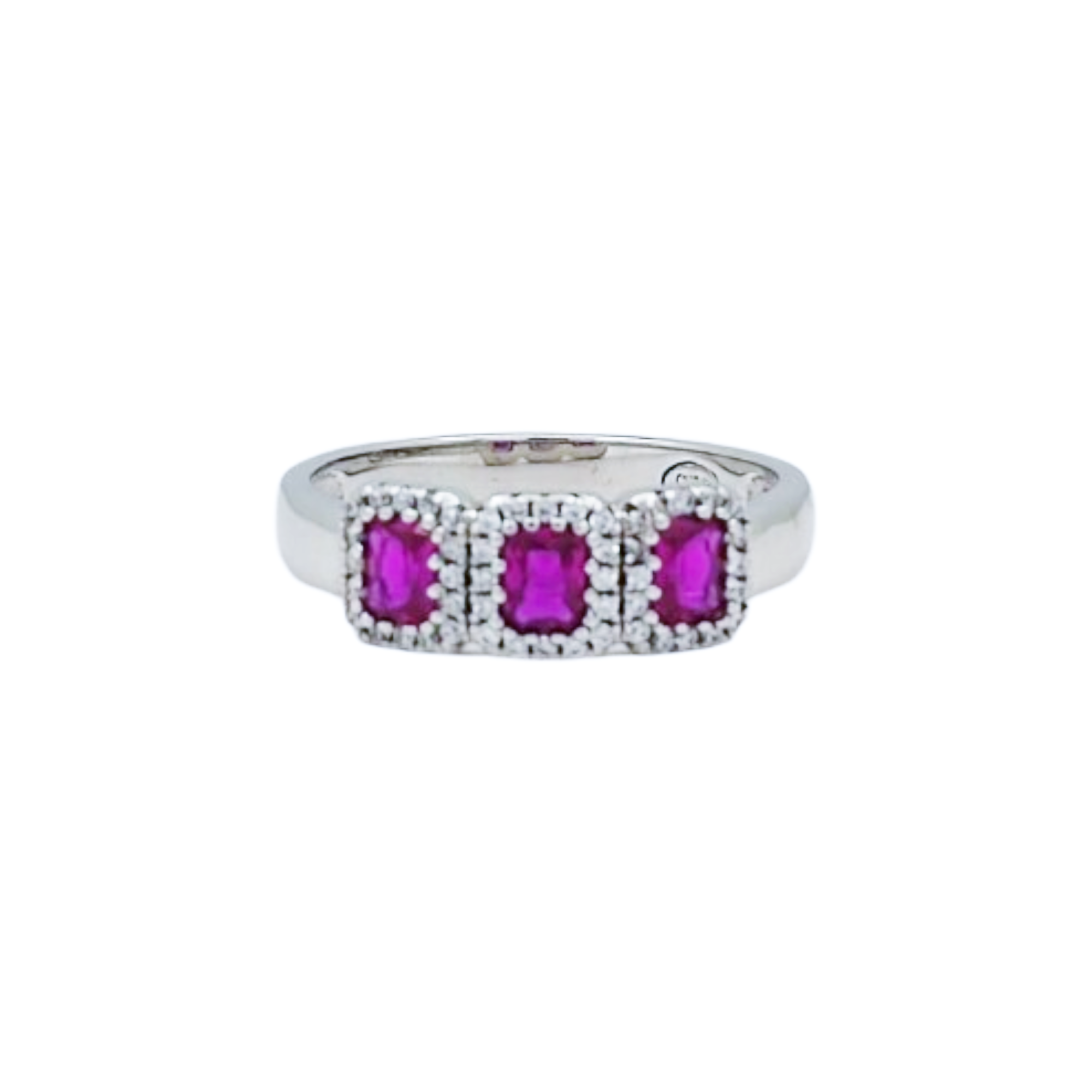 925 Silber Ring Modell mit drei weißen Zirkonia Und der Magenta Platz