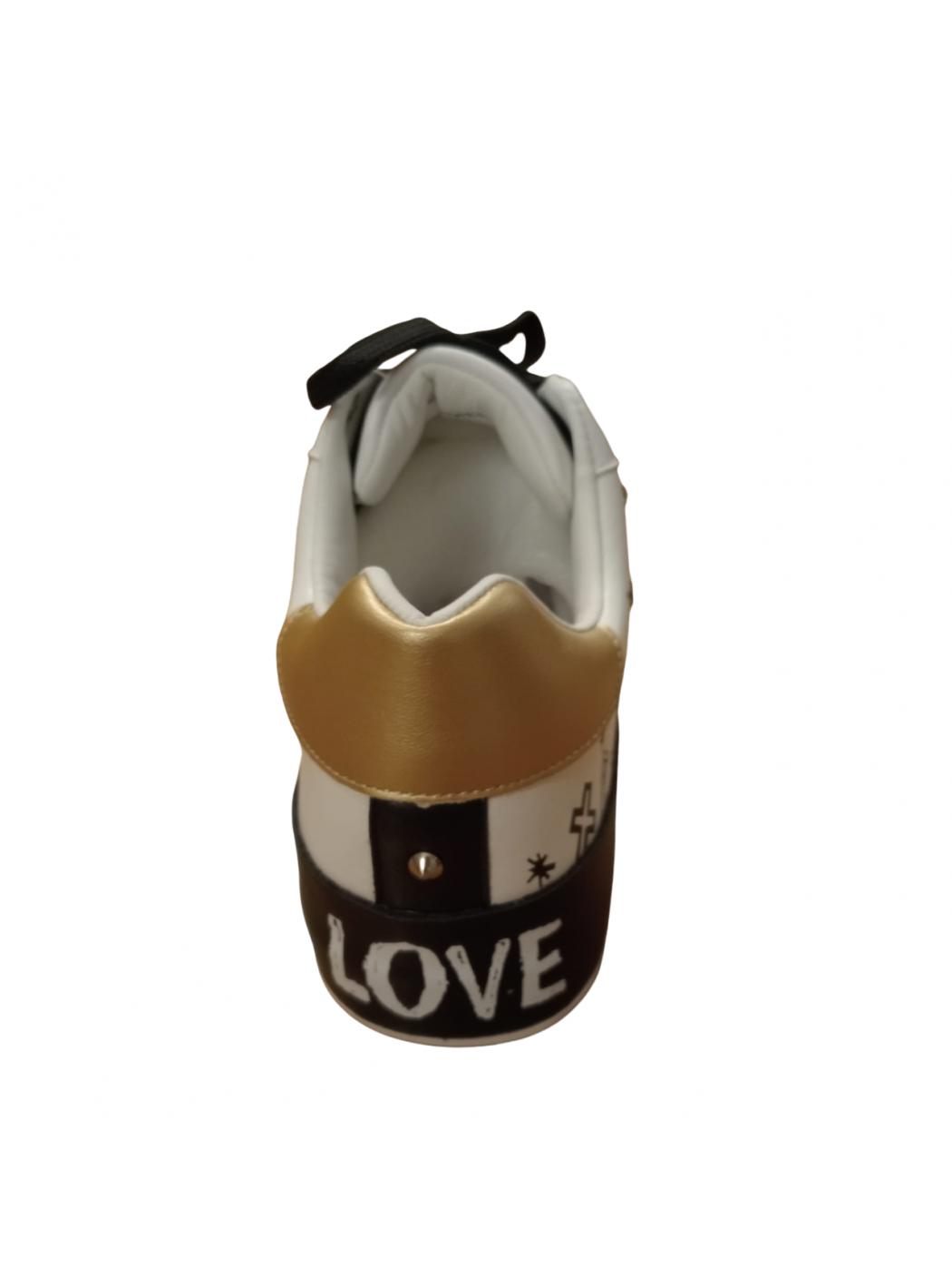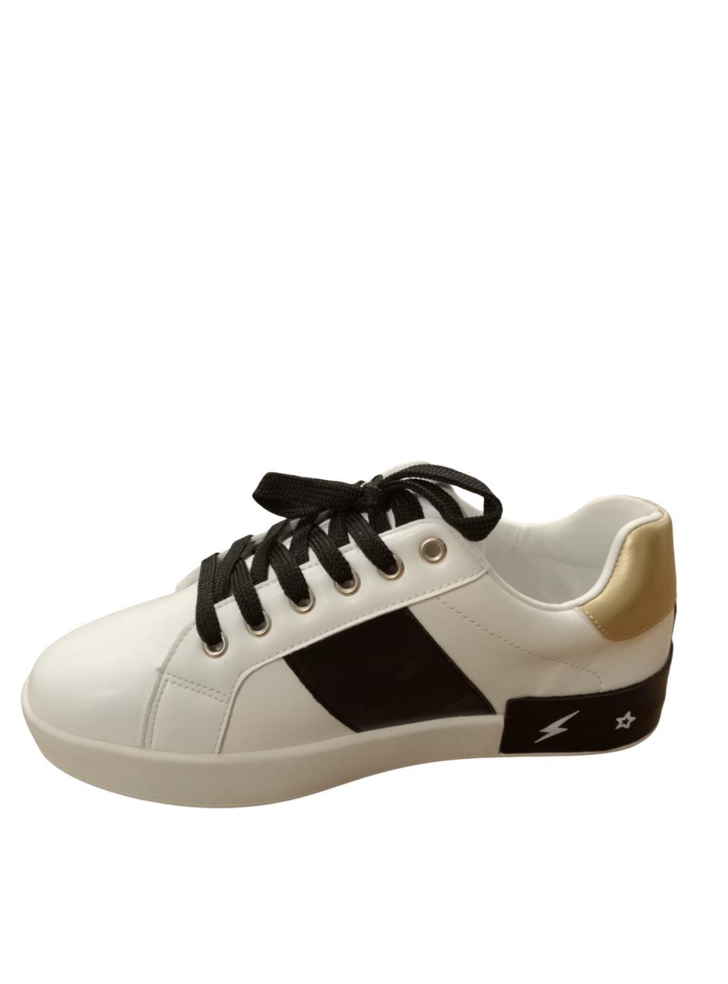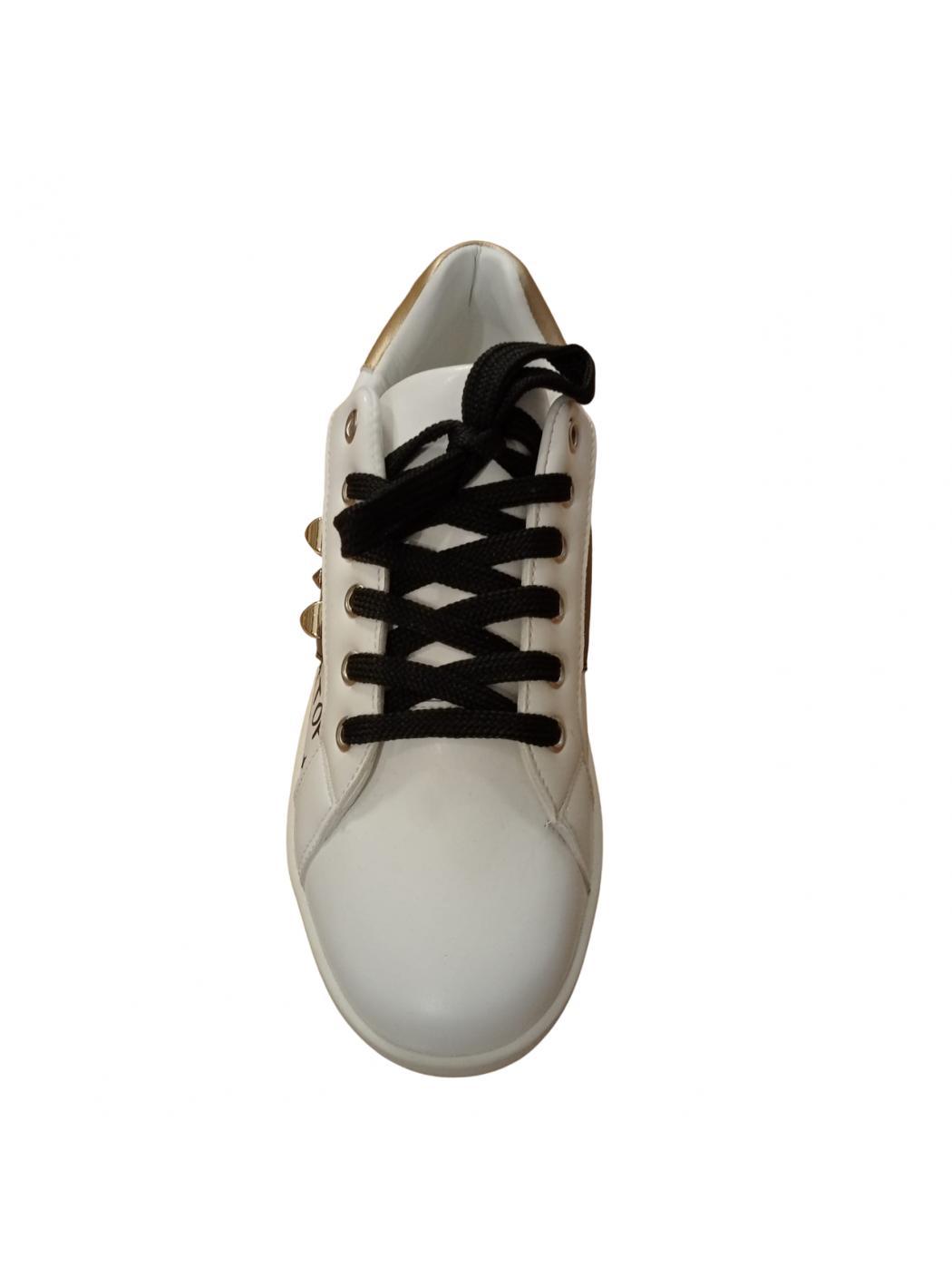 Niedrige weiße Frauen Gio Cellini Immer aktuell und trendig, Turnschuhe Gio Cellini Geben Sie Ihren Outfits Persönlichkeit. Dieses Modell der Sneakers hat Gummiboden und Oberteil im Öko-Look mit dekorativen Prints und goldenen Stollen. Schließung mit schwarzen Spitzen.