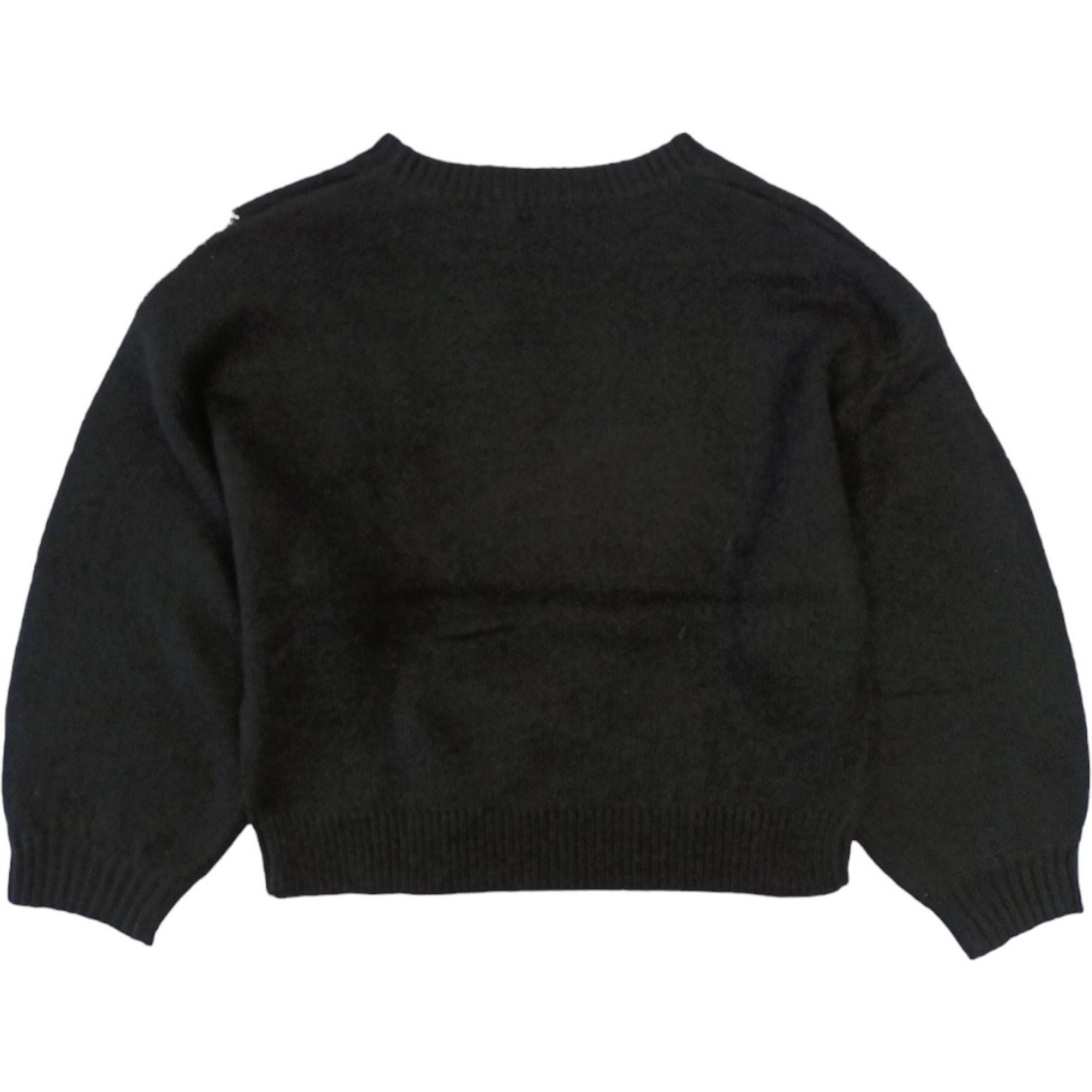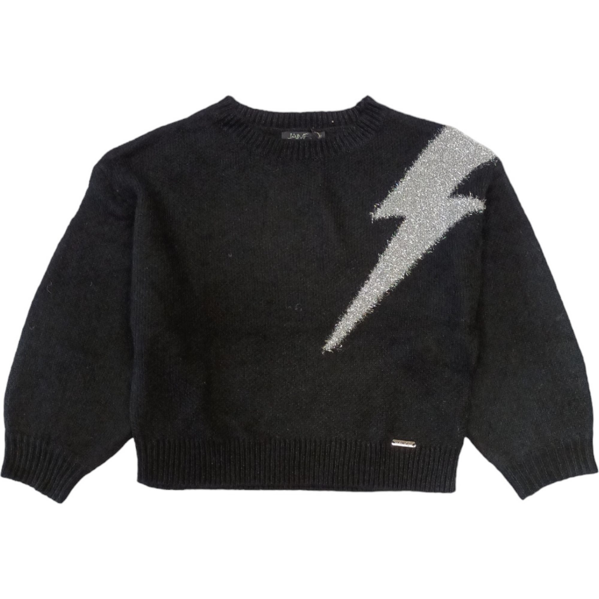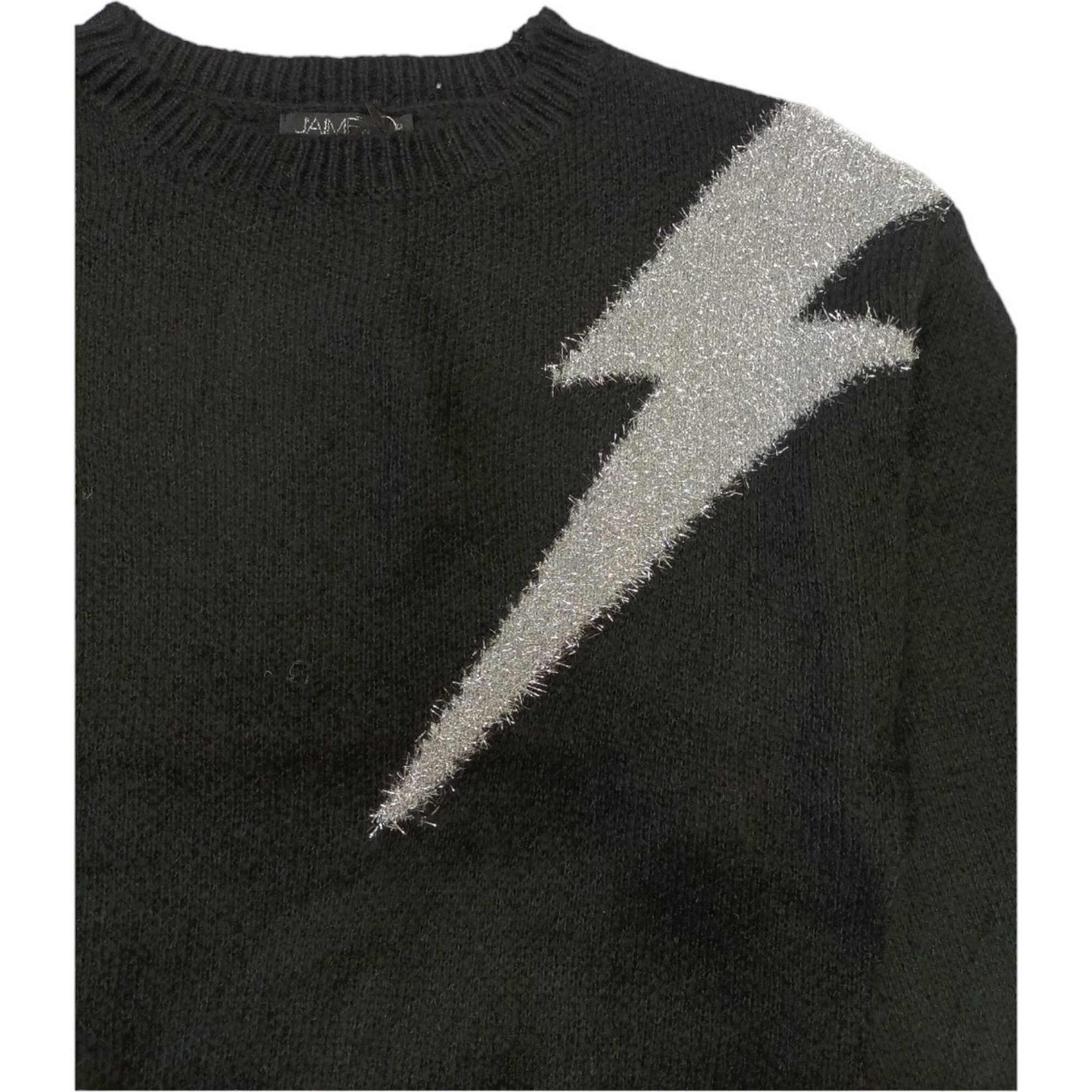 Schwarzer Pullover, kurzes Modell mit silbernem Blitz auf der Vorderseite.