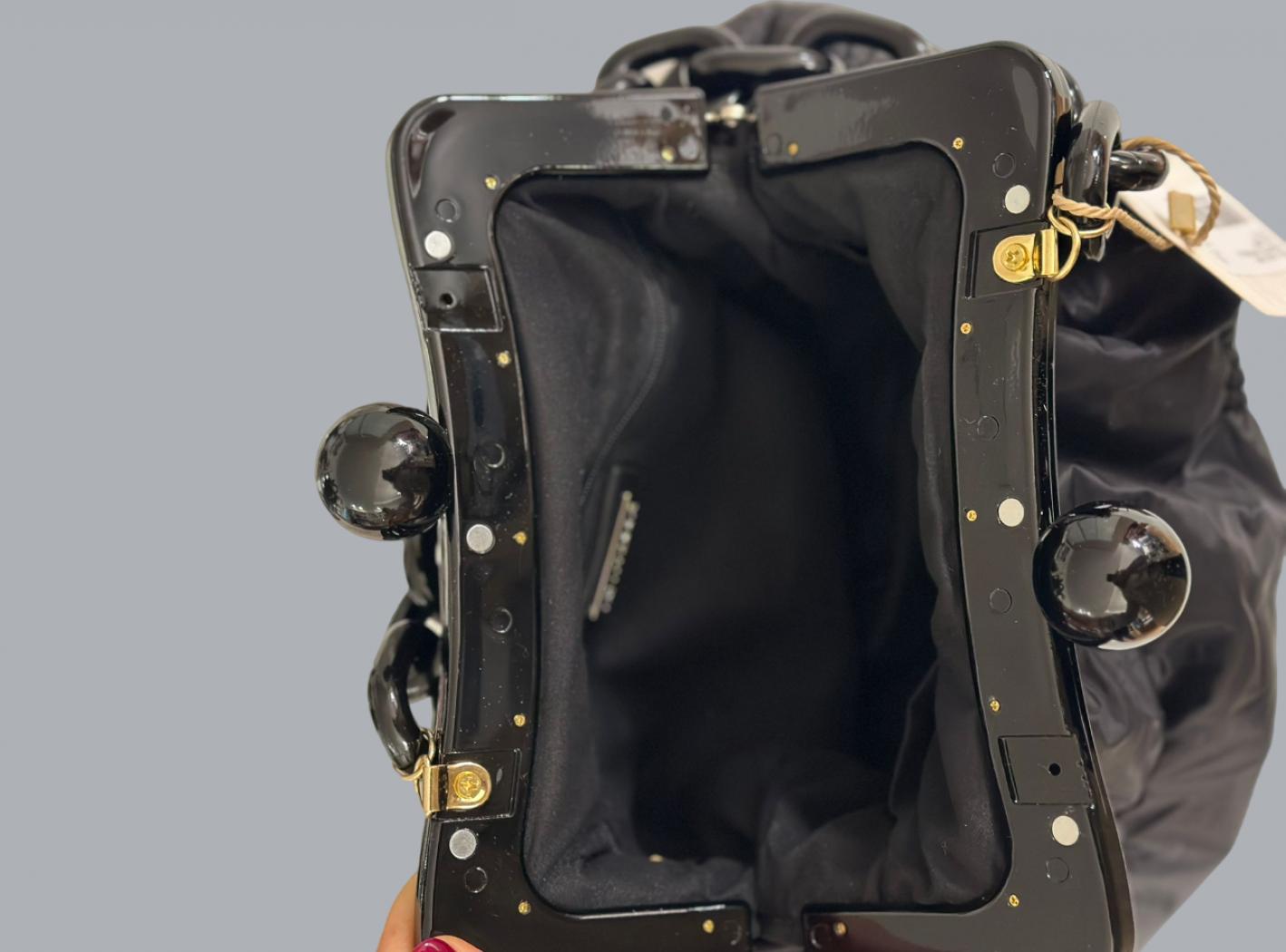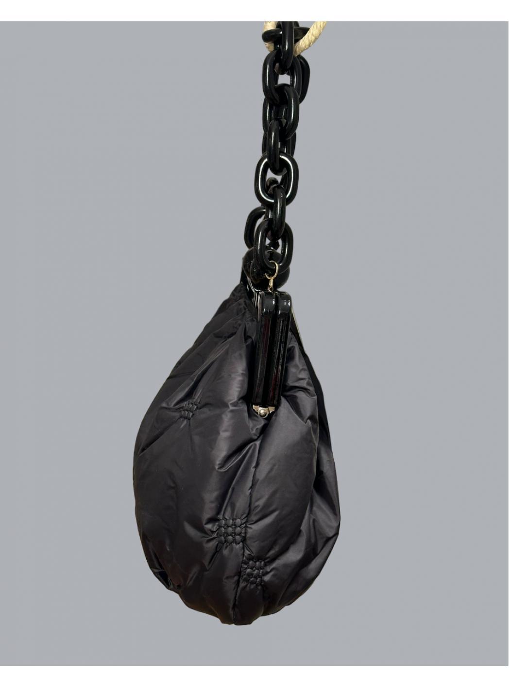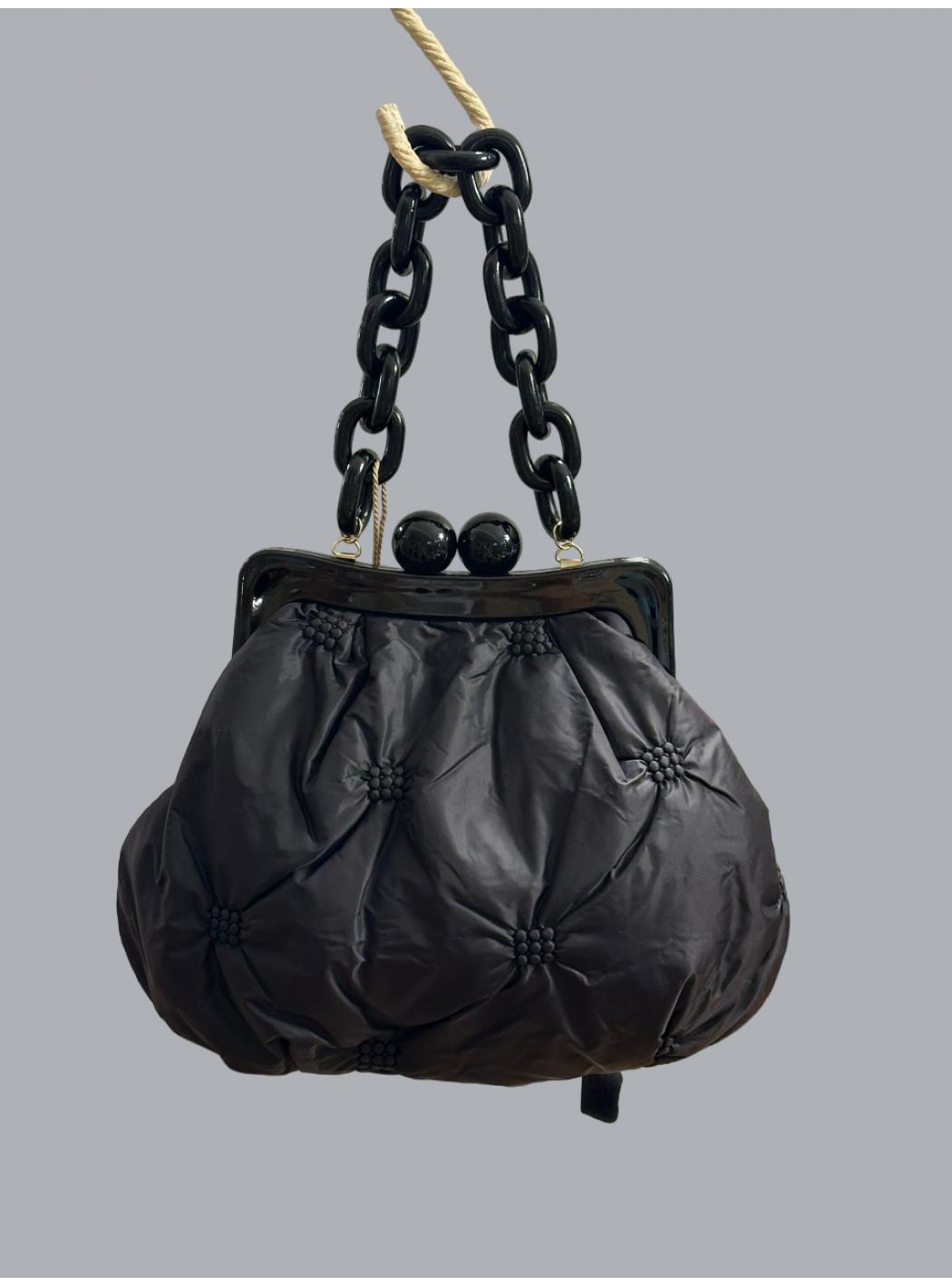 Schwarze gefederte Tasche mit Harz Kussverschluss, mit Kette in Harz, um von Hand zu tragen. Innenausstattung mit zwei Taschen, von denen eine mit Reißverschluss.