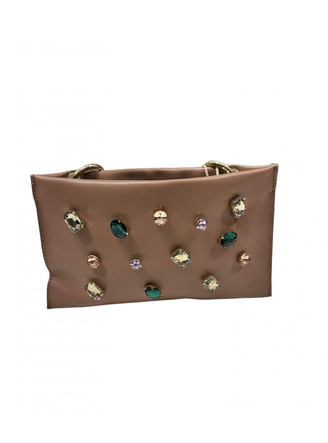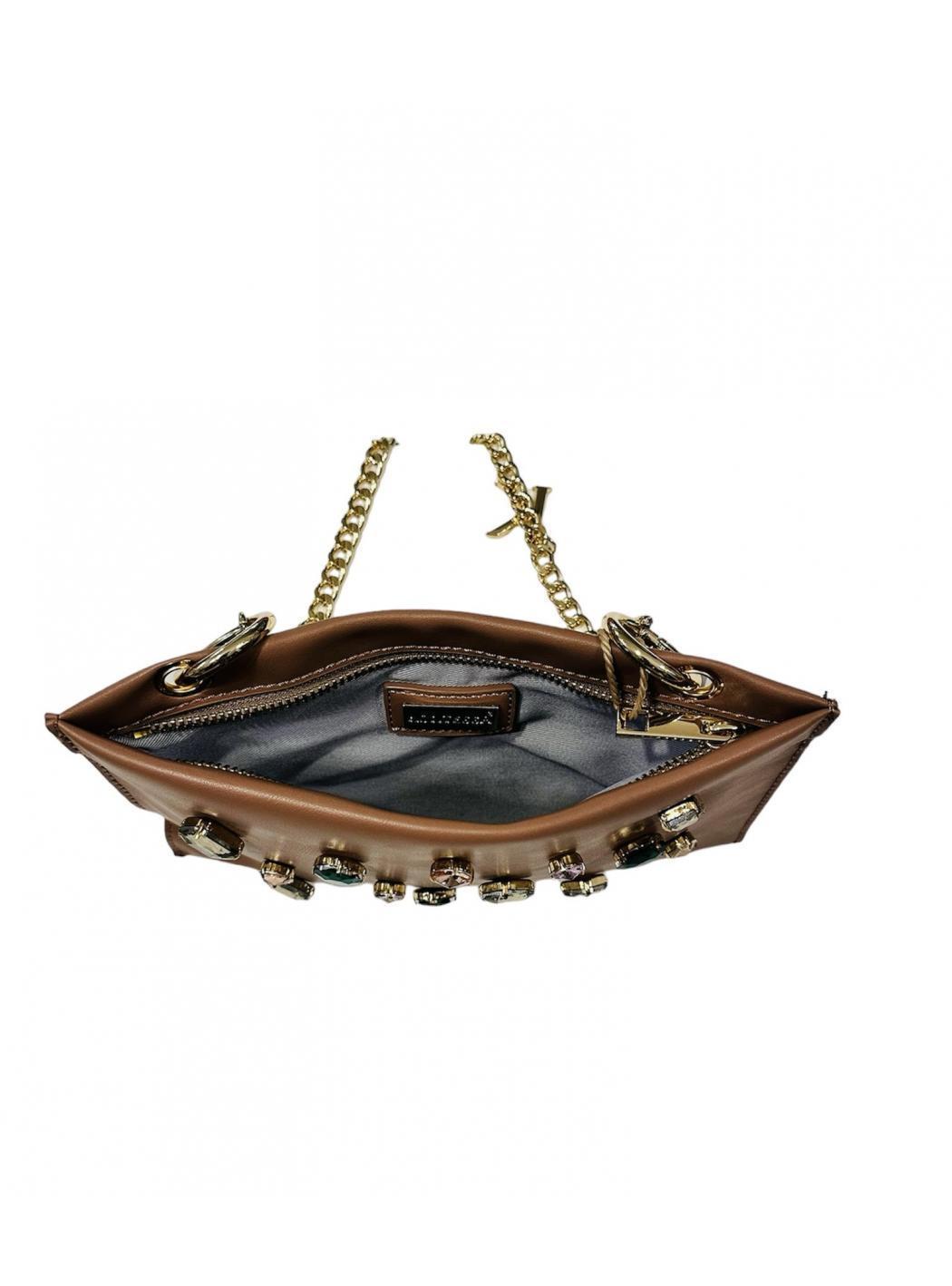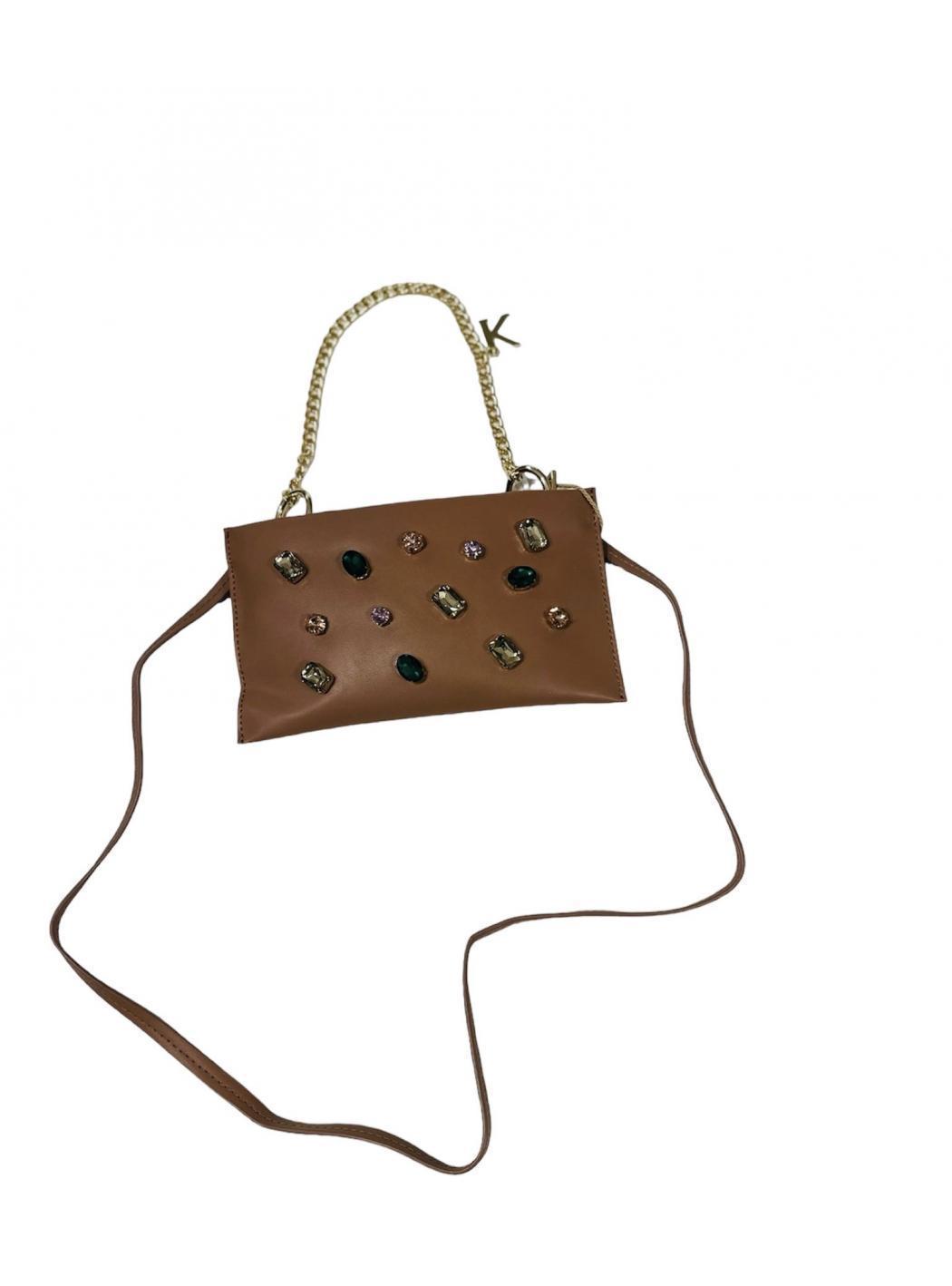 Minitasche aus Öko-Leder mit Reißverschluss mit goldener kurzer Kette und Schulterriemen. Vor den Felsen. Innen gefüttert 100% Polyester.