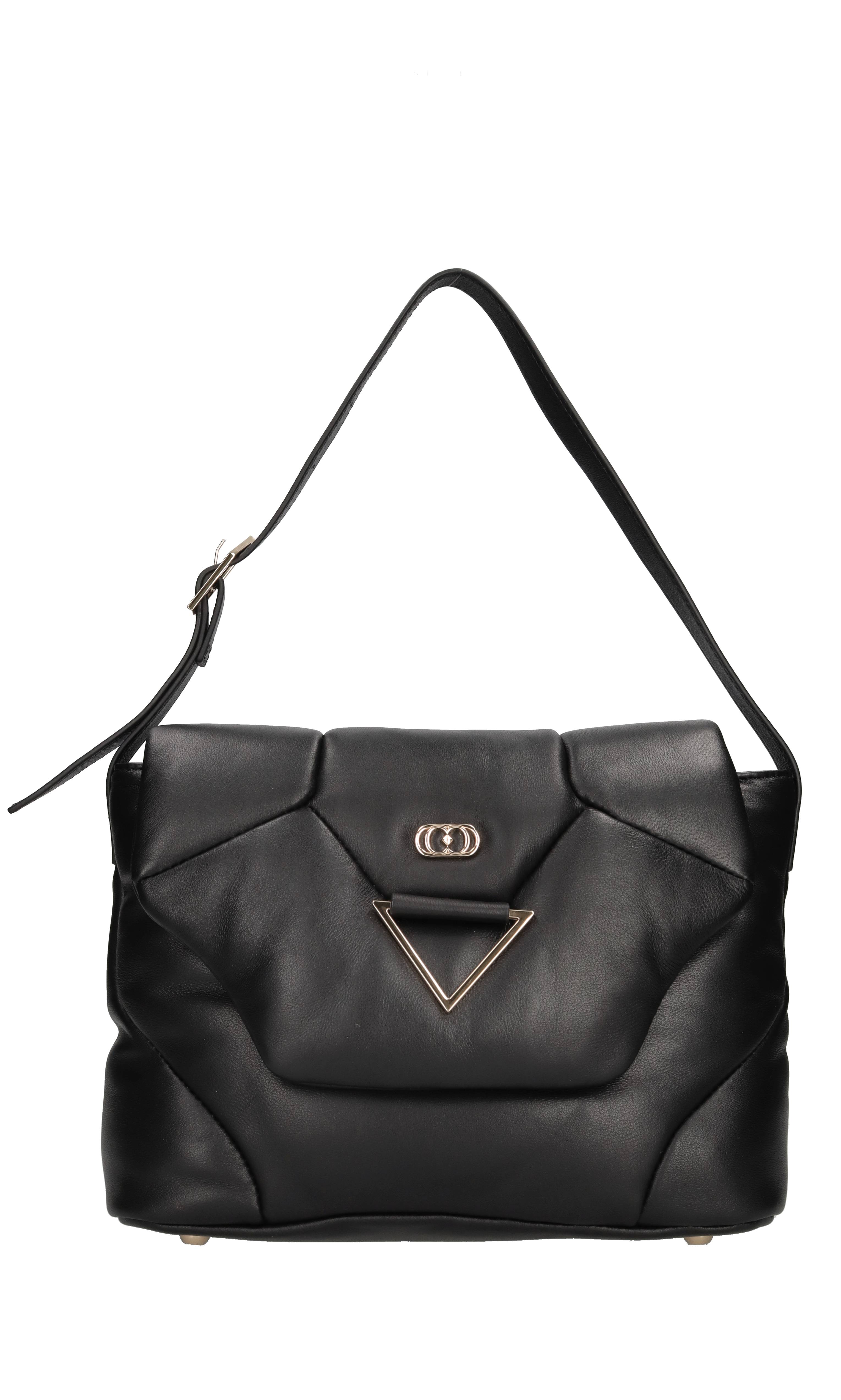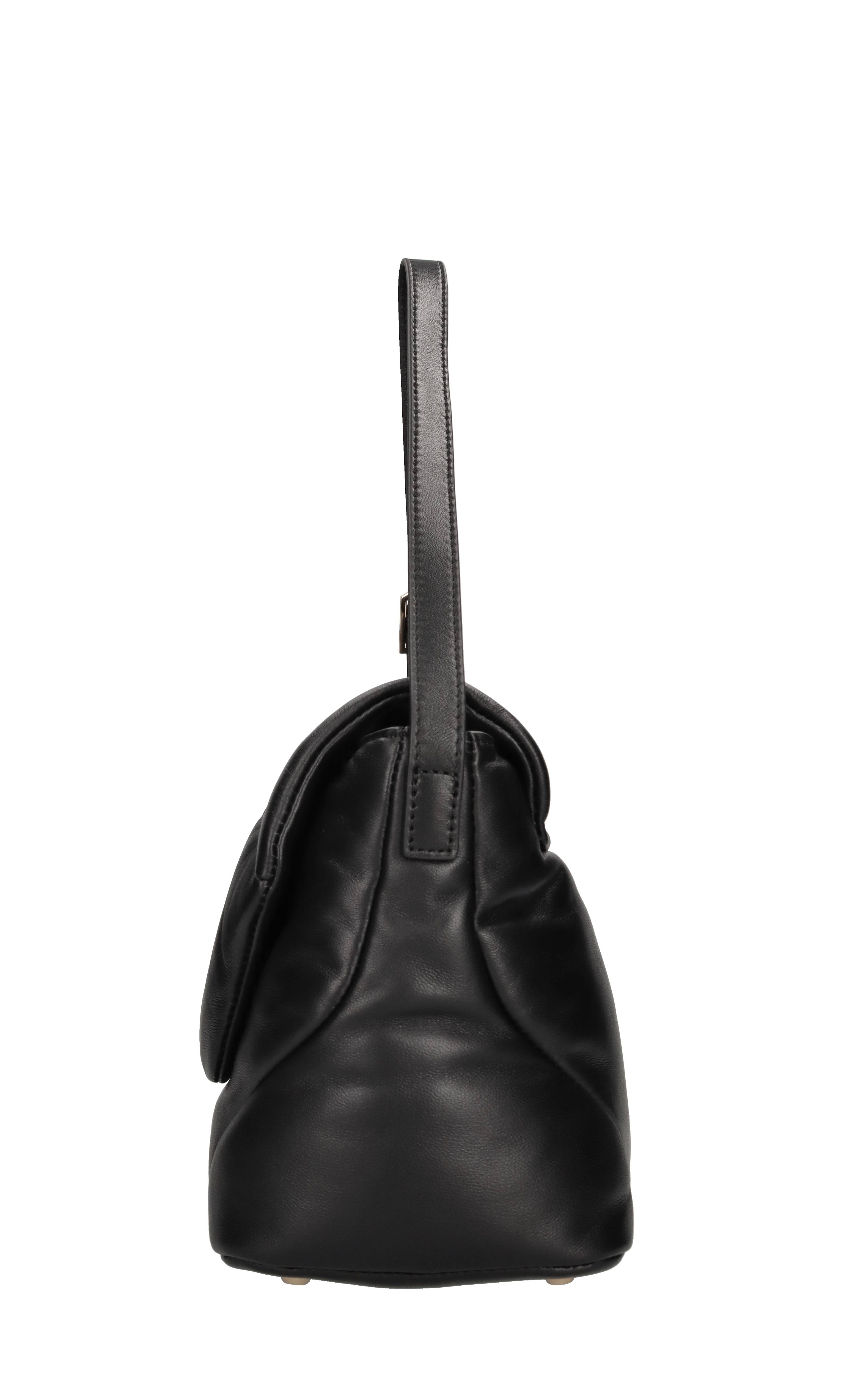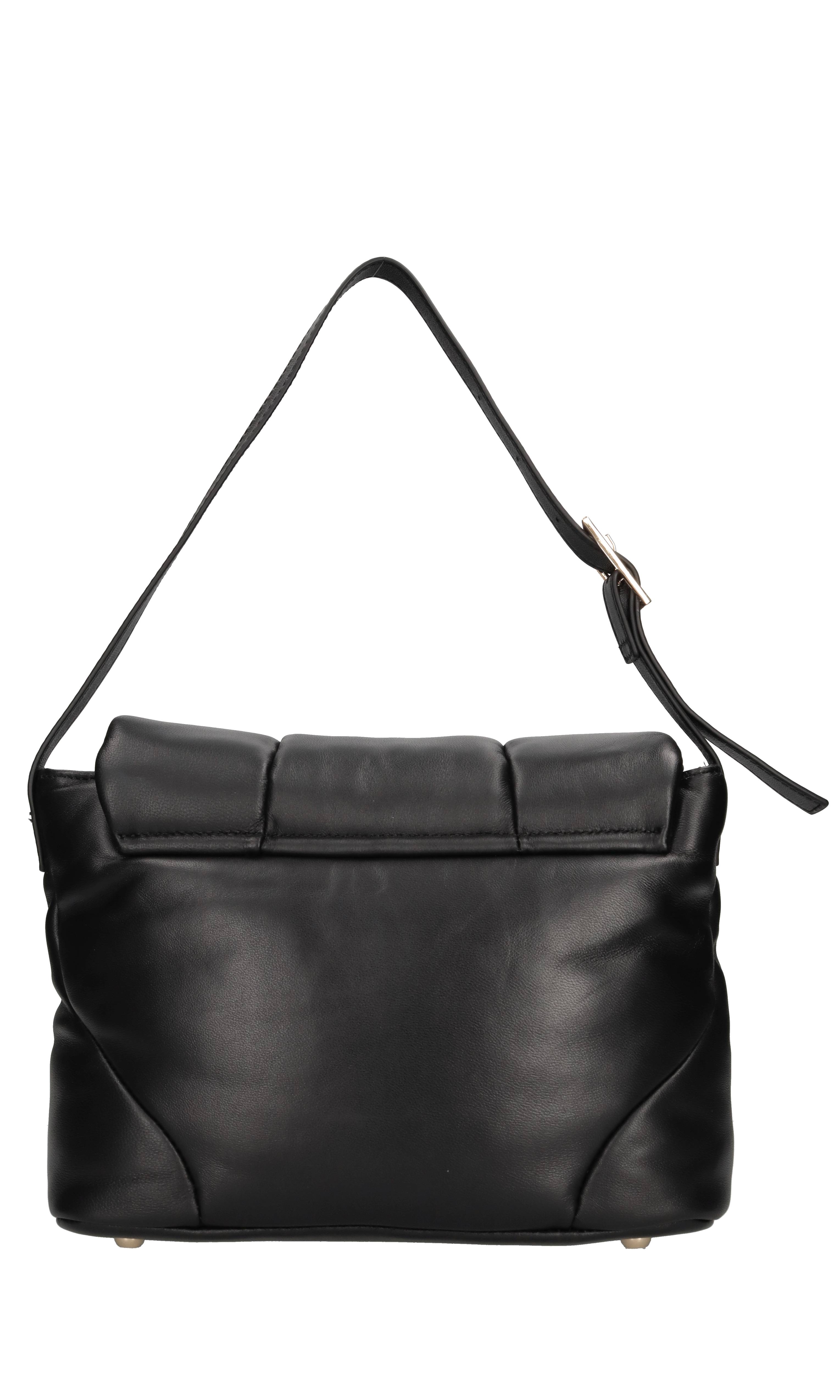 Gesteppte Ledertasche. Ein Kompartiment. Schließung mit Klappe und Magnetknopf. Verstellbarer Lederarmband. Gold Farbe Detail.