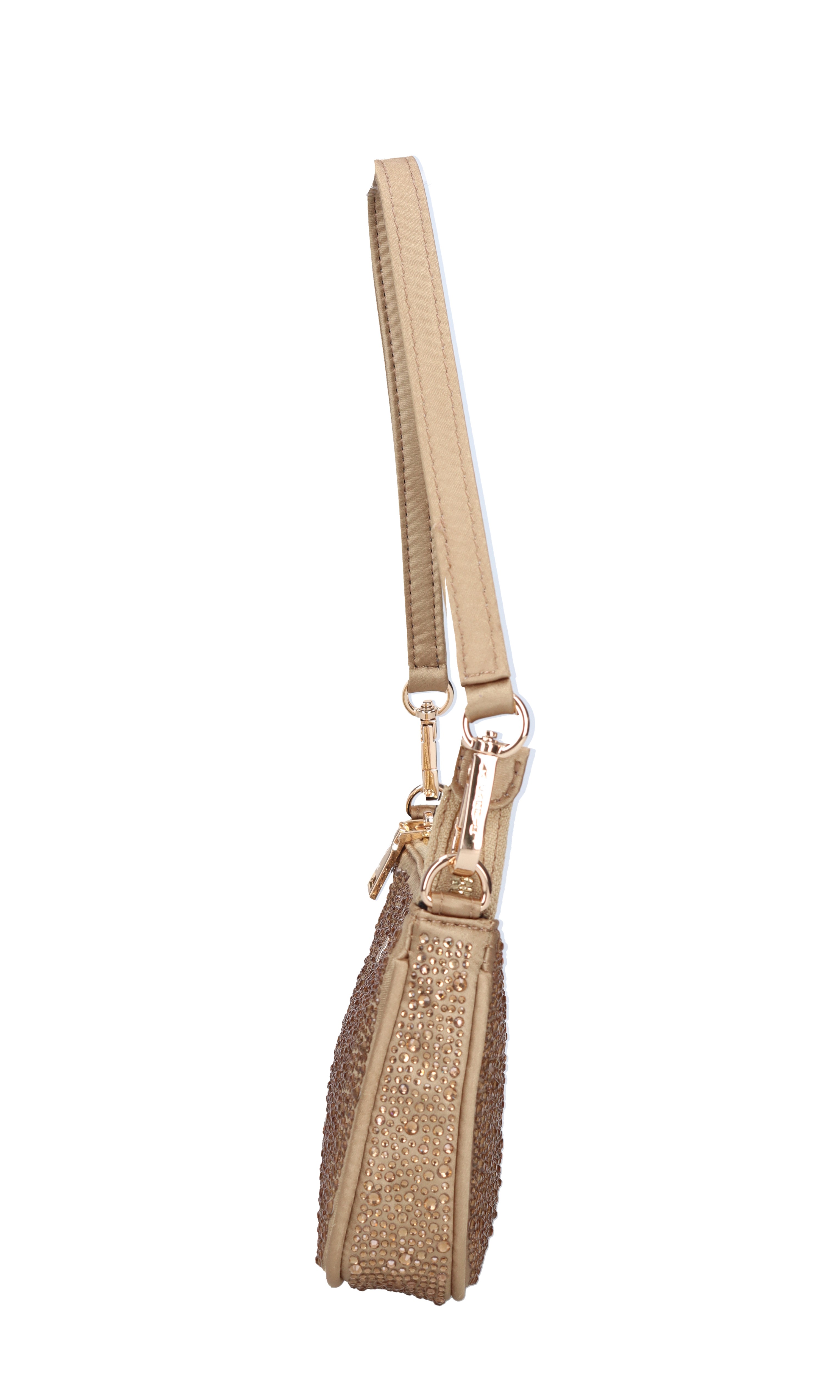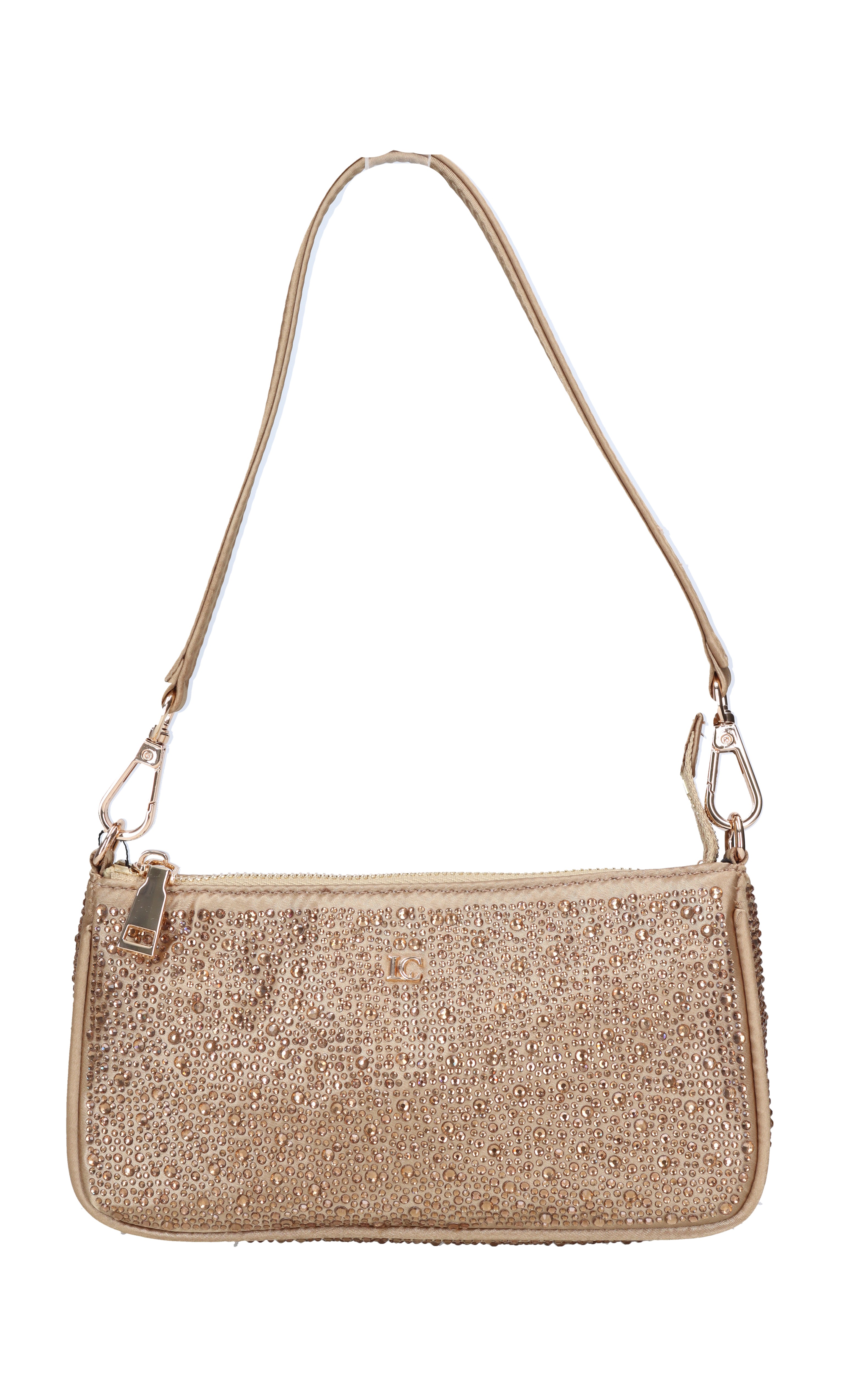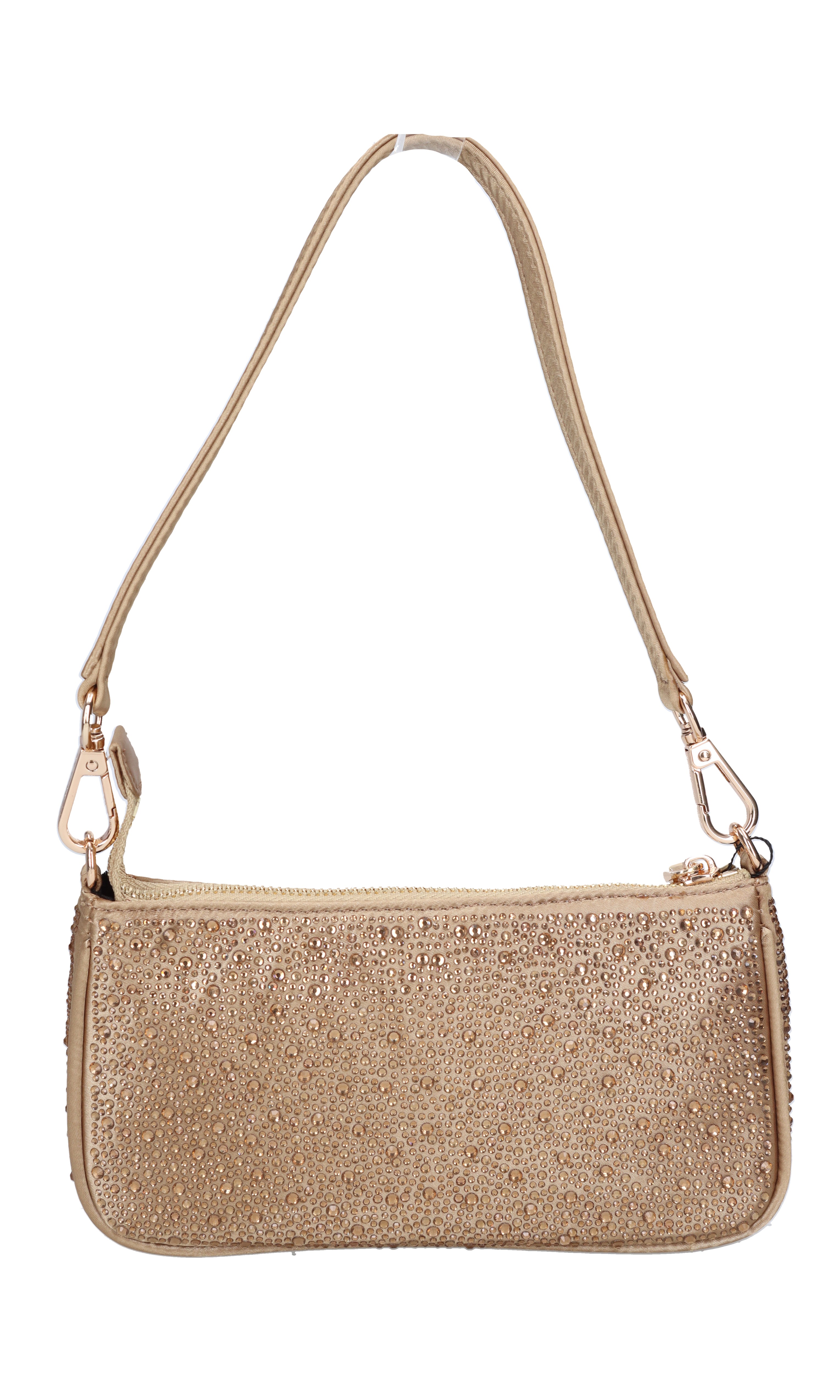 Tasche aus Öko-Leder und Strasssteinen. Reißverschluss. 1 Fach. Abnehmbarer Schultergurt.