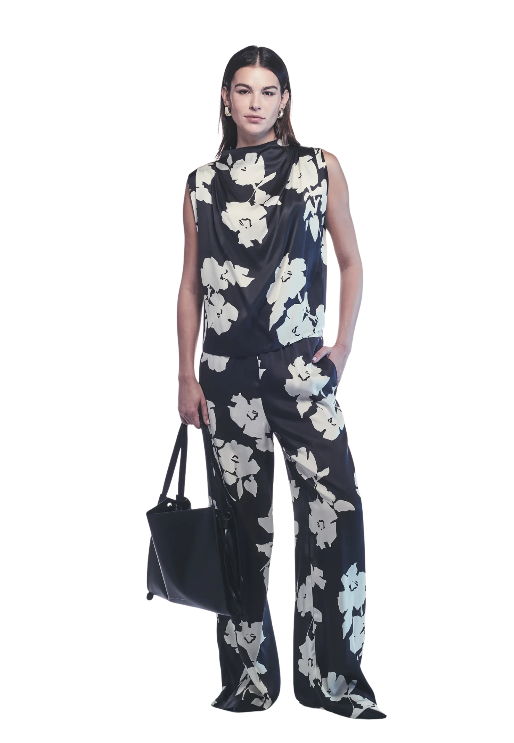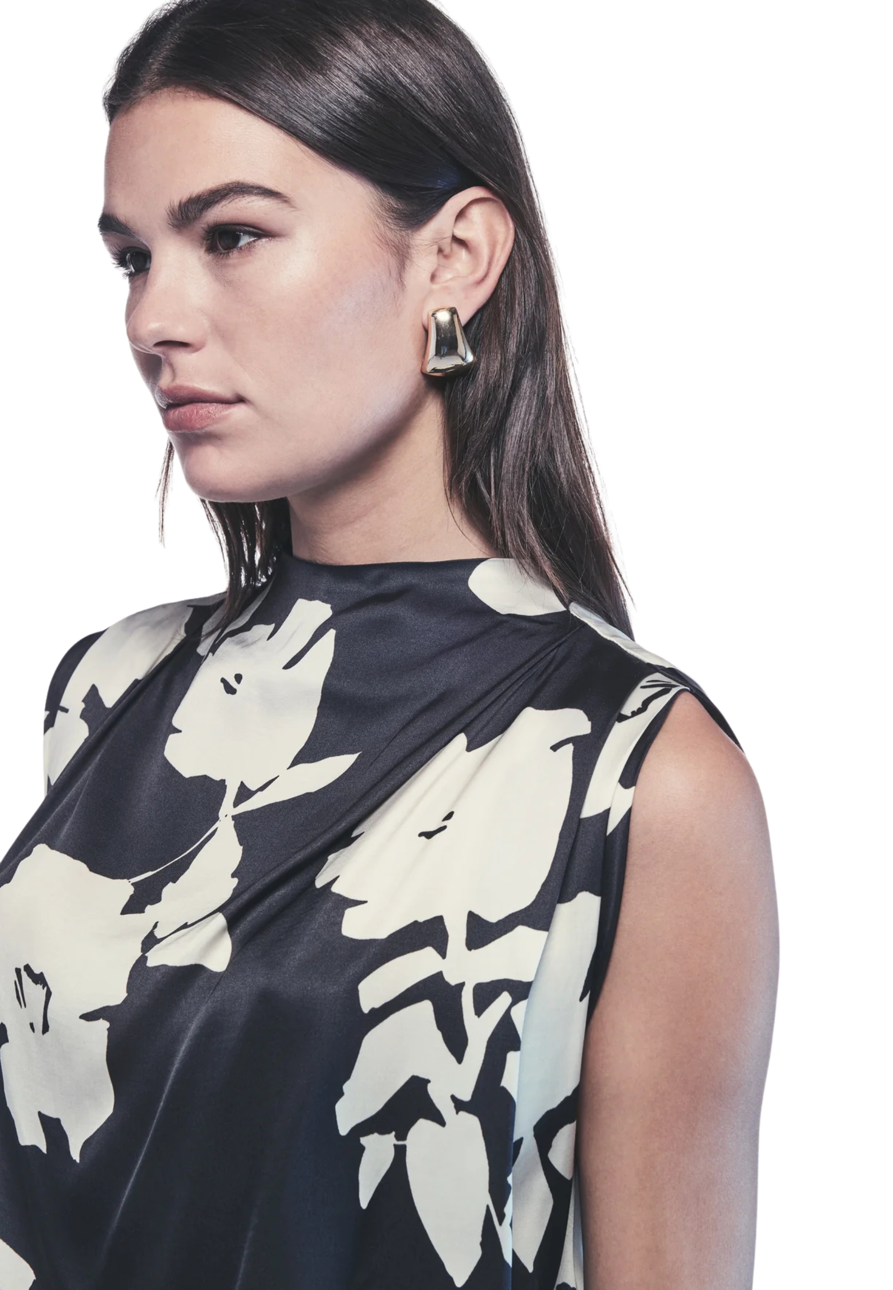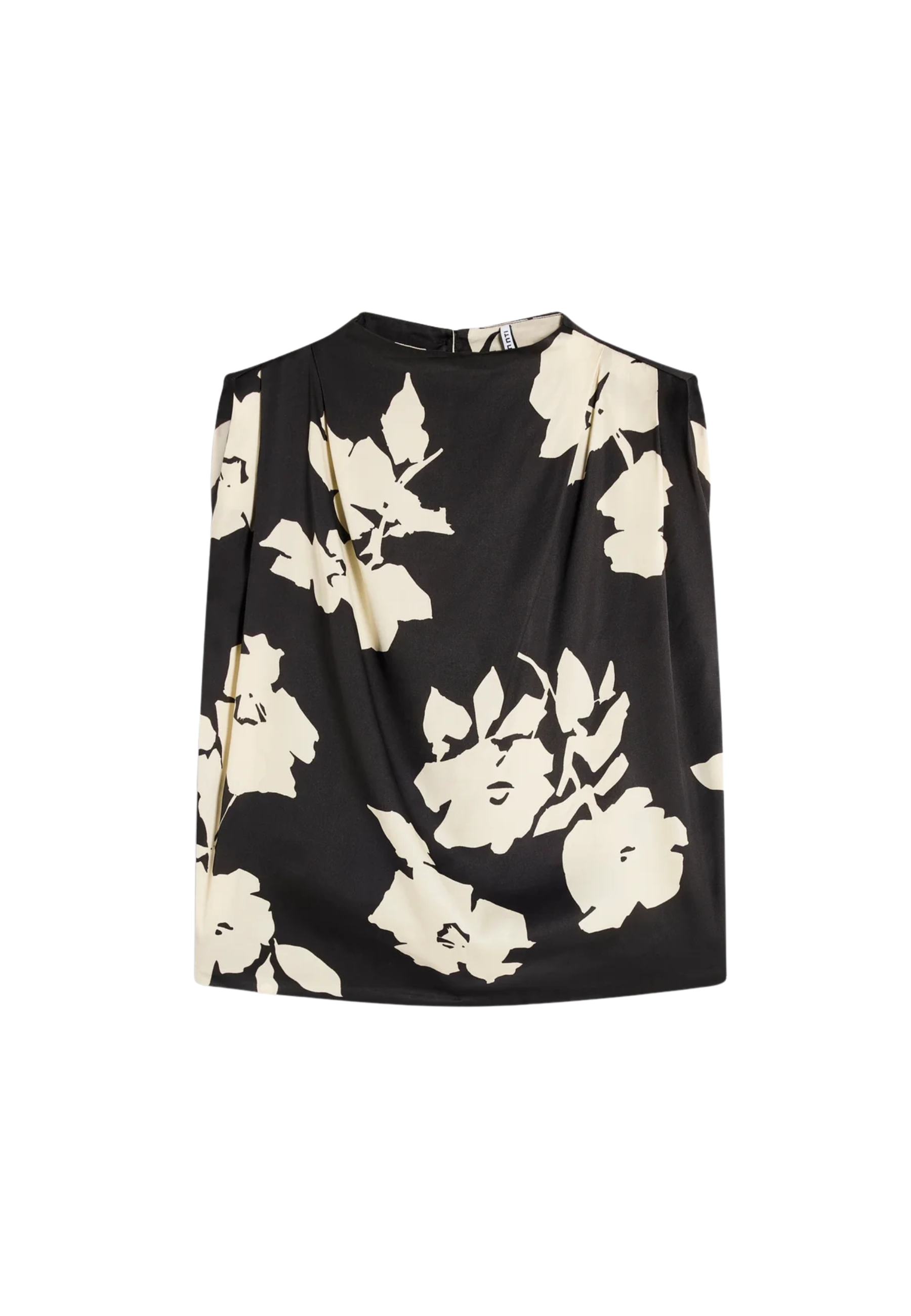 Top in bedruckter Viskose Satin, mit Ausschnitt Ein Krater entrapiert Und Schließe mit Knopf auf der Rückseite. weiche Linie Und regelmäßig fit.