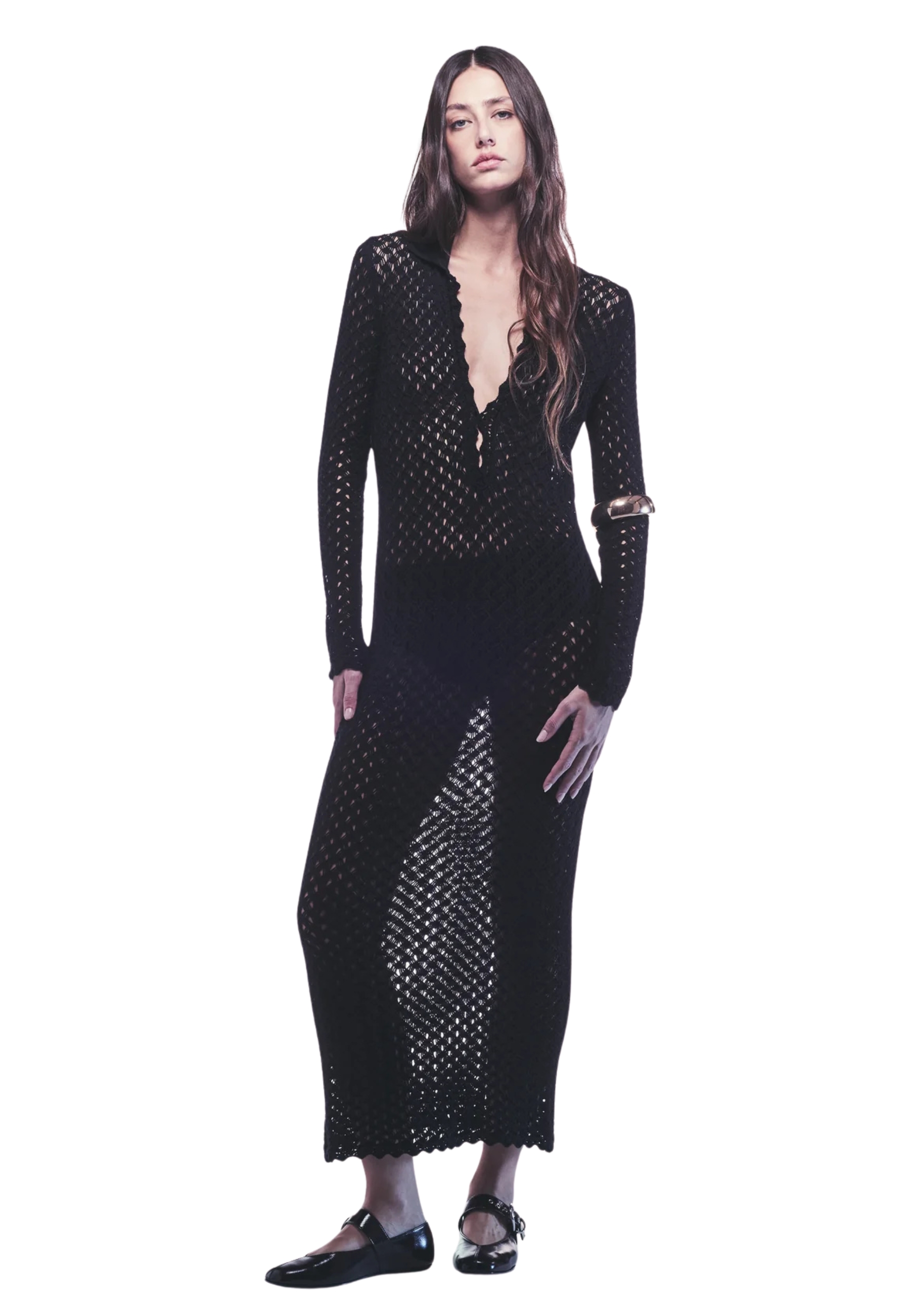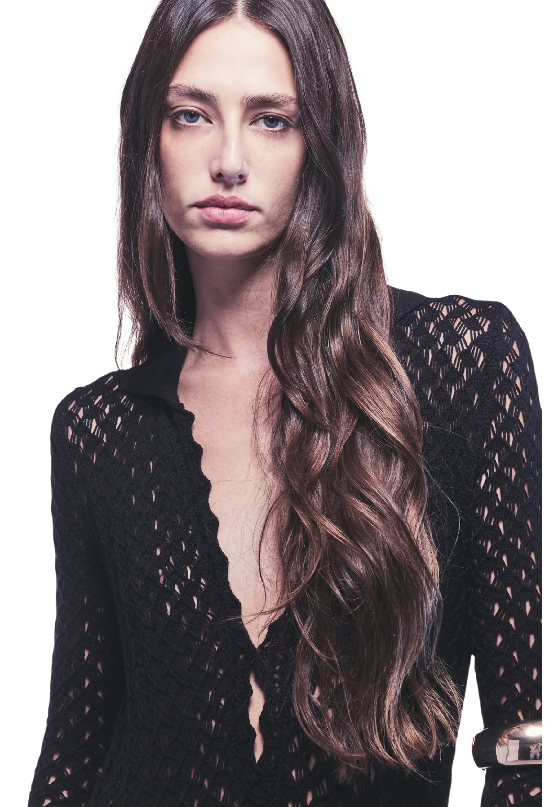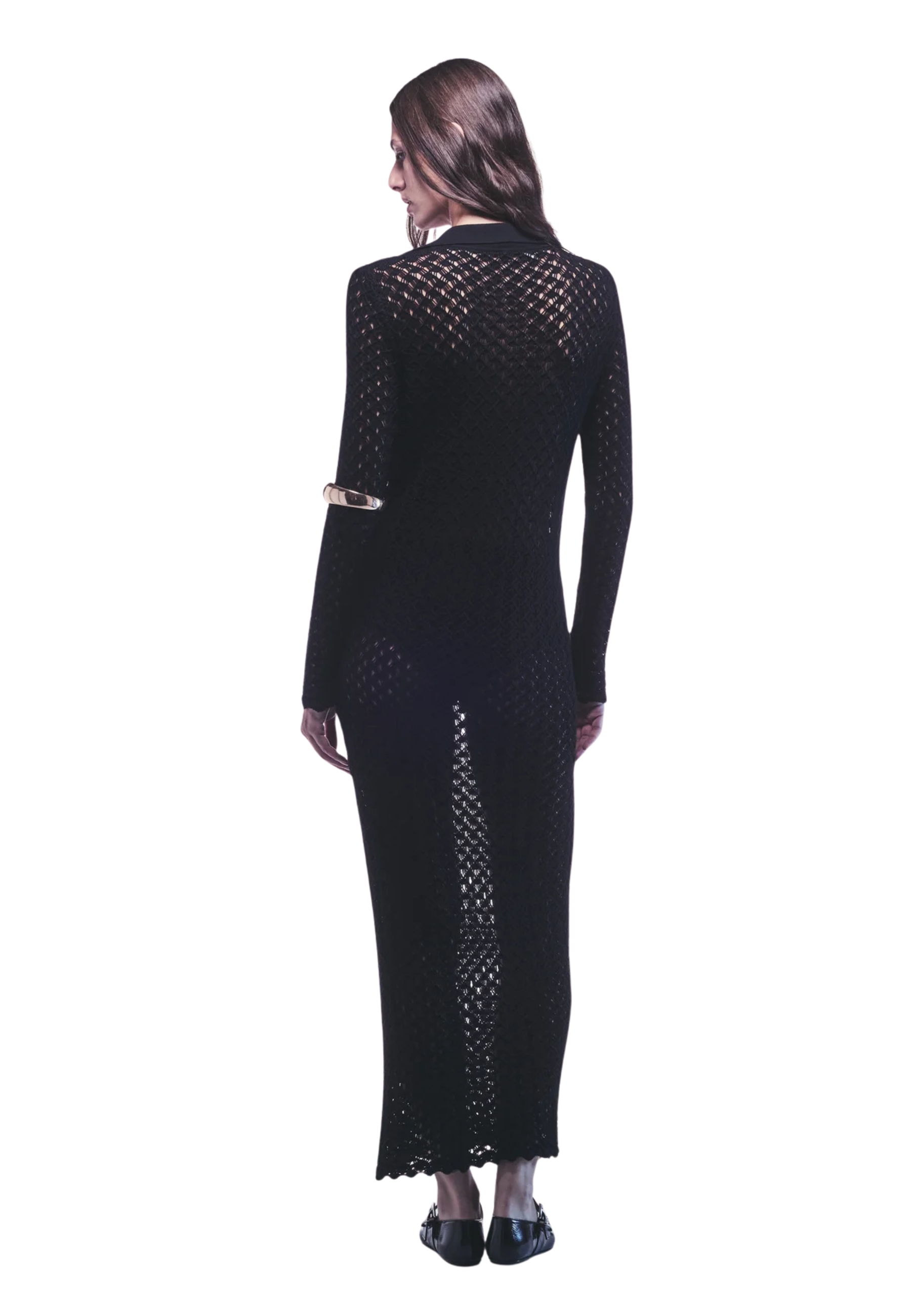 langes Kleid in extrafeine Merinowolle mit perforierter Verarbeitung, Kragen-Shirt-Stil Und tief V Ausschnitt ohne Sonnenanzug. Kopf gepaart mit Unterwäsche.