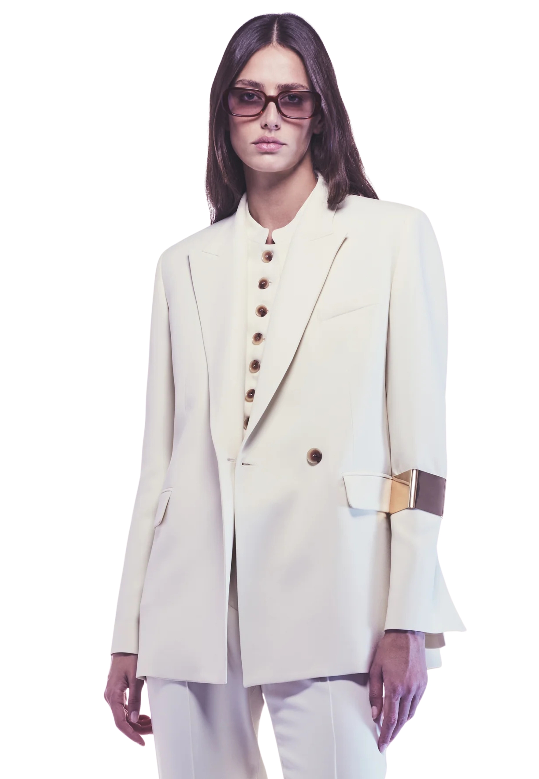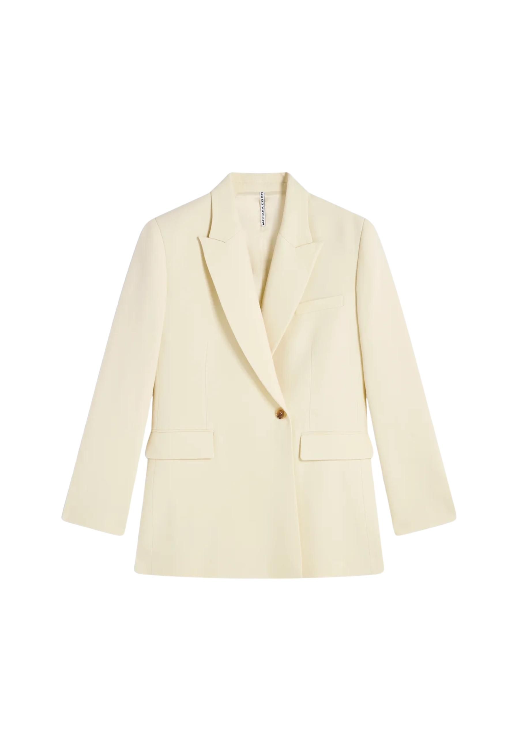 Drap Stoffjacke, sartorial Schnitt und bequeme Passform. präsentiert klassische Revers, doppelter Brustverschluss mit Tonknöpfen auf Ton und Taschen mit Klappe.