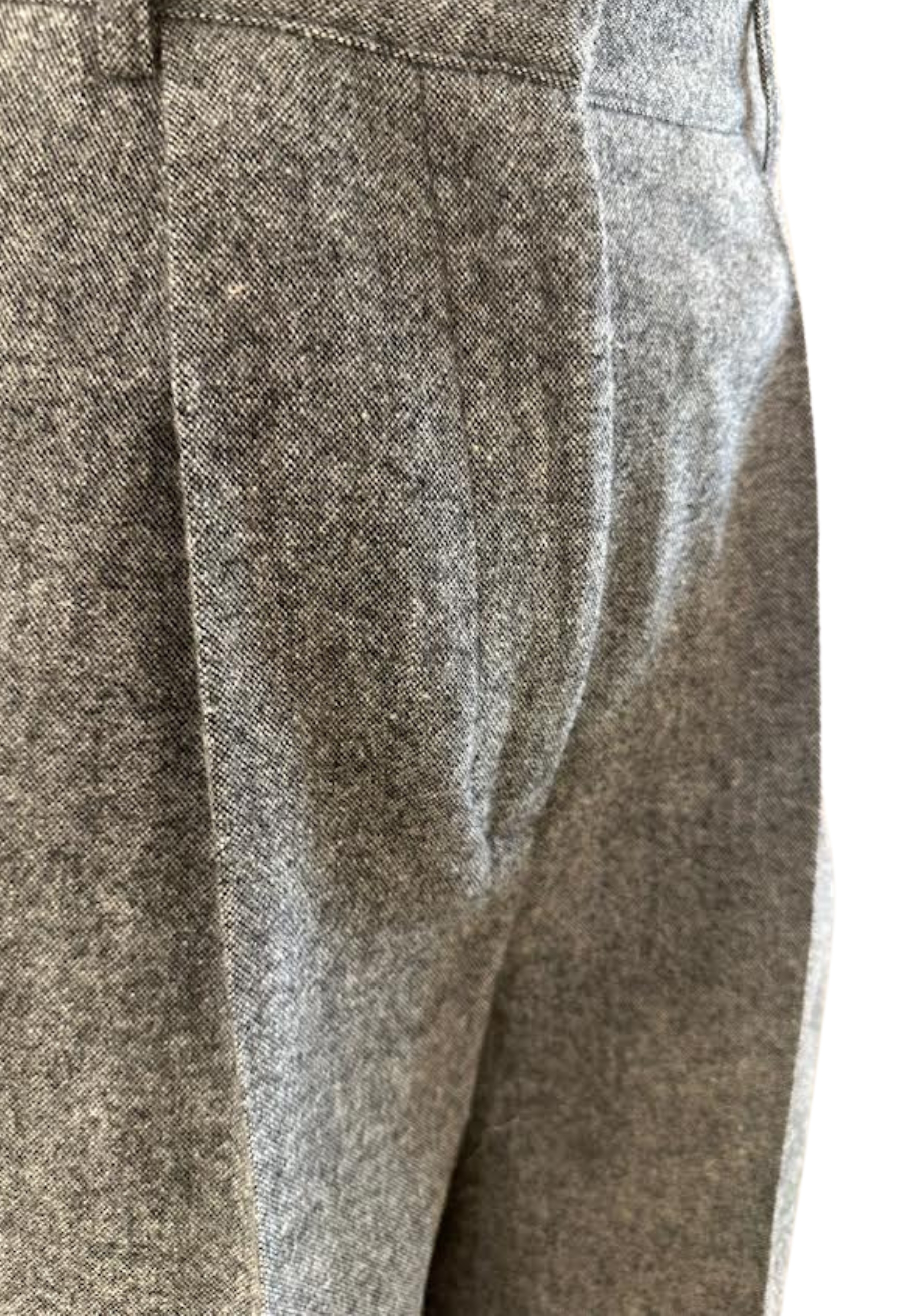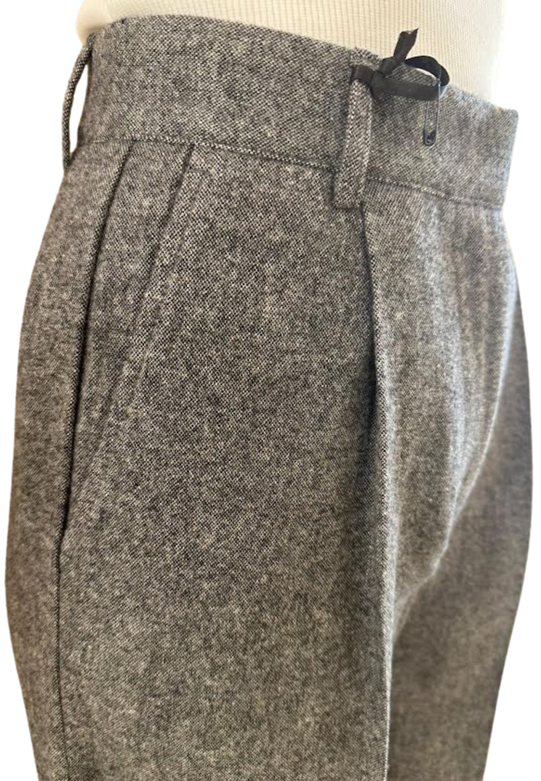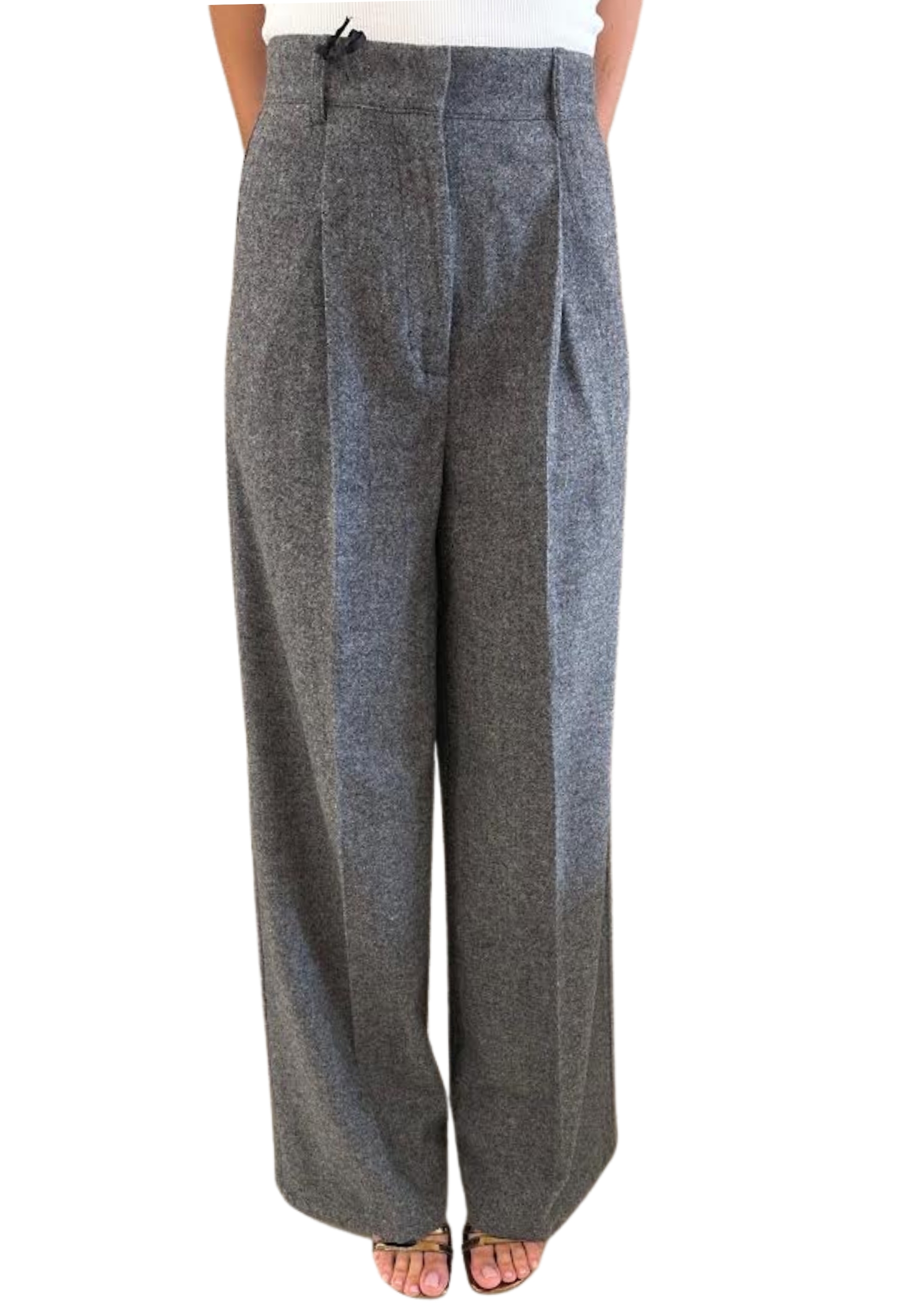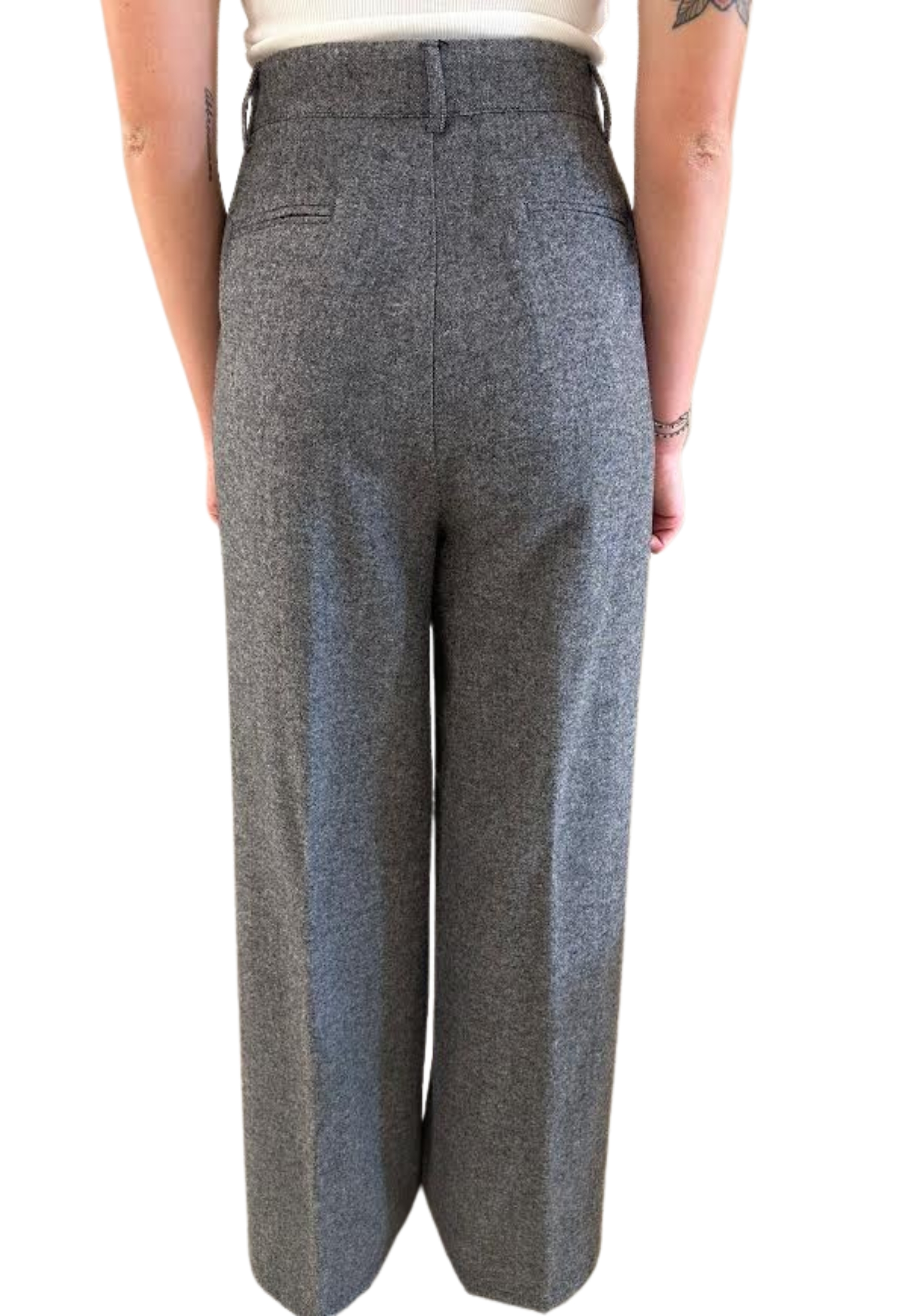 Graue Palasthose in Wolle, hohe Taille mit frontalen Hängen und zentralem Stretchfalten. Breites und langes Bein, elegant und vielseitig.