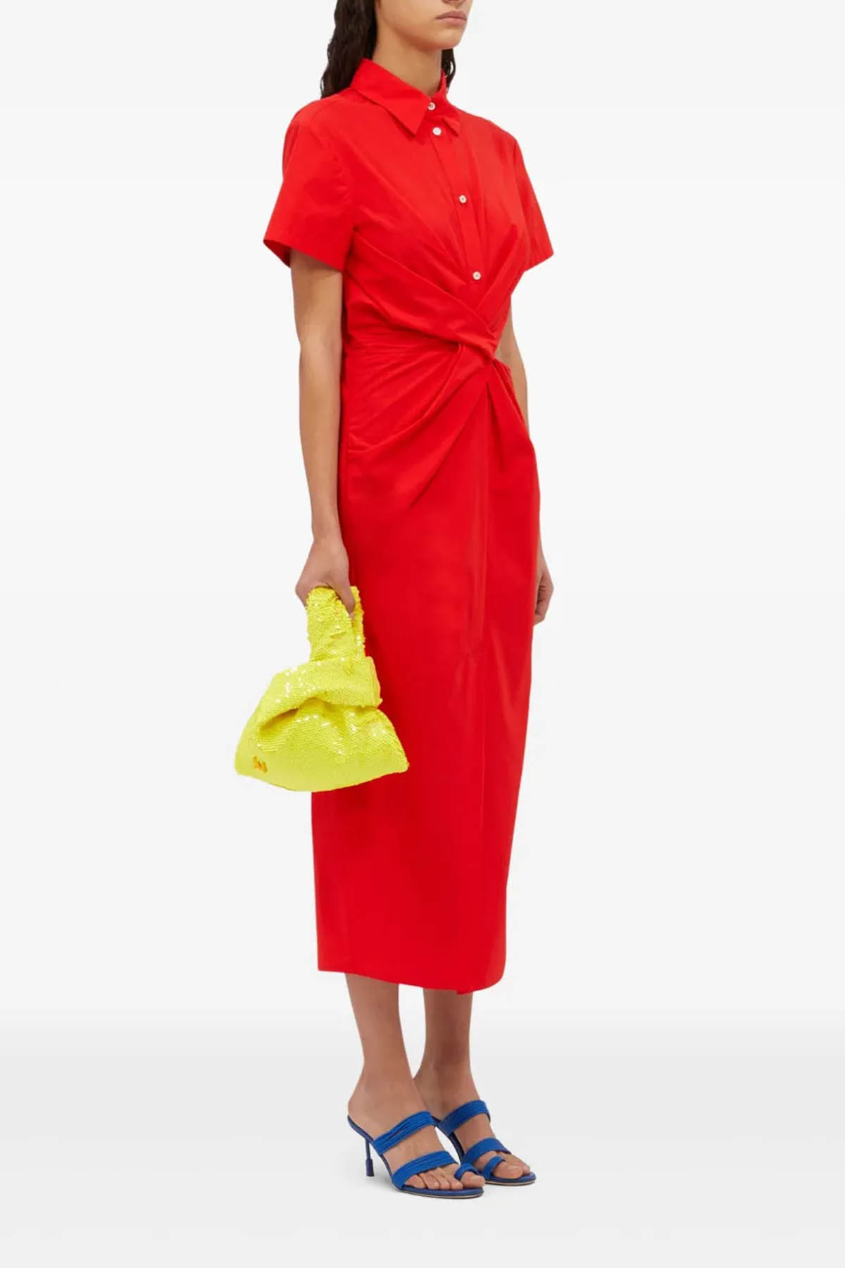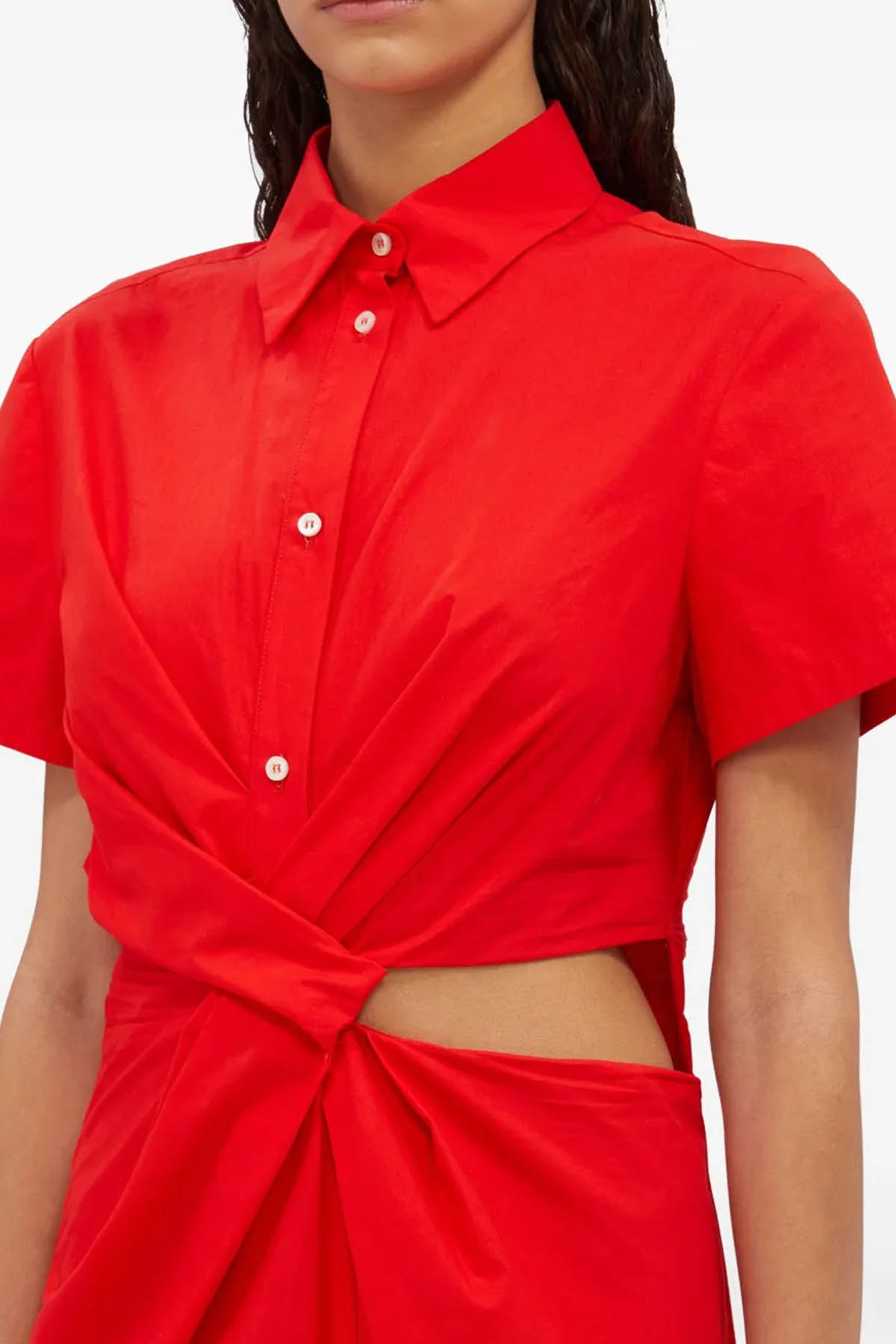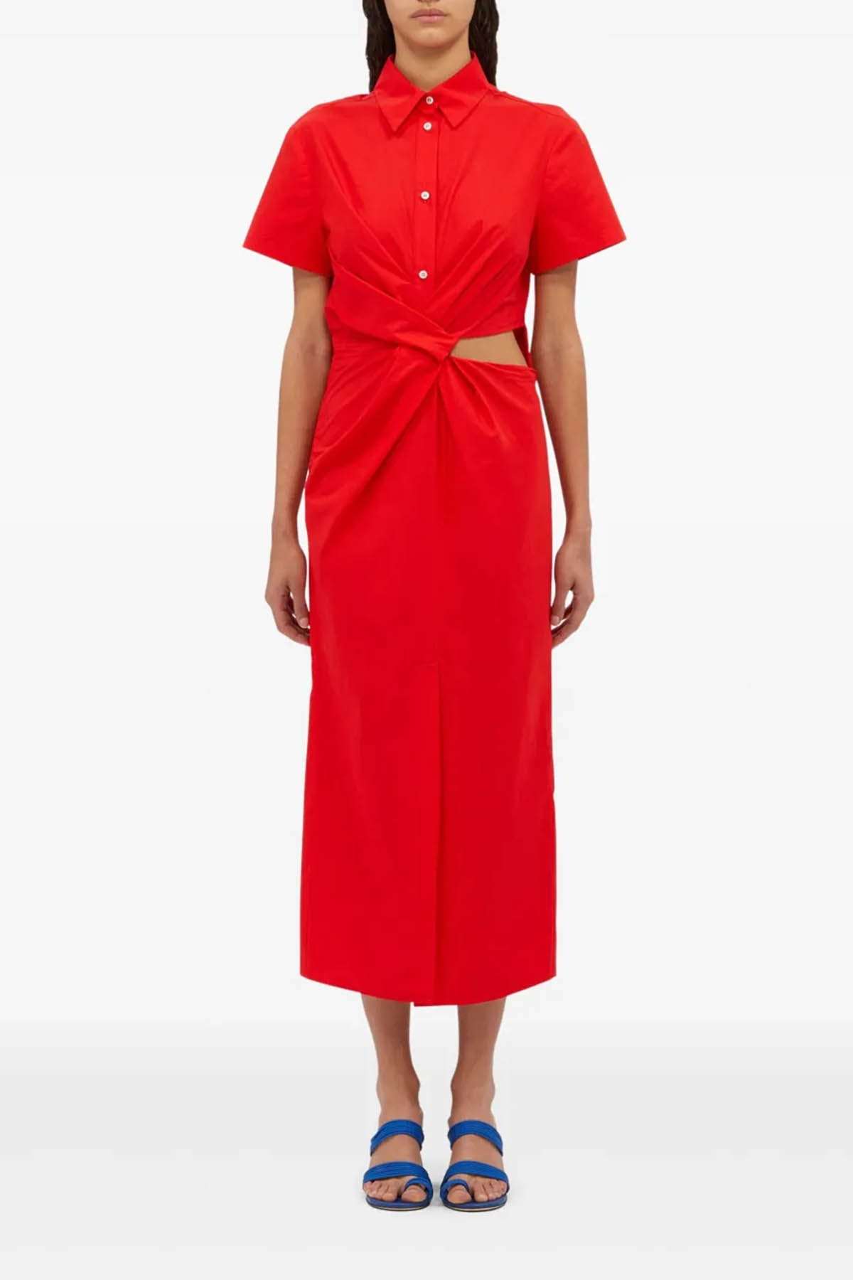 Modell mit Frontverschluss mit Knöpfen, klassischer Kragen, kurze Ärmel, seitlicher Schlitz auf der Büste, Knöchellänge. Zusammensetzung 100% Made in Italy