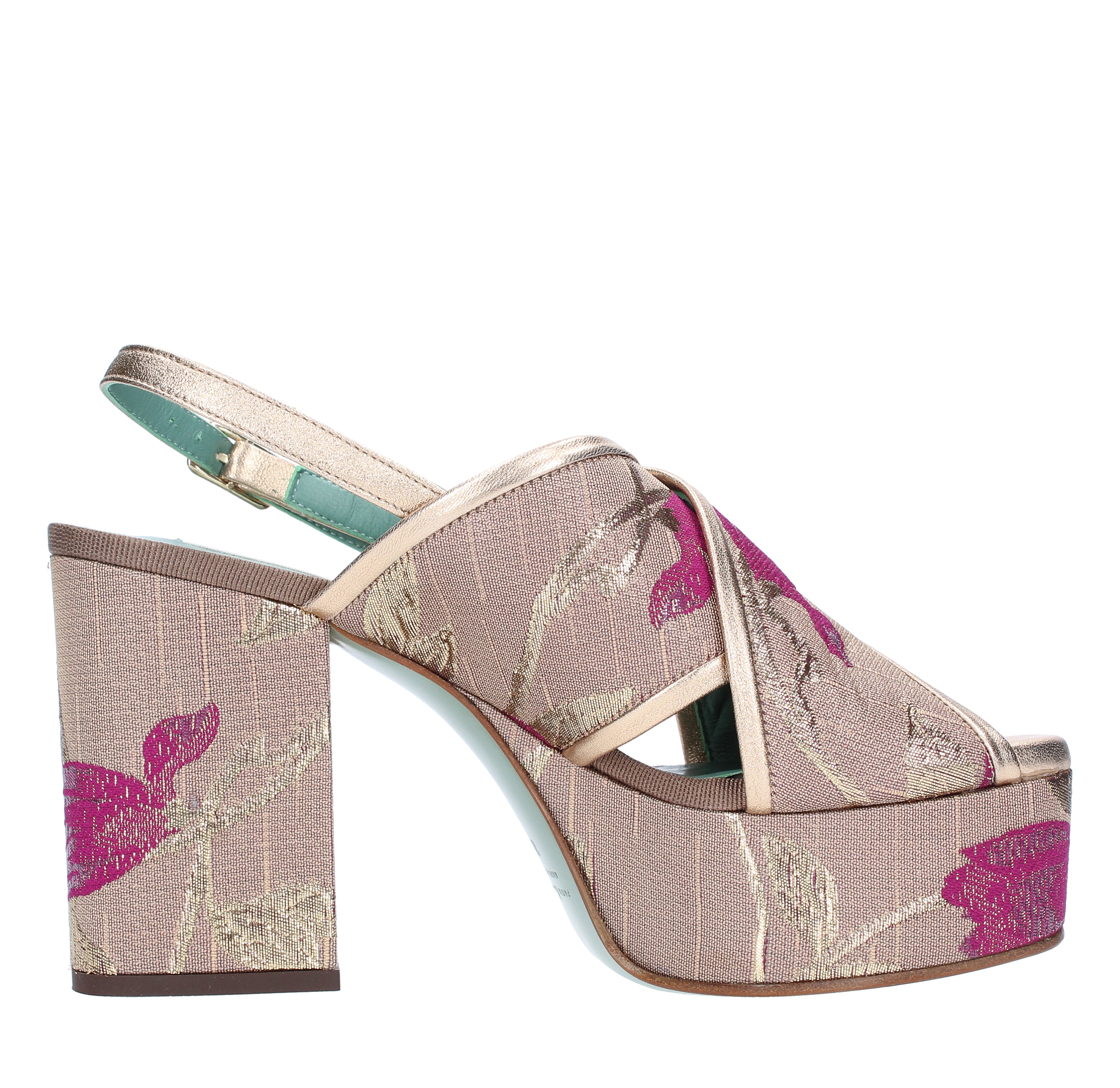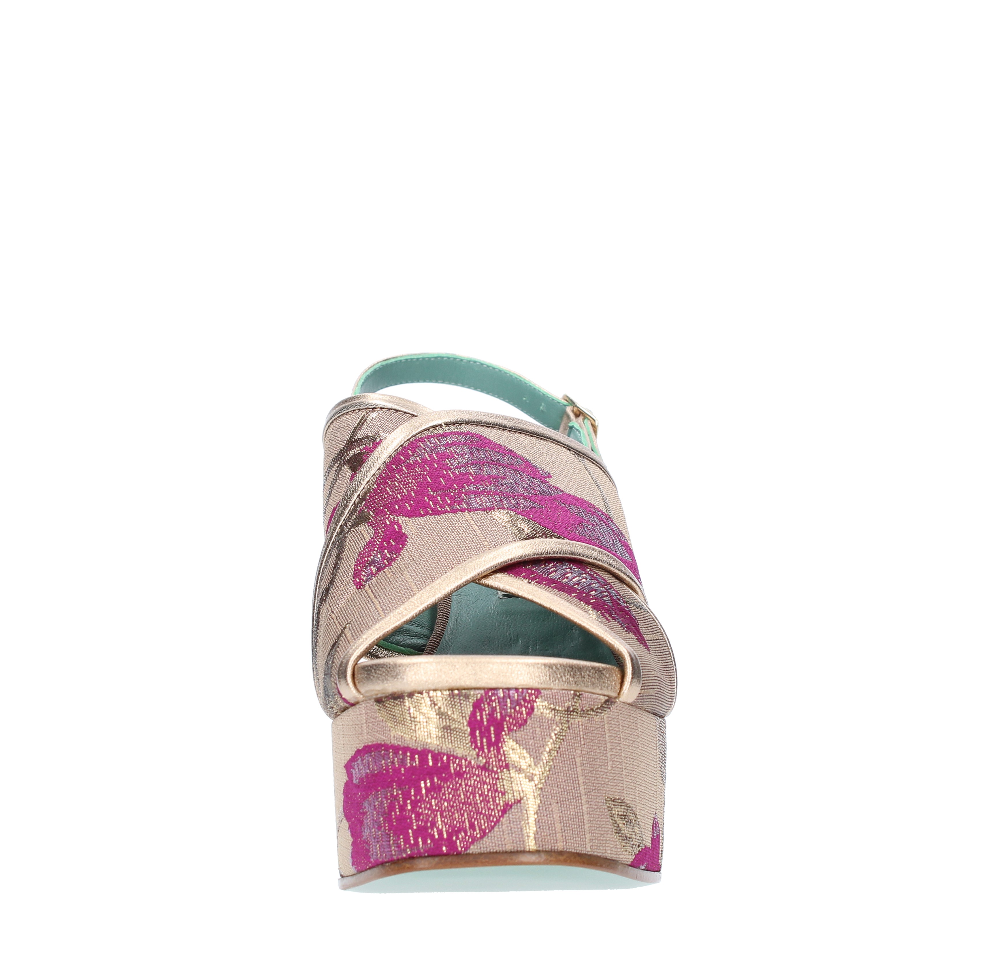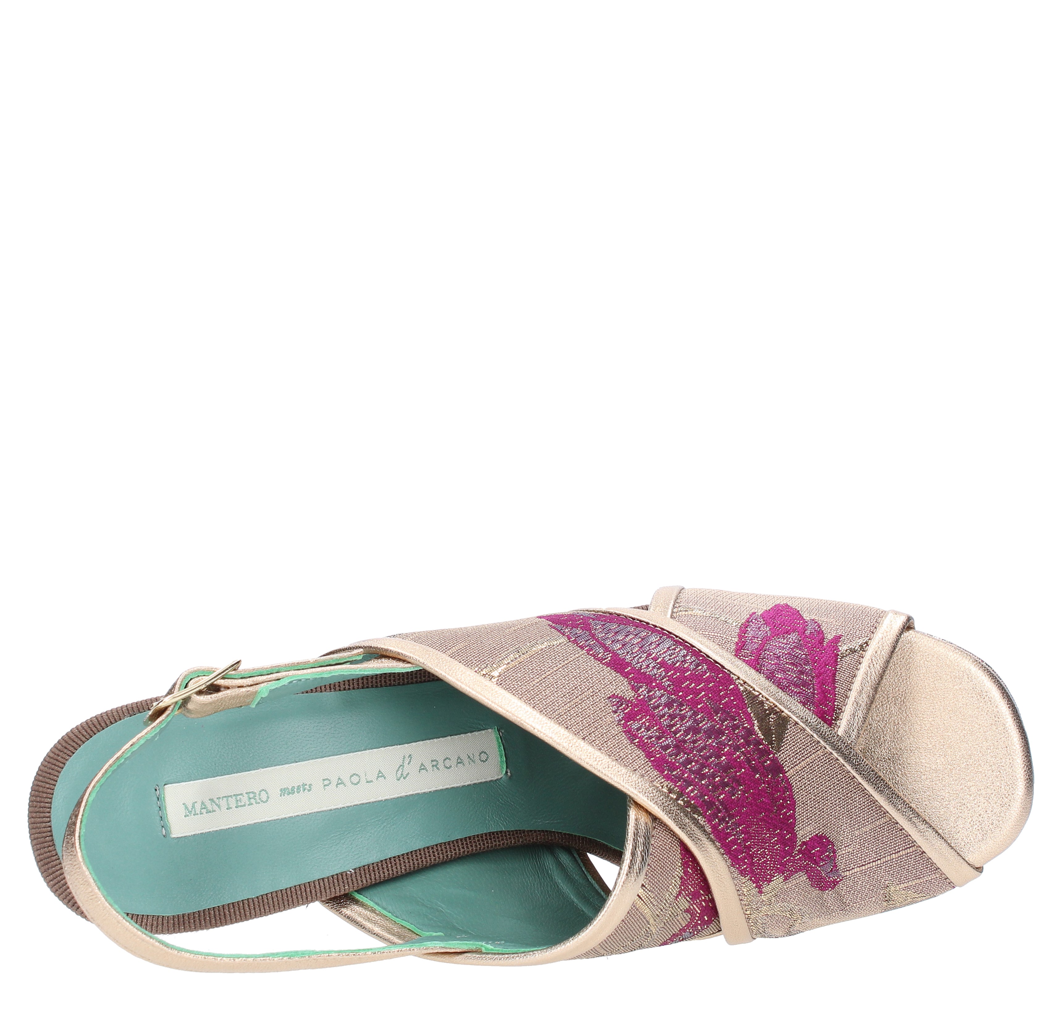 Mantero Plateausandalen für Paola D'Arcano aus Stoff und Leder. Paspel und Riemen aus Leder. 4,5 cm Plateau. Sohle aus Leder. Innenfutter aus Leder. Die Druckreihenfolge kann von der auf dem Foto gezeigten abweichen.