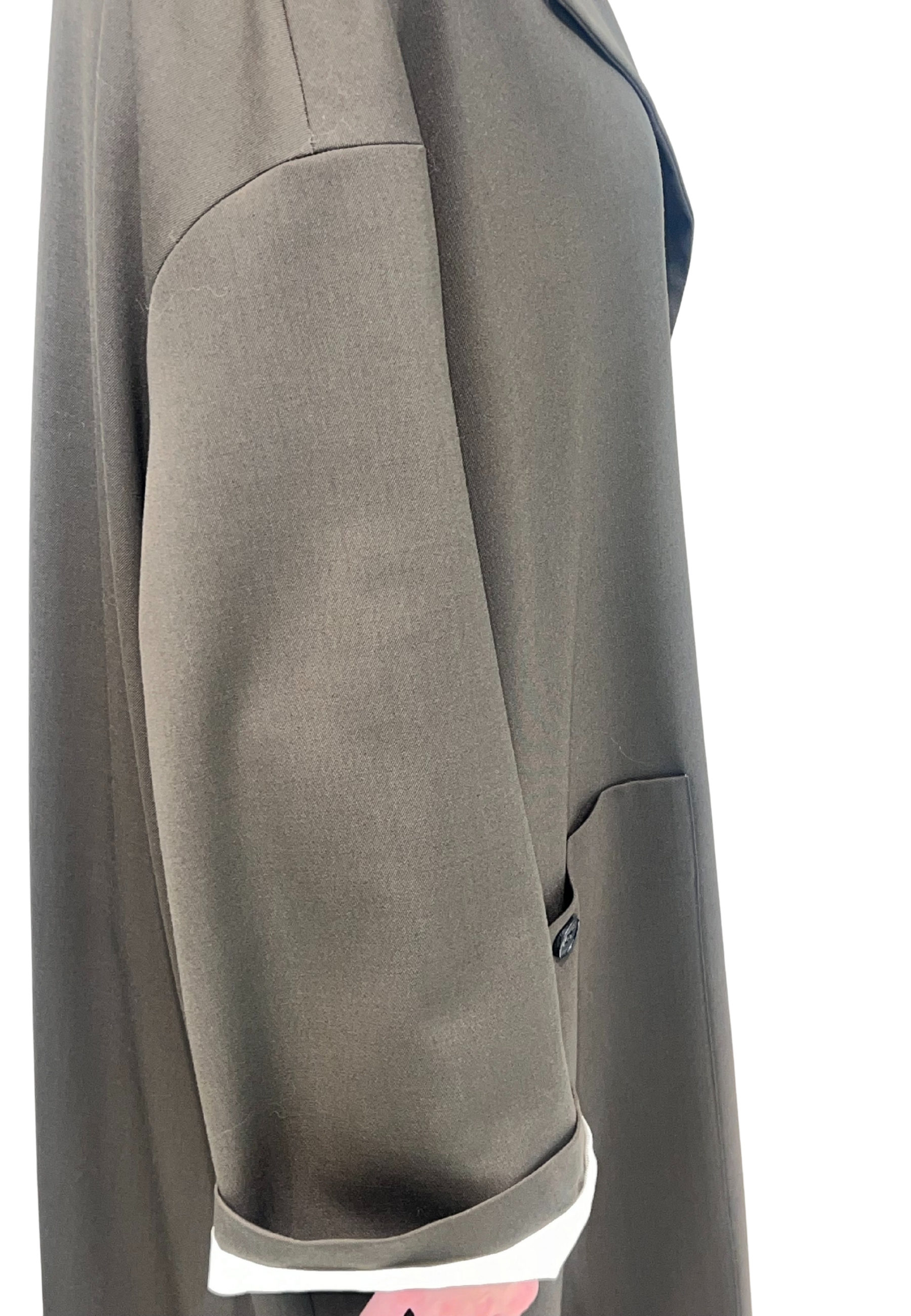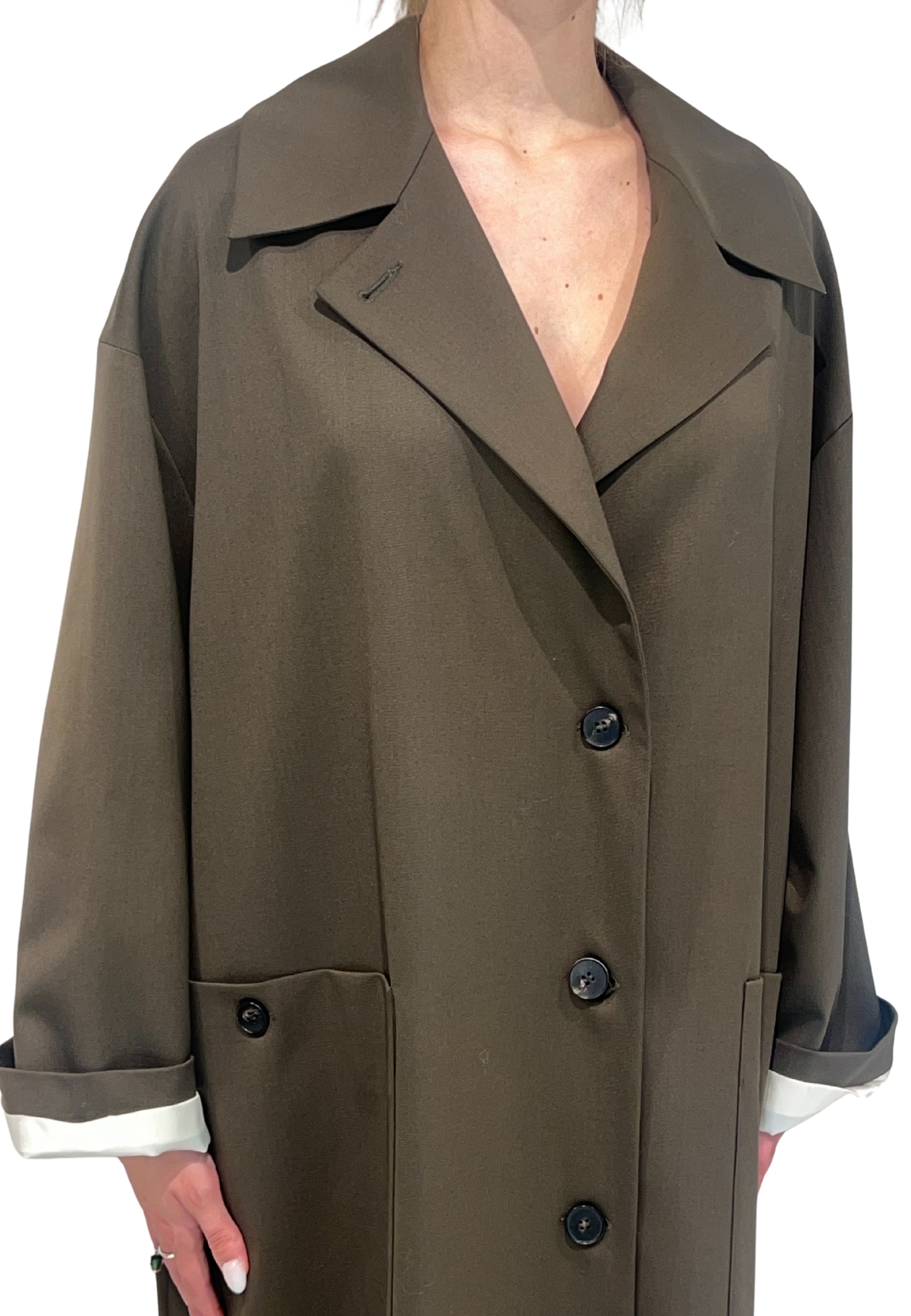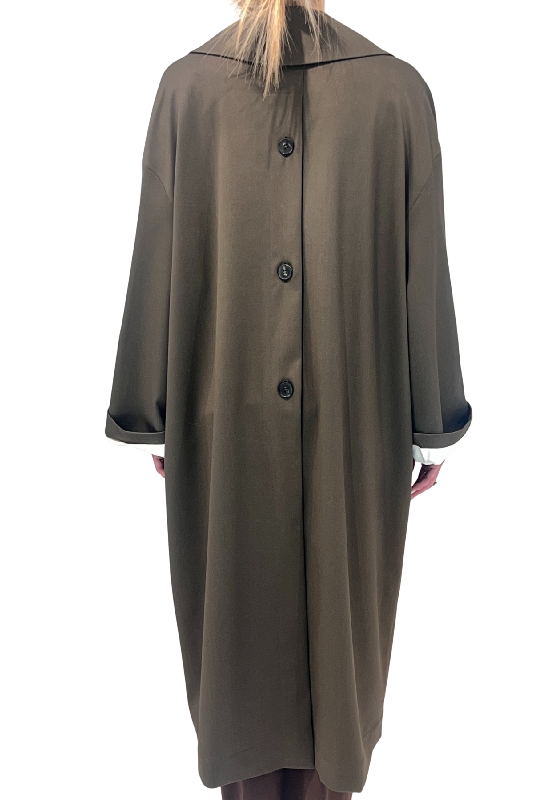 Der Mantel ist lang, olivbraun, mit einer breiten und geraden Silhouette. Es hat einen großen Kragen, drei schwarze Knöpfe an der Vorderseite und breite Ärmel mit einem weißen Detail am Handgelenk. Auf der Rückseite gibt es drei schwarze Knöpfe entlang des Rückens und fügt einen Hauch von minimalistischer Eleganz hinzu. Das Design ist sauber und anspruchsvoll, ohne übermäßige Details.