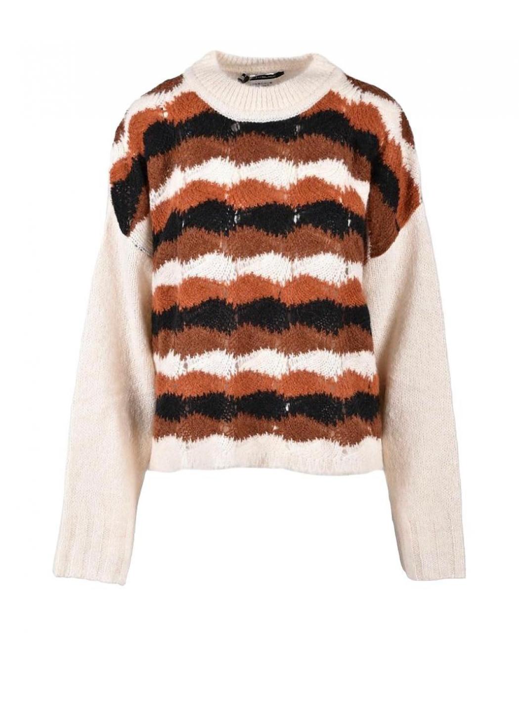 Elfenbein Farbe Jacquard Pullover, schwarz, Leder und Tabak in Alpaca Mischung, runder Ausschnitt, lange Ärmel, unten Schultern, weiche Linie.