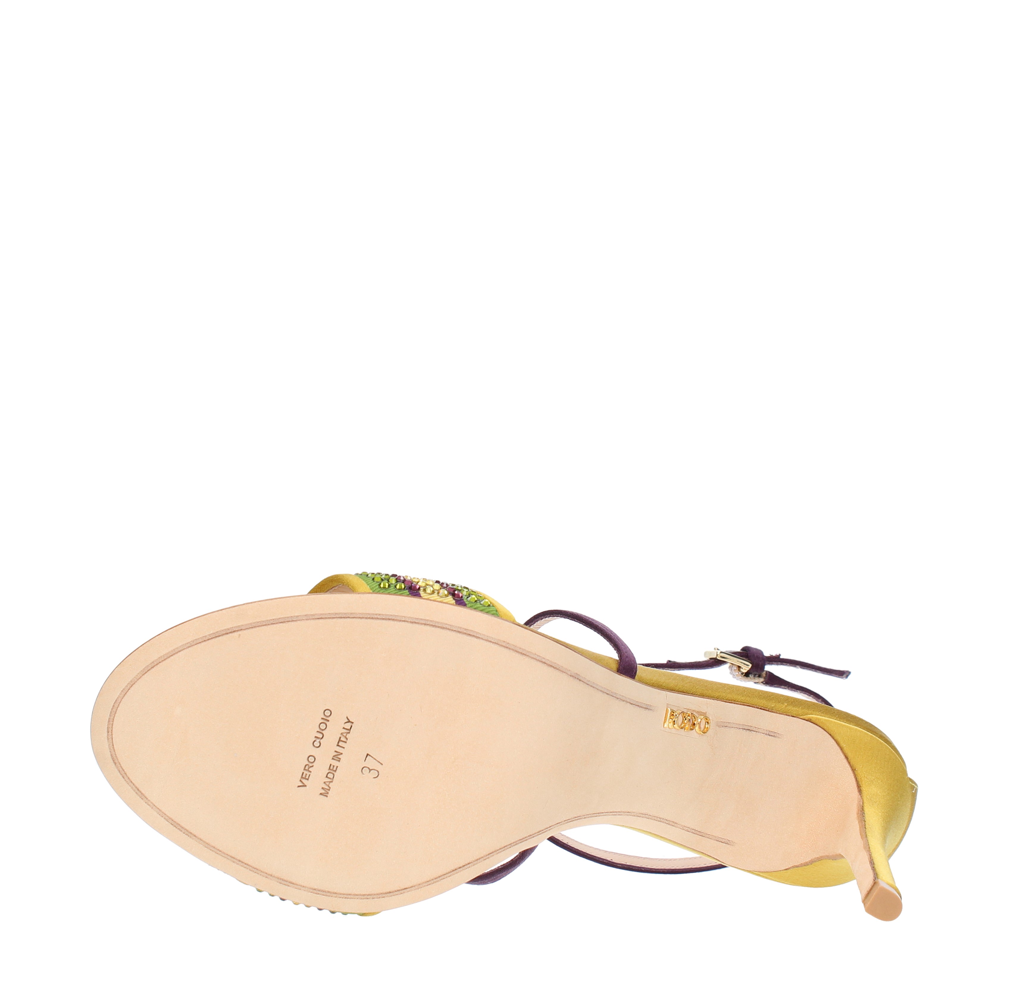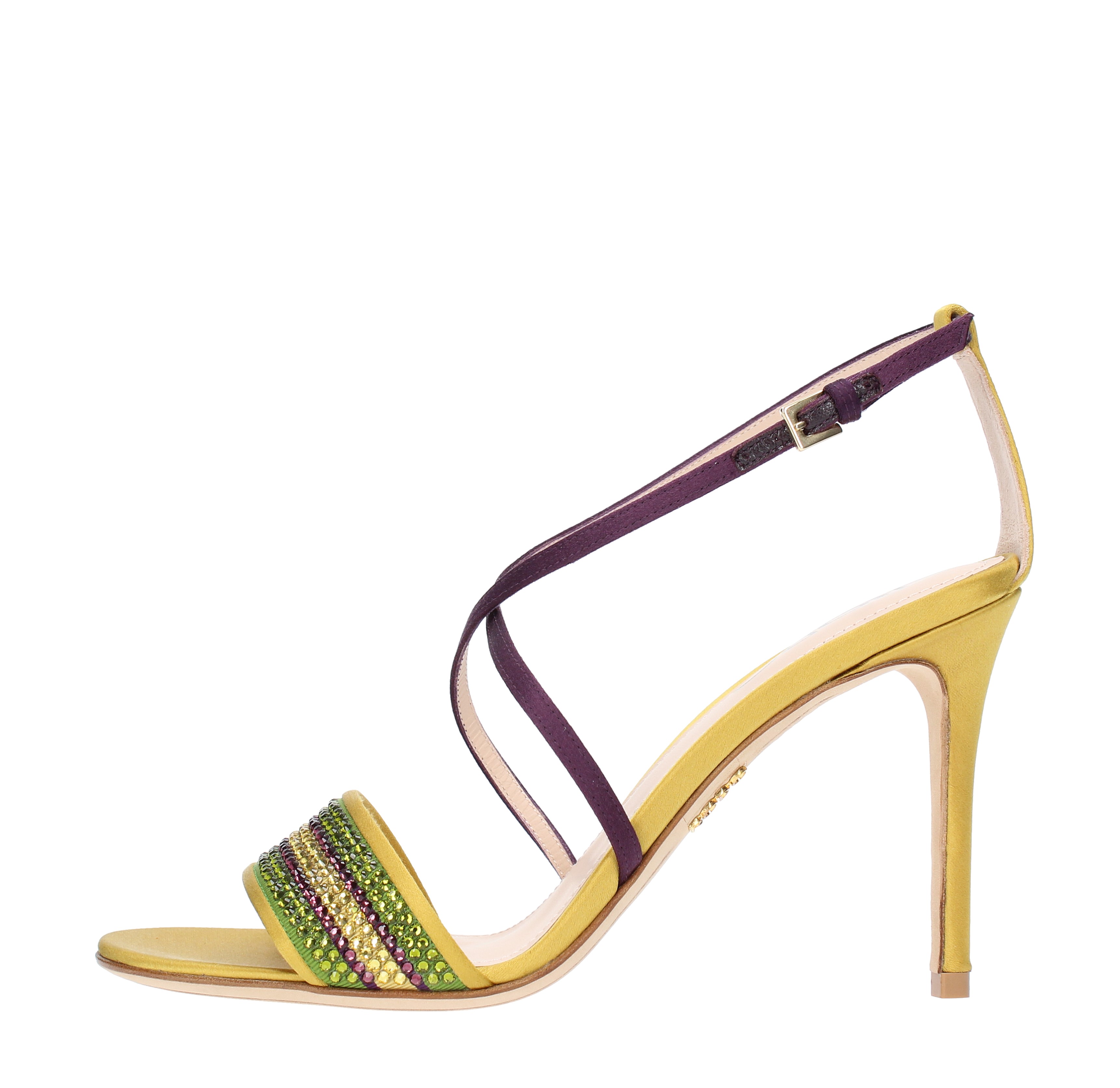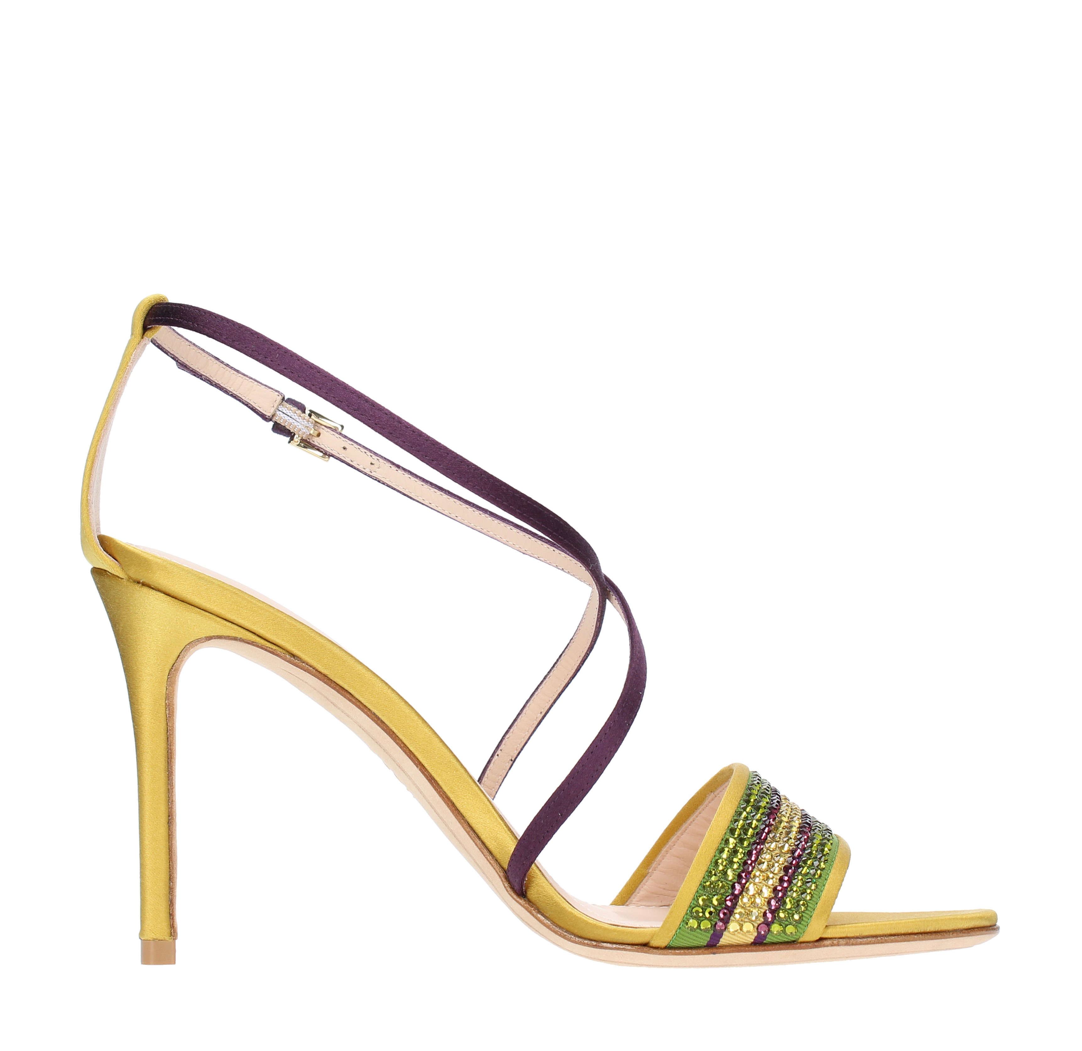 Sandalenmodell S0219 aus Satin und Strasssteinen. Riemen mit Schnalle. Außensohle aus Leder. Innenmaterial aus Leder.