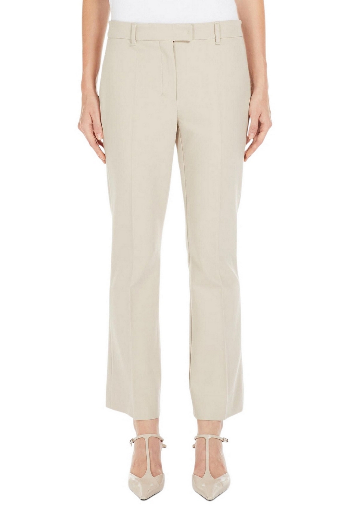 MaxMara S Hose aus doppeltem Baumwollgewebe und Stretch Viskose, gekennzeichnet durch eine schlanke Passform Silhouette leicht am Boden flankiert, mit gestrecktem Falten auf dem Bein und Gürtelschlaufen. Schließung mit hoher Taille, Reißverschluss mit Klappe und Haken. Stoff: 47% Viskose, 45% Baumwolle, 8% Elastan