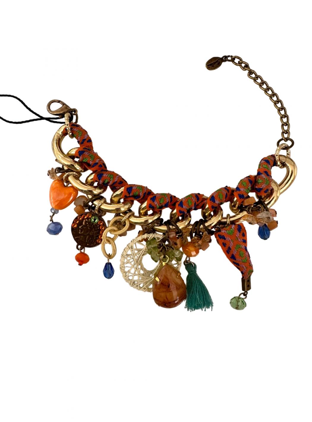 Stupendo Armband mit goldenen Kette bedeckt mit Fantasie orange Stoff. Steine und Charme hängen. Ein einzigartiges und originelles Stück von echten Kennern des bijoux. Mademoiselle Sodini Bijoux.