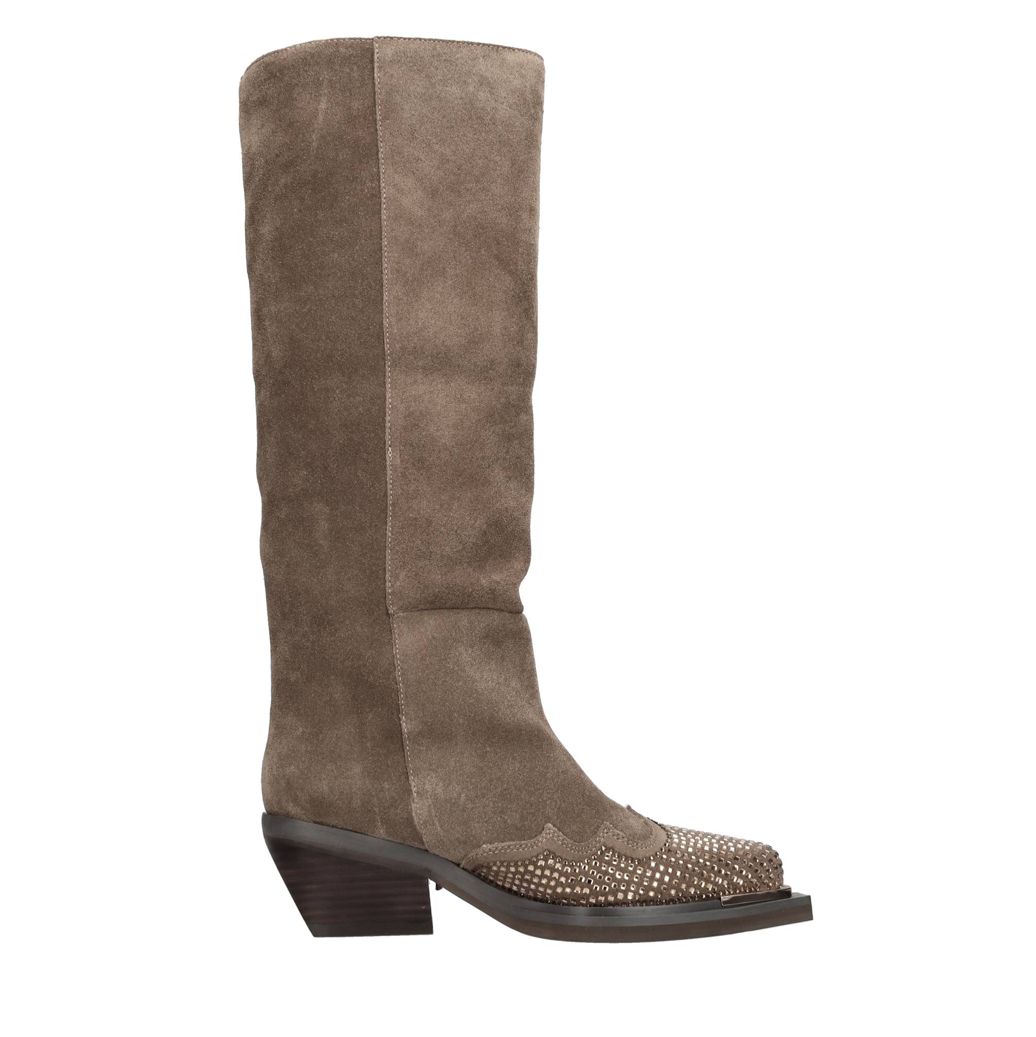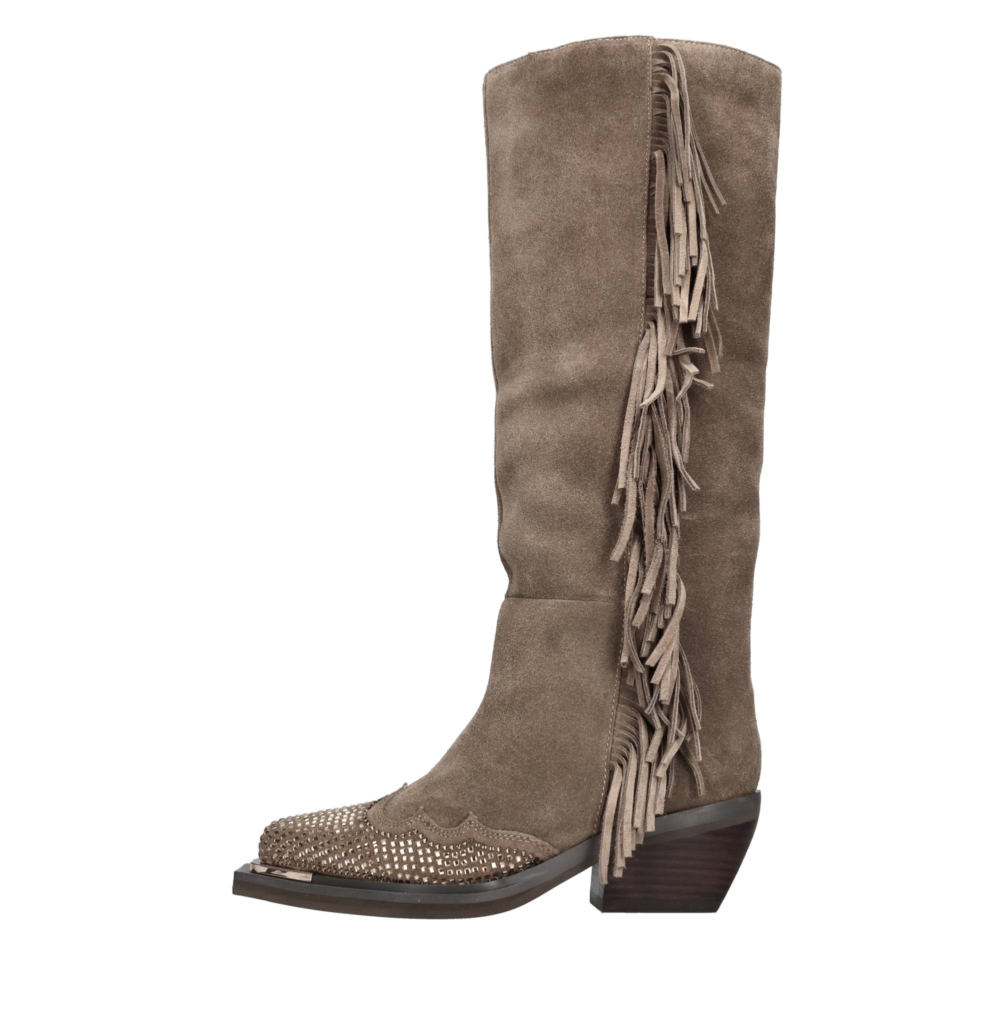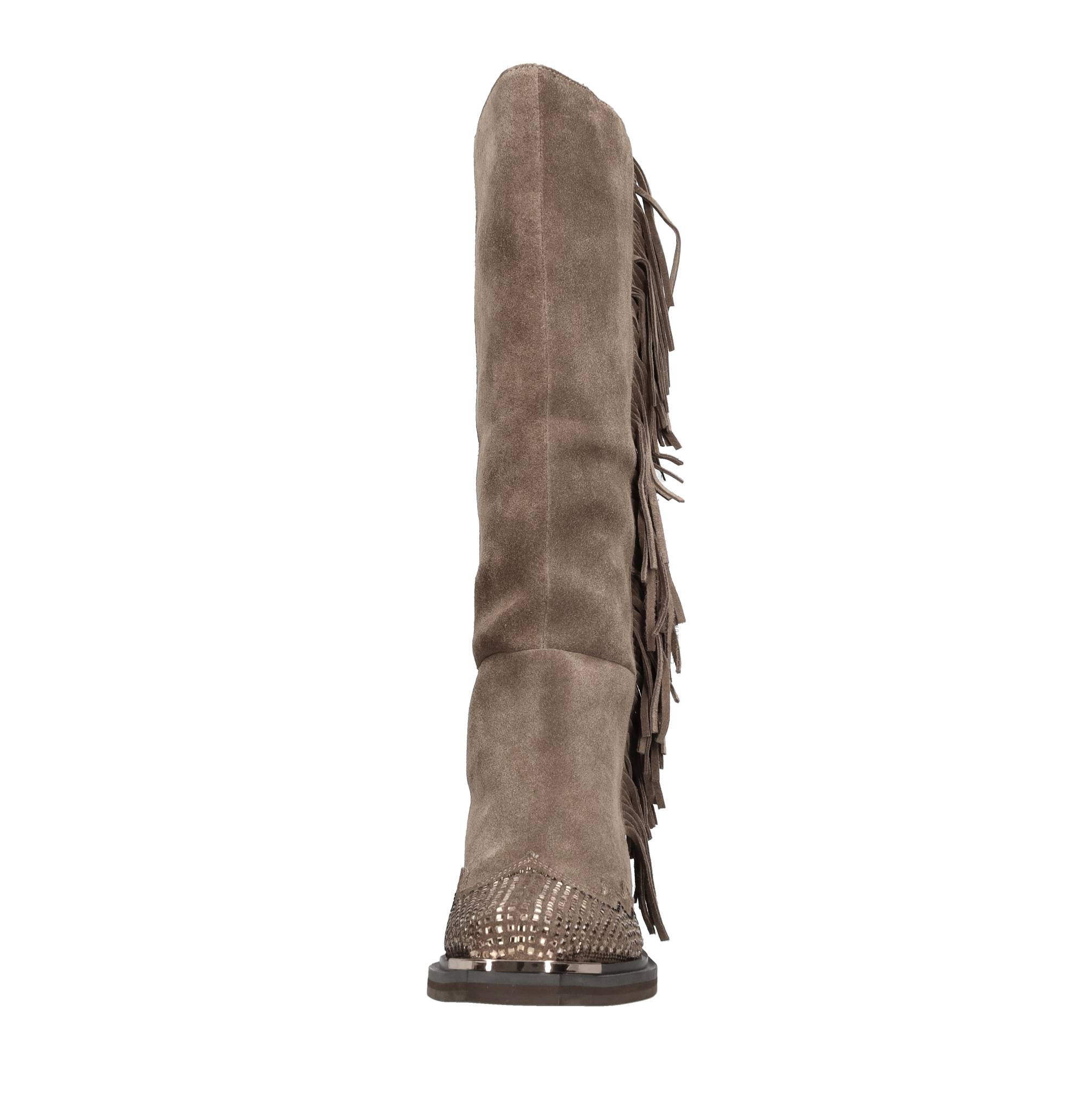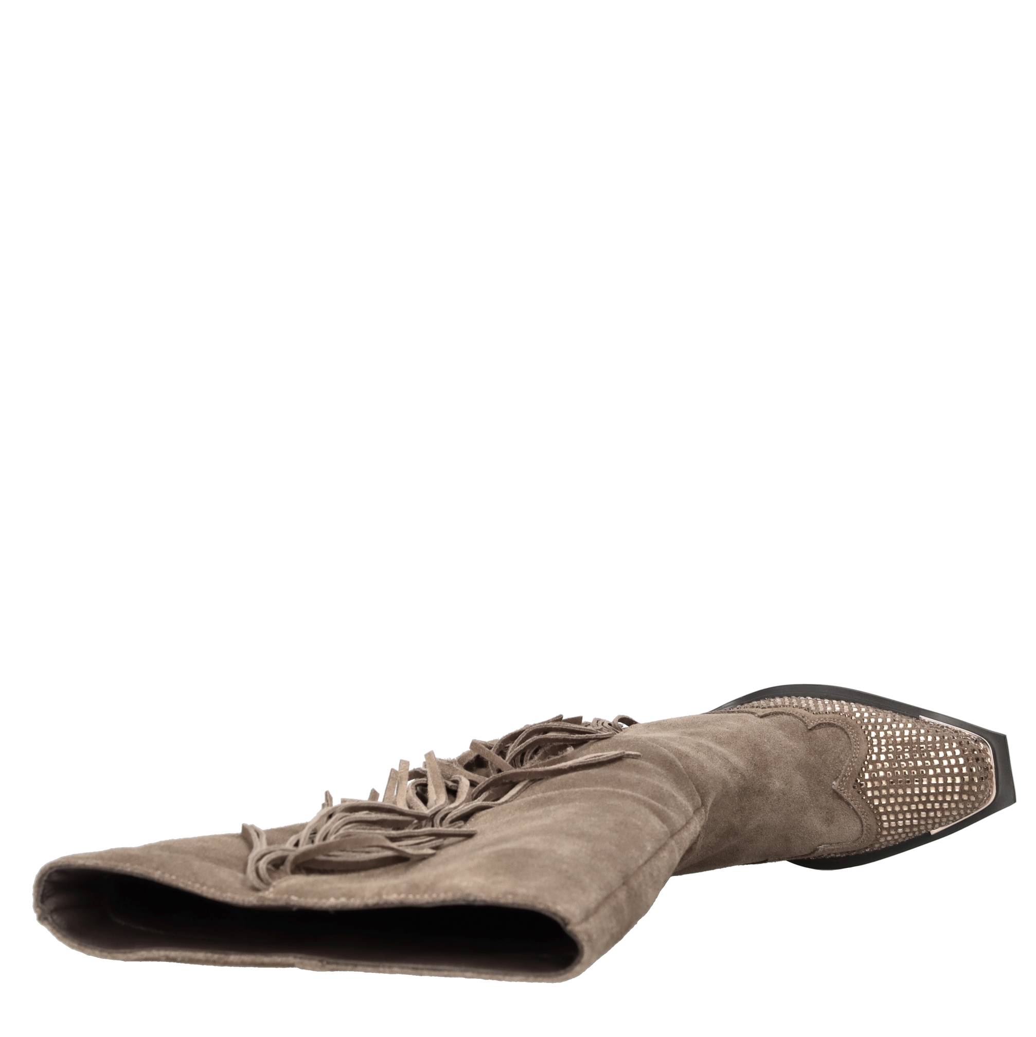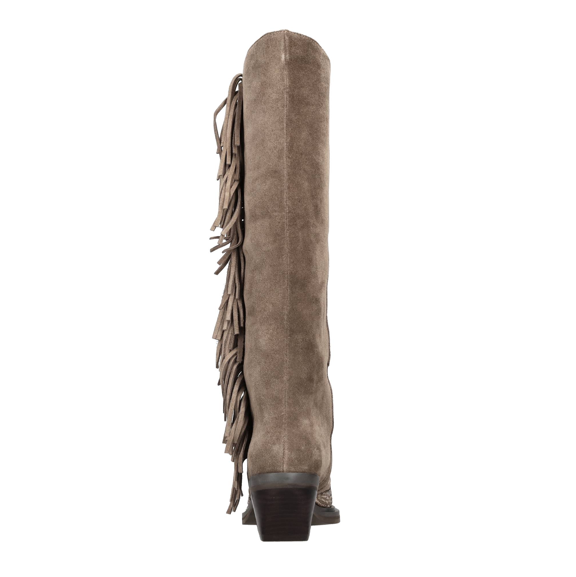 Suede Texan boots. Rhinestones applied on the toe and decorative fringes. Faux leather and fabric inner upper. Faux leather outer sole.
