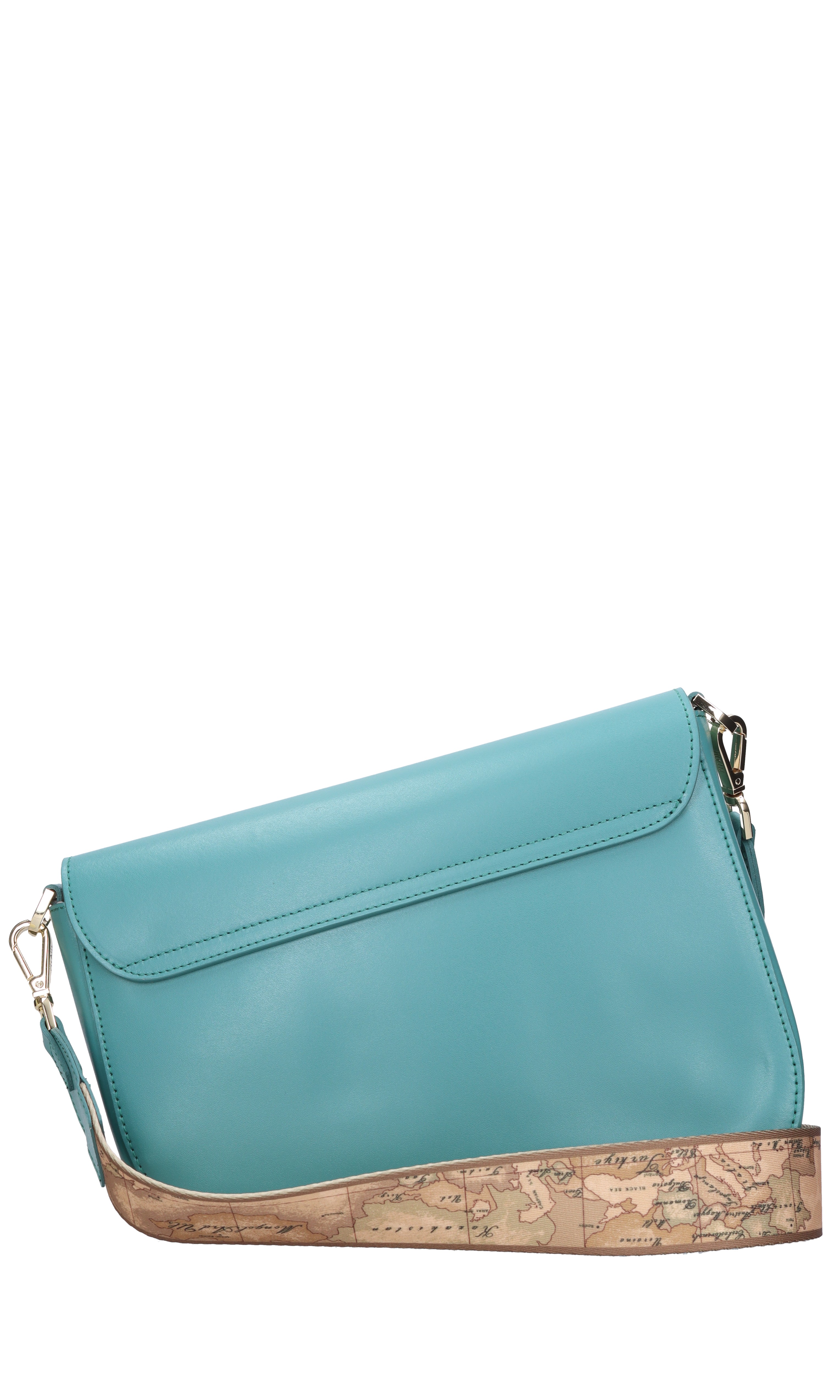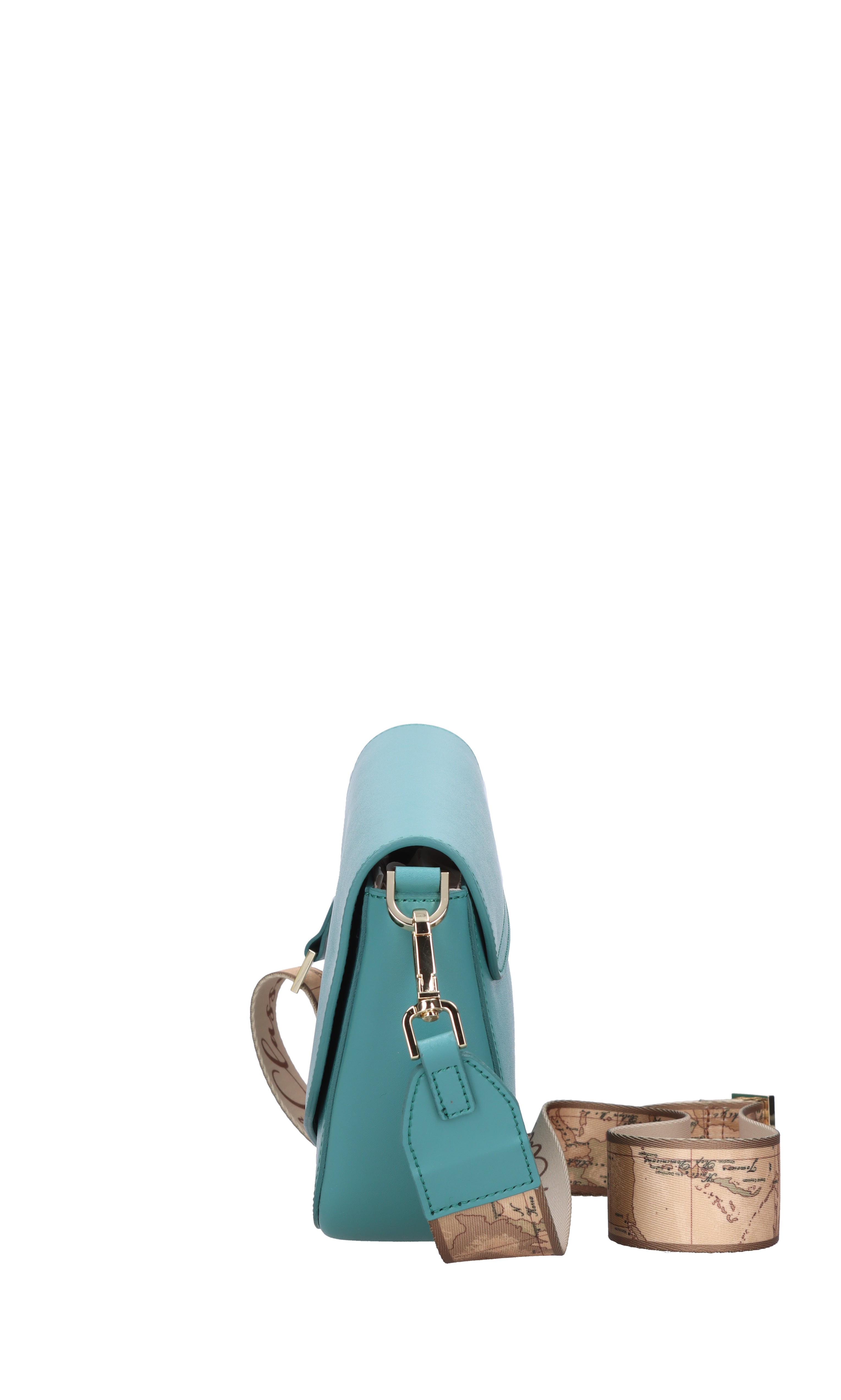 Leather bag. 100% BOVINE LEATHER. 1 compartment. Closure with flap with snap button. Adjustable and removable geo-print fabric shoulder strap.