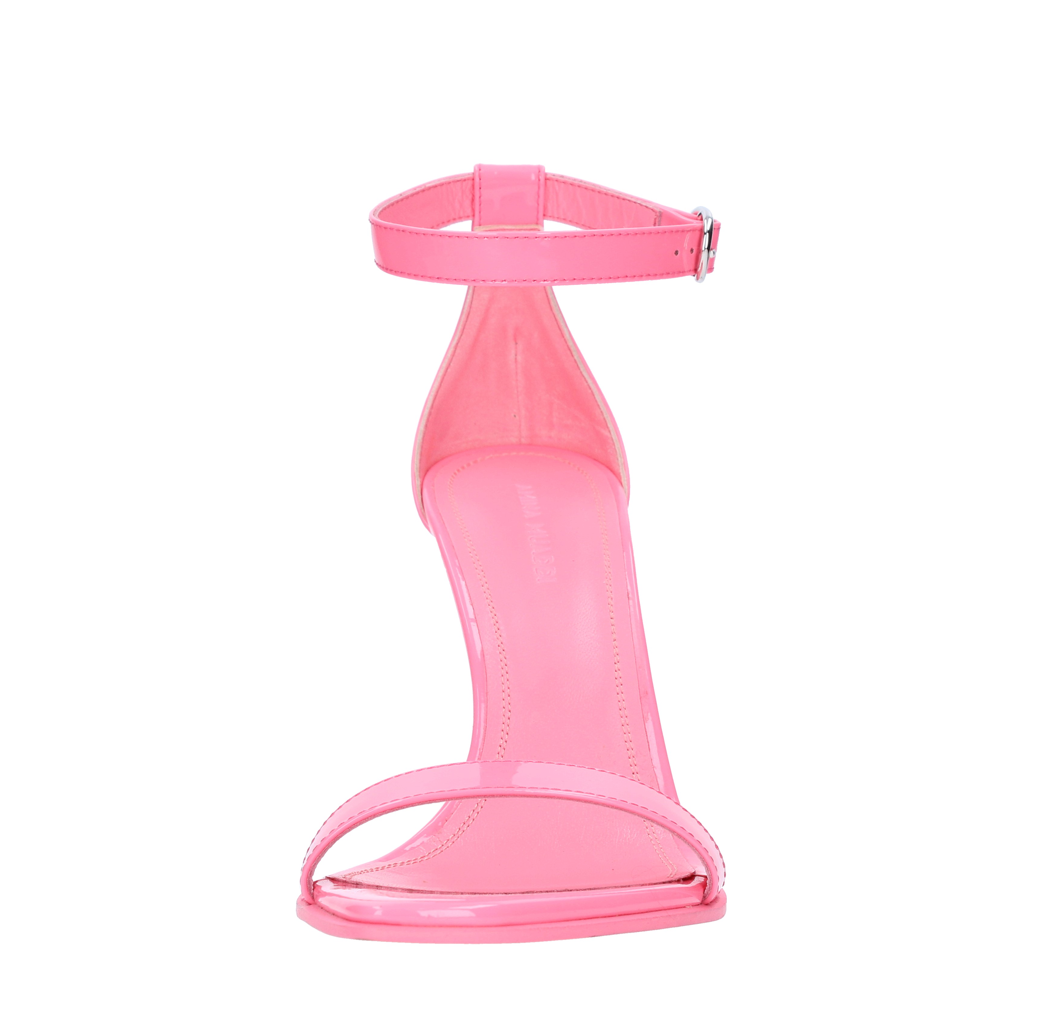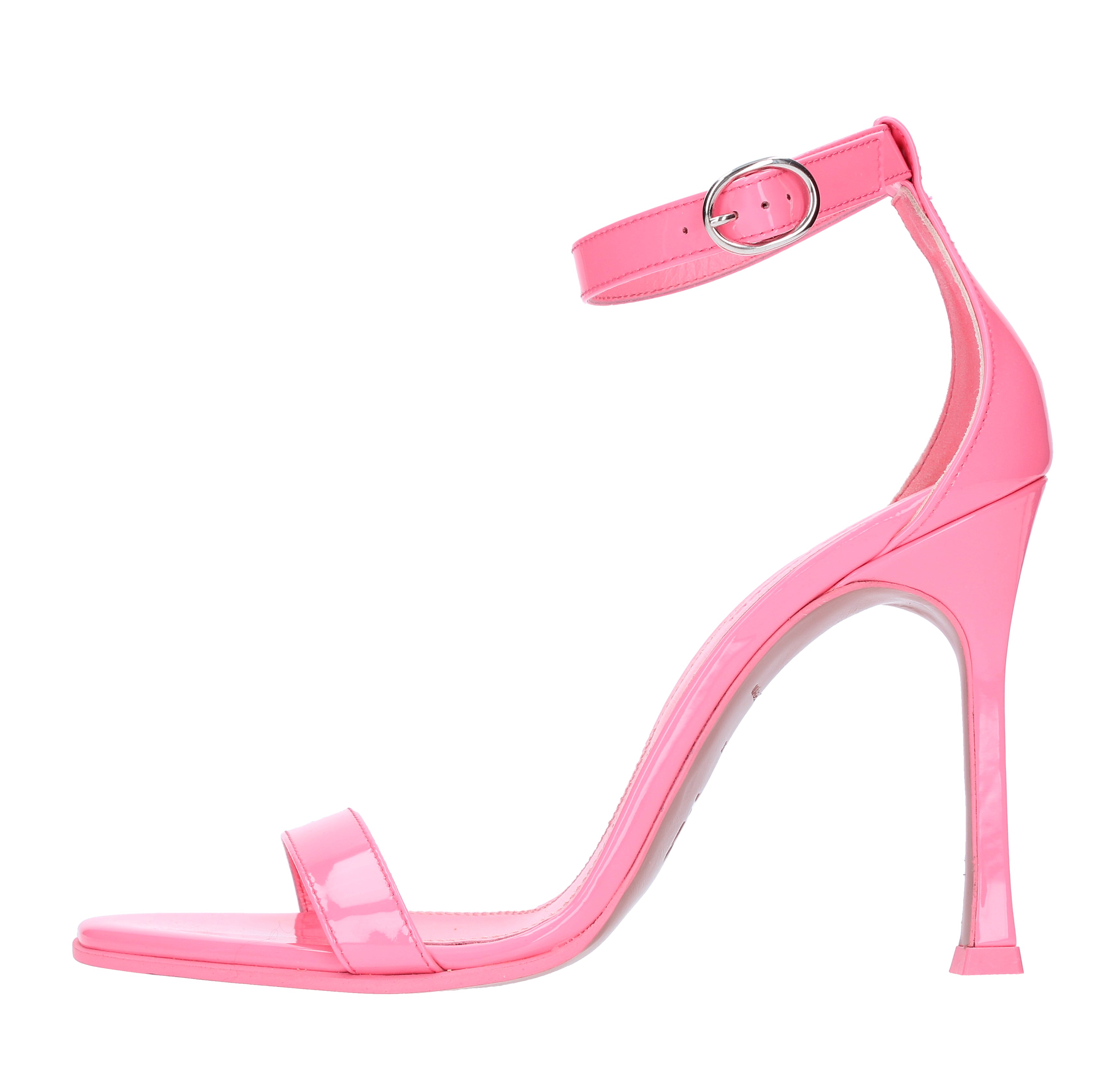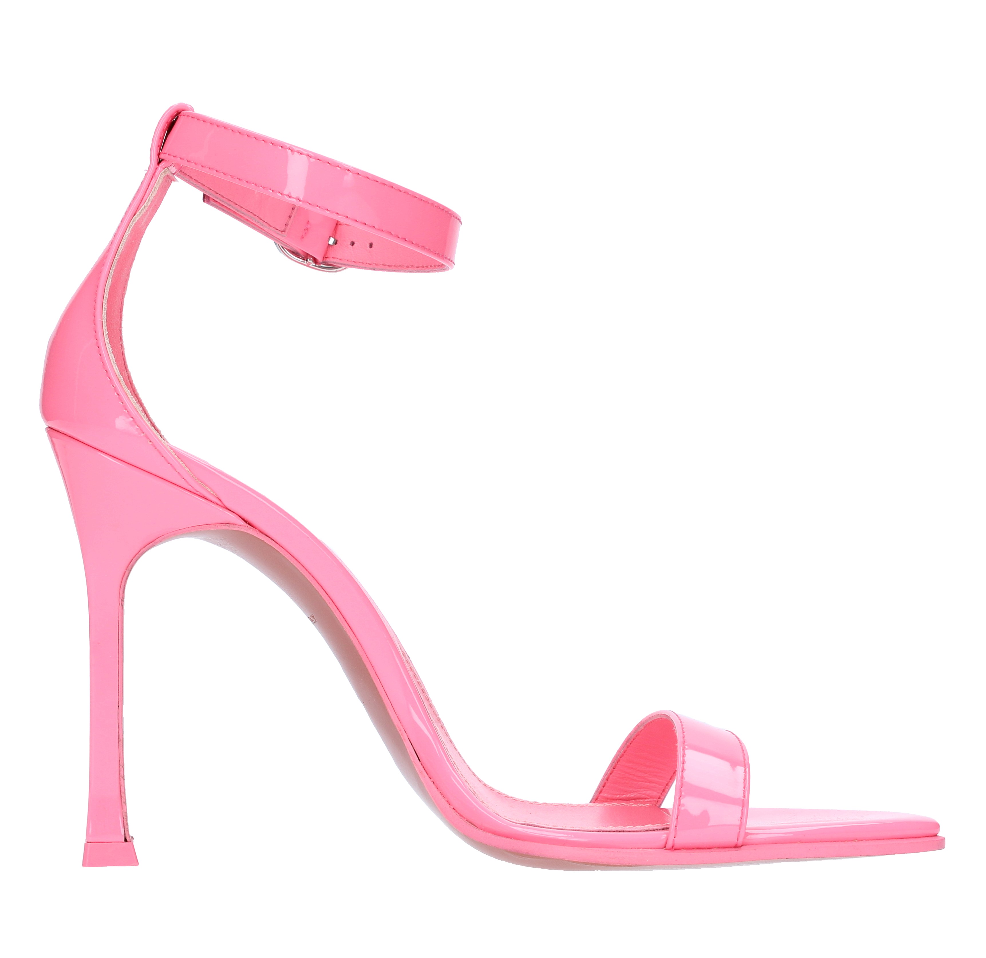 KIM sandals by AMINA MUADDI in patent leather. Ankle strap with buckle. Leather and rubber outer sole. Leather innersole.