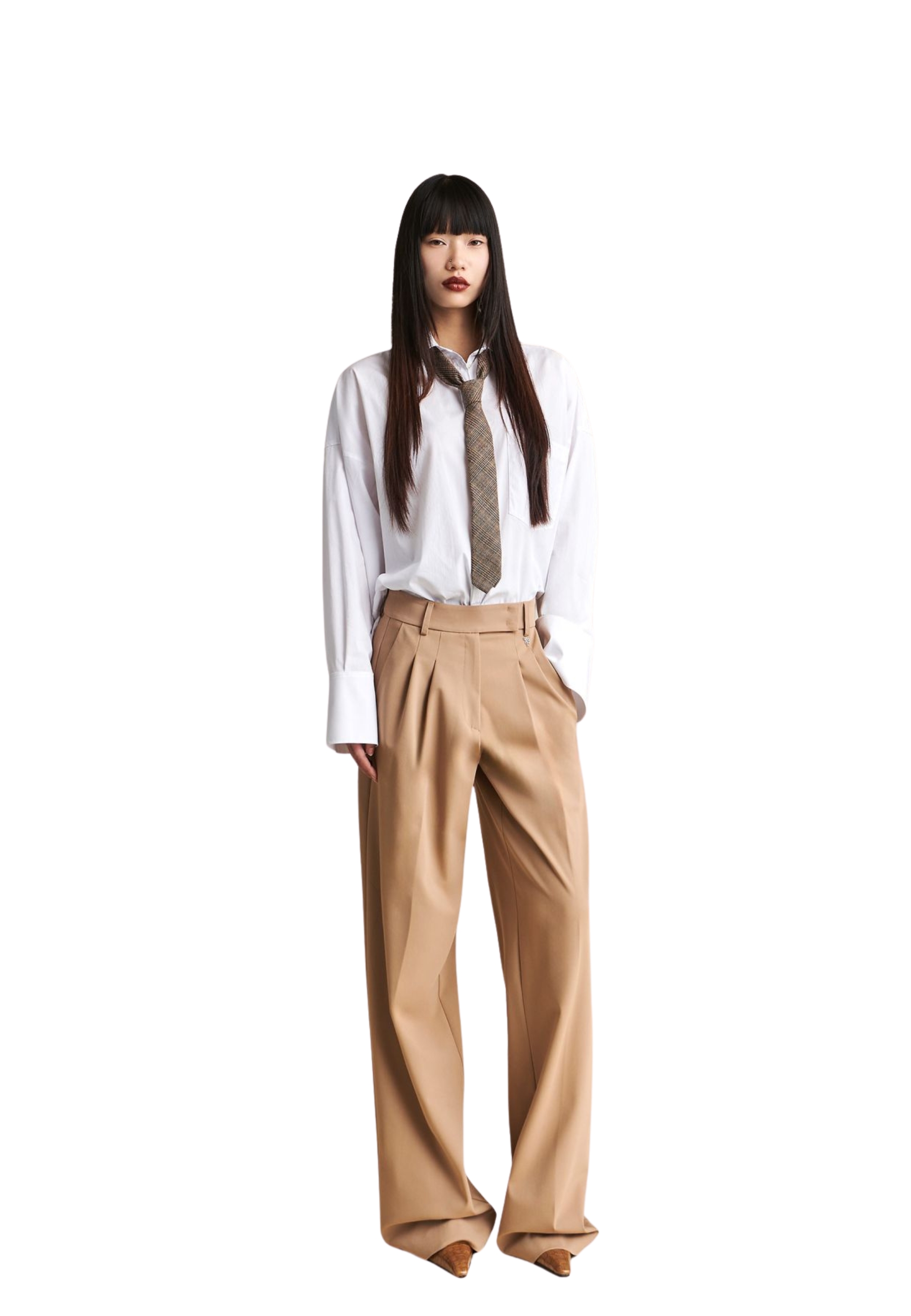 Linda baggy pants are perfect for those looking for elegance and freedom of movement. The model has wide leg with pinces and central fold that give structure to the look. The back pockets enhance the minimal and sartorial construction.