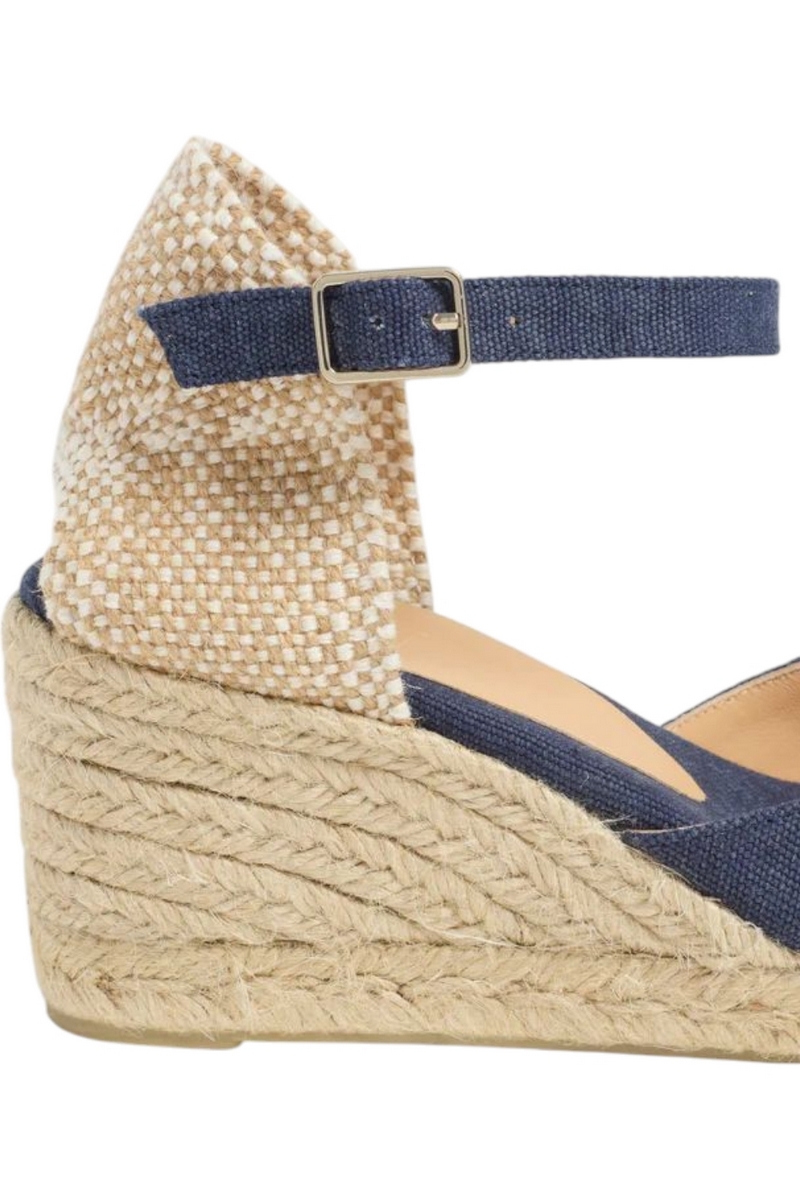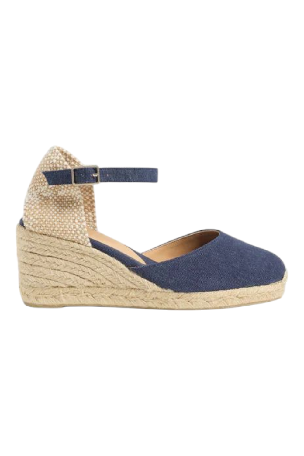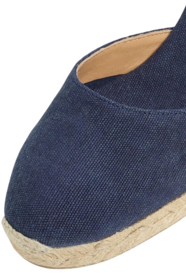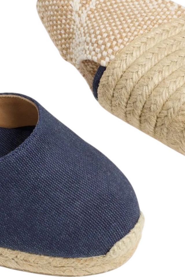 Carol espadrilles by Castaner in washed organic cotton with strap fastening, padded insole and 7 cm jute wedge. Composition: 100% polyester interior, 100% cotton exterior. 2 cm wedge, 5 cm heel.