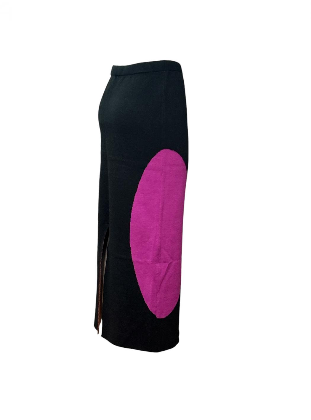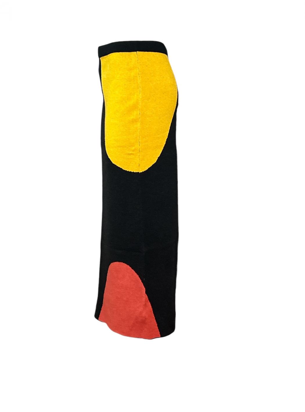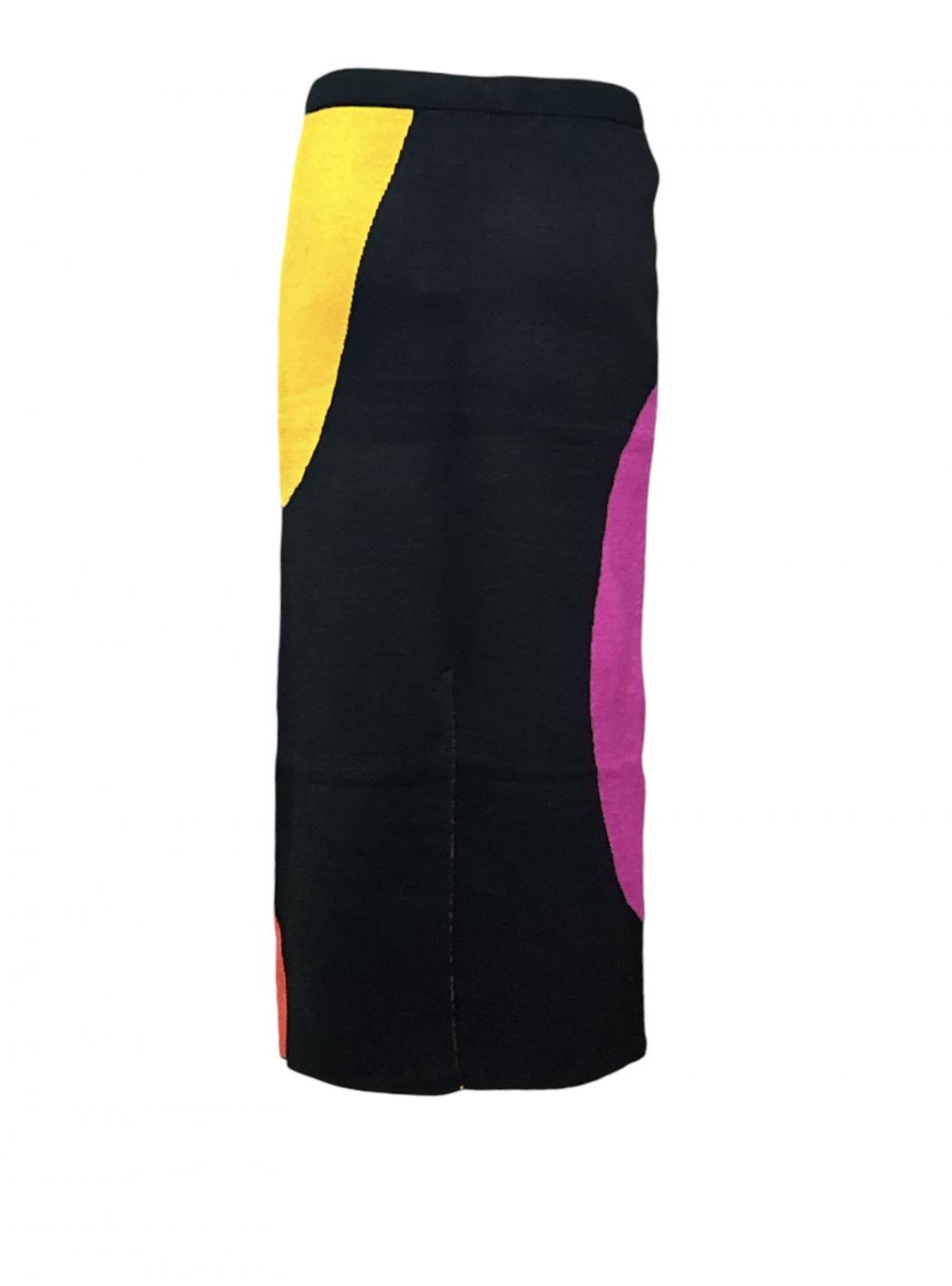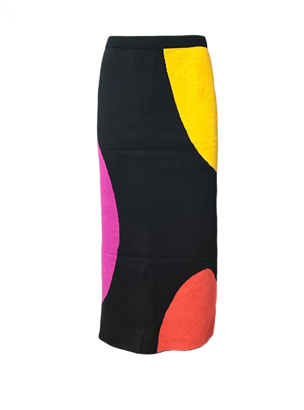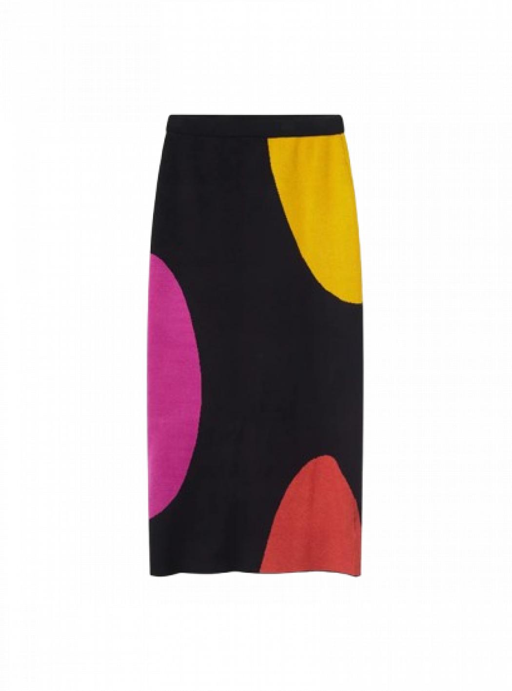 Midi skirt in black jacquard knit with print of multicolored circles. With high waist elastic waist.