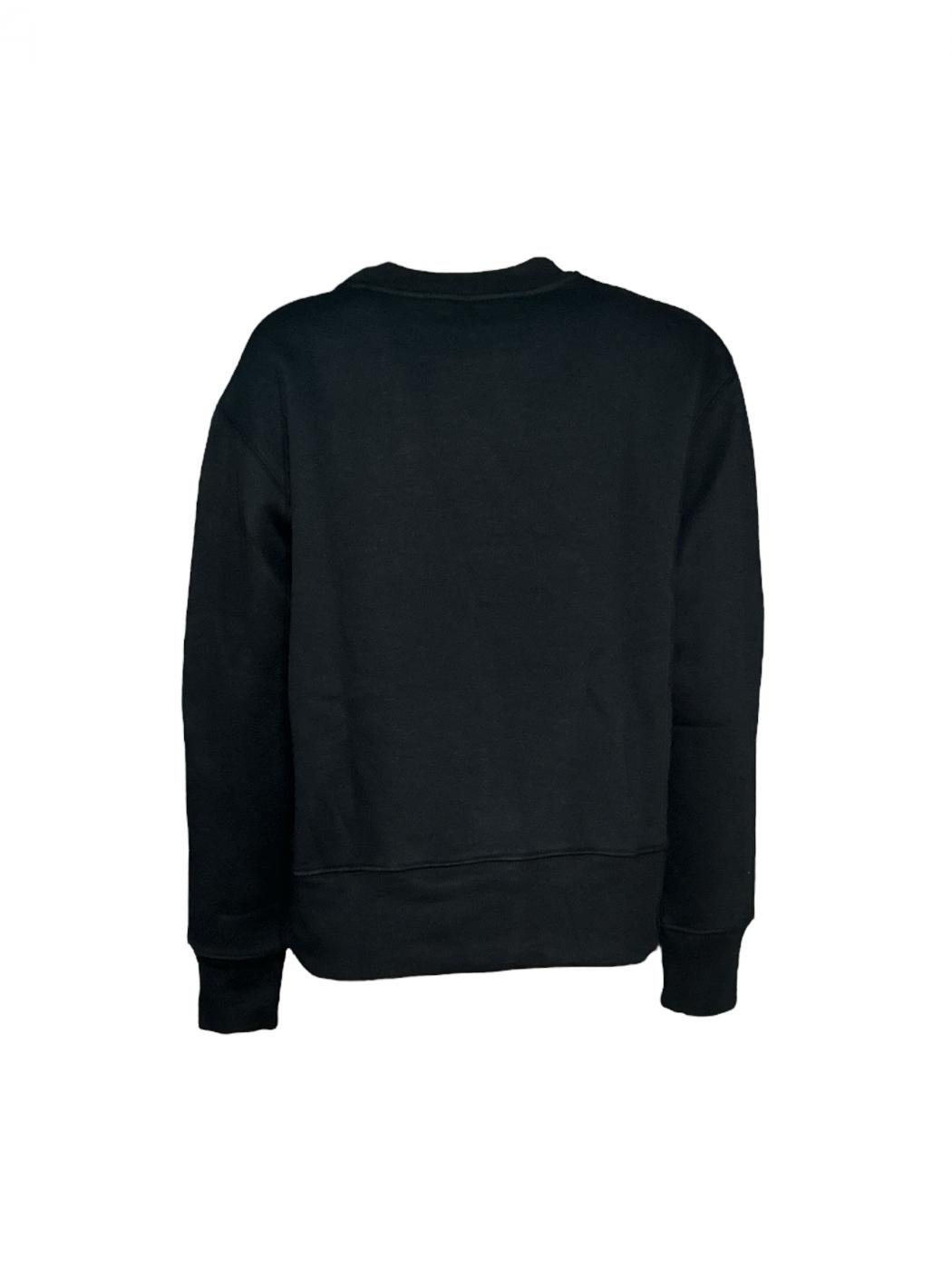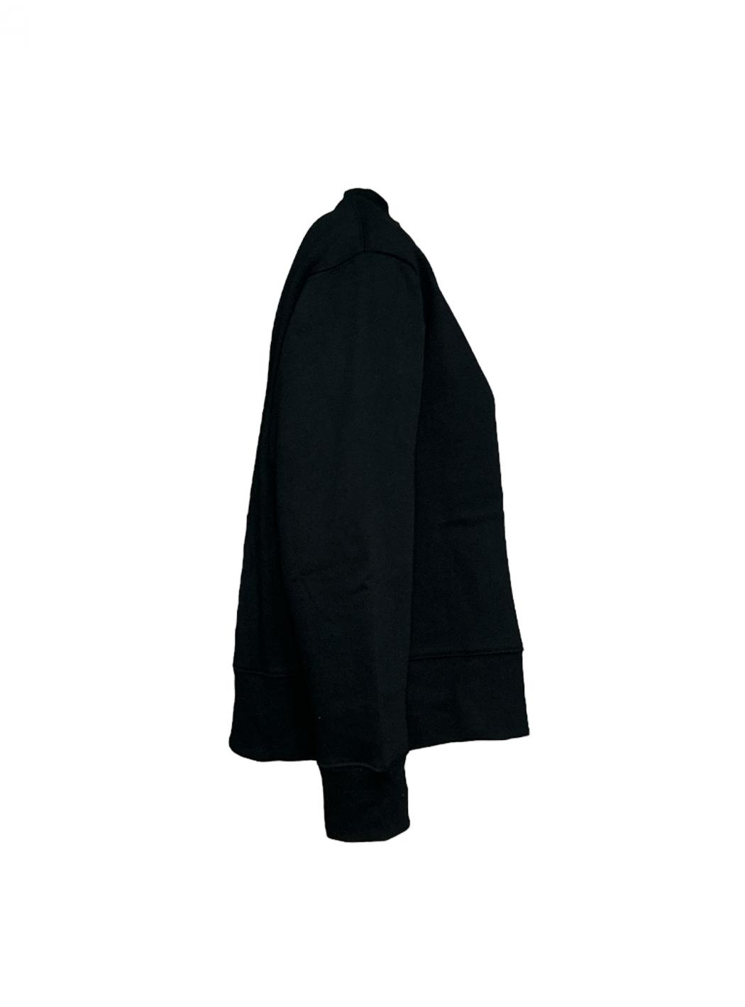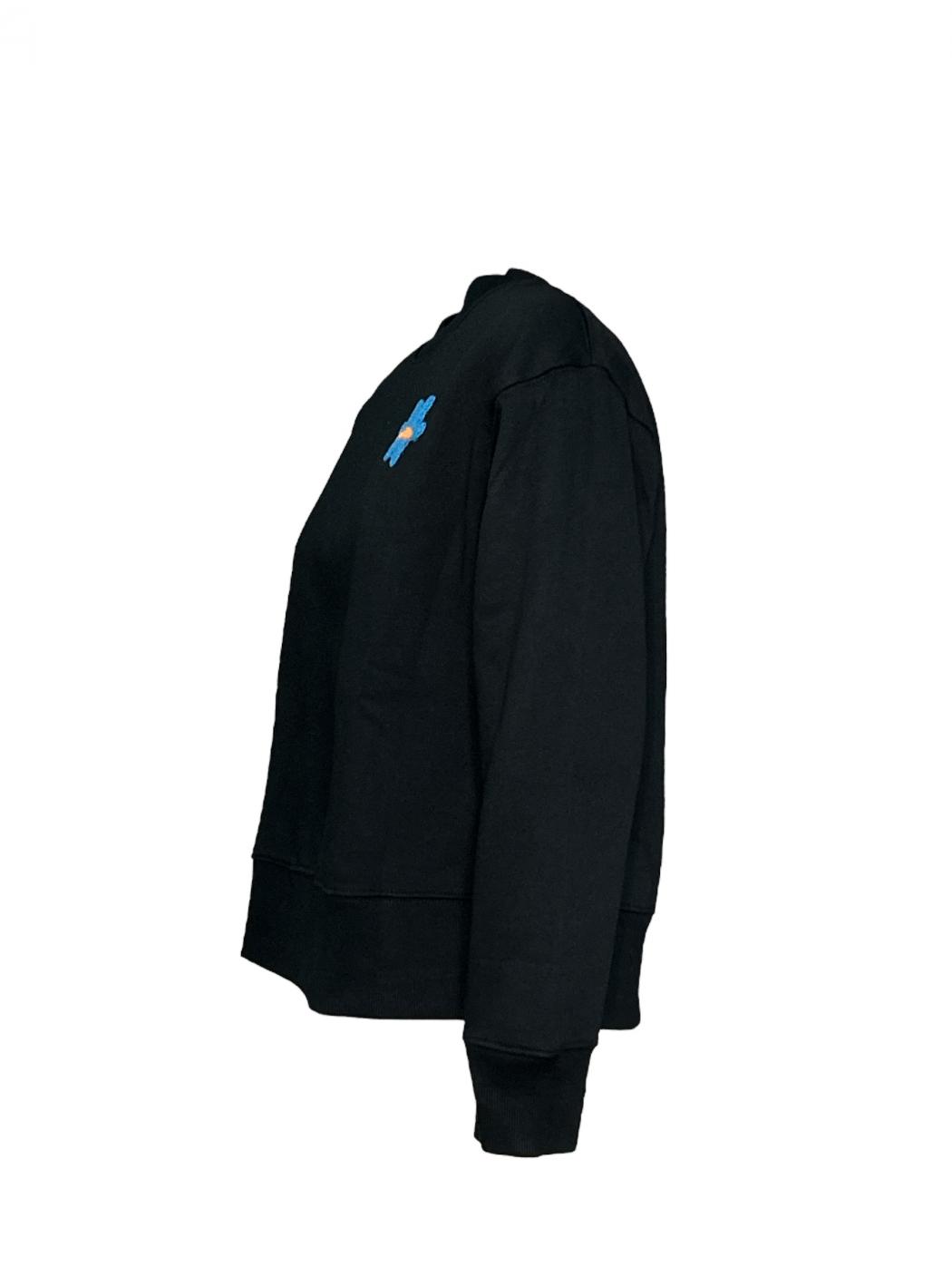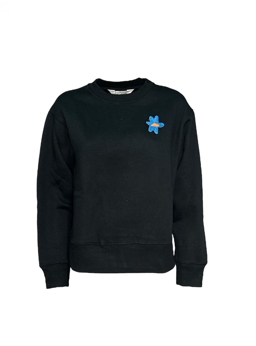 Black plush sweatshirt. With round neck and long sleeves. Detail patch in flower-shaped blue and orange towel fabric