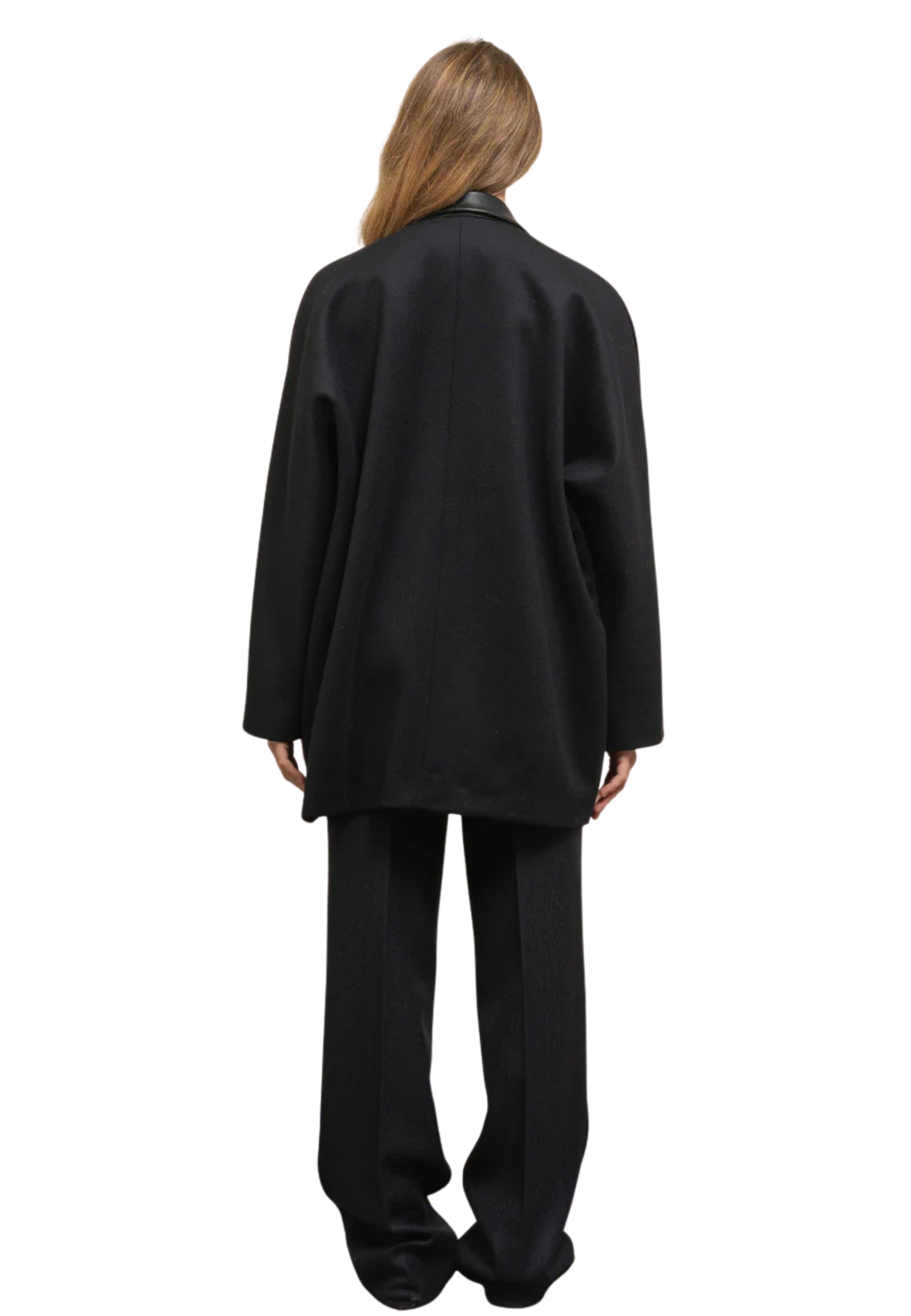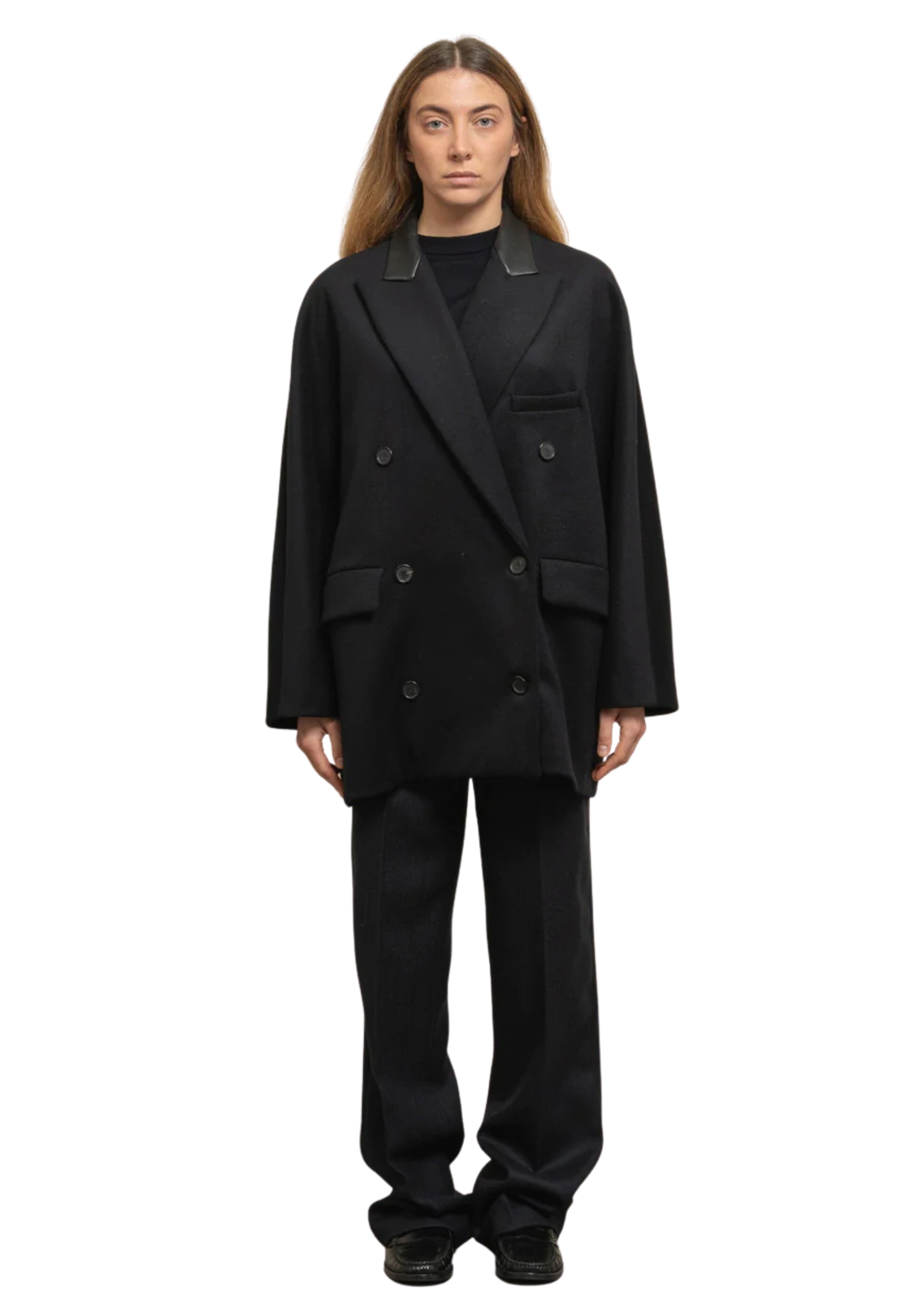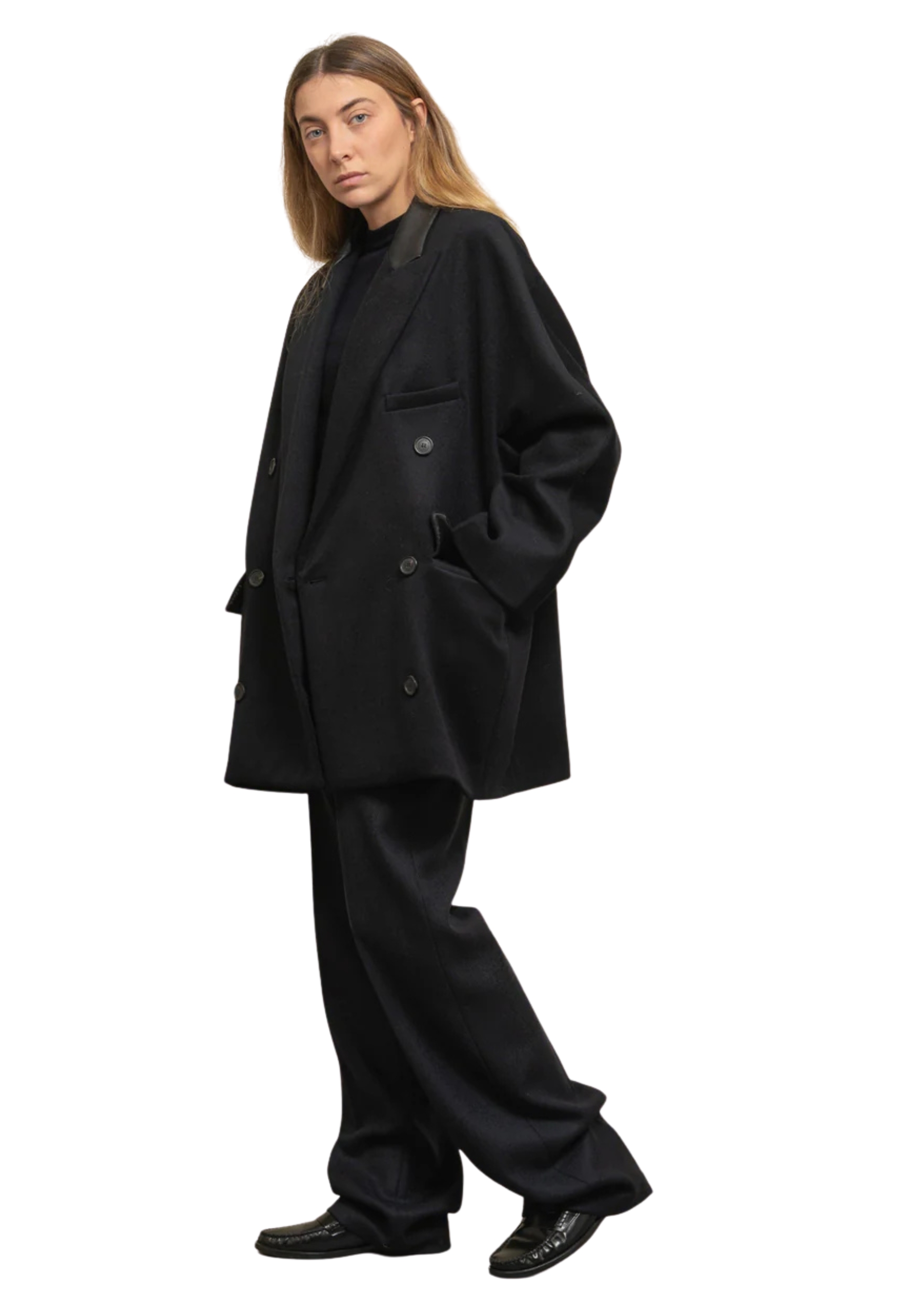 Caban over double-breasted in black cloth. Interior fully lined, straight cut, over-neck in eco-leather, lance revers, two skating pockets and one threaded front, front closure with personalized buttons, straight background
