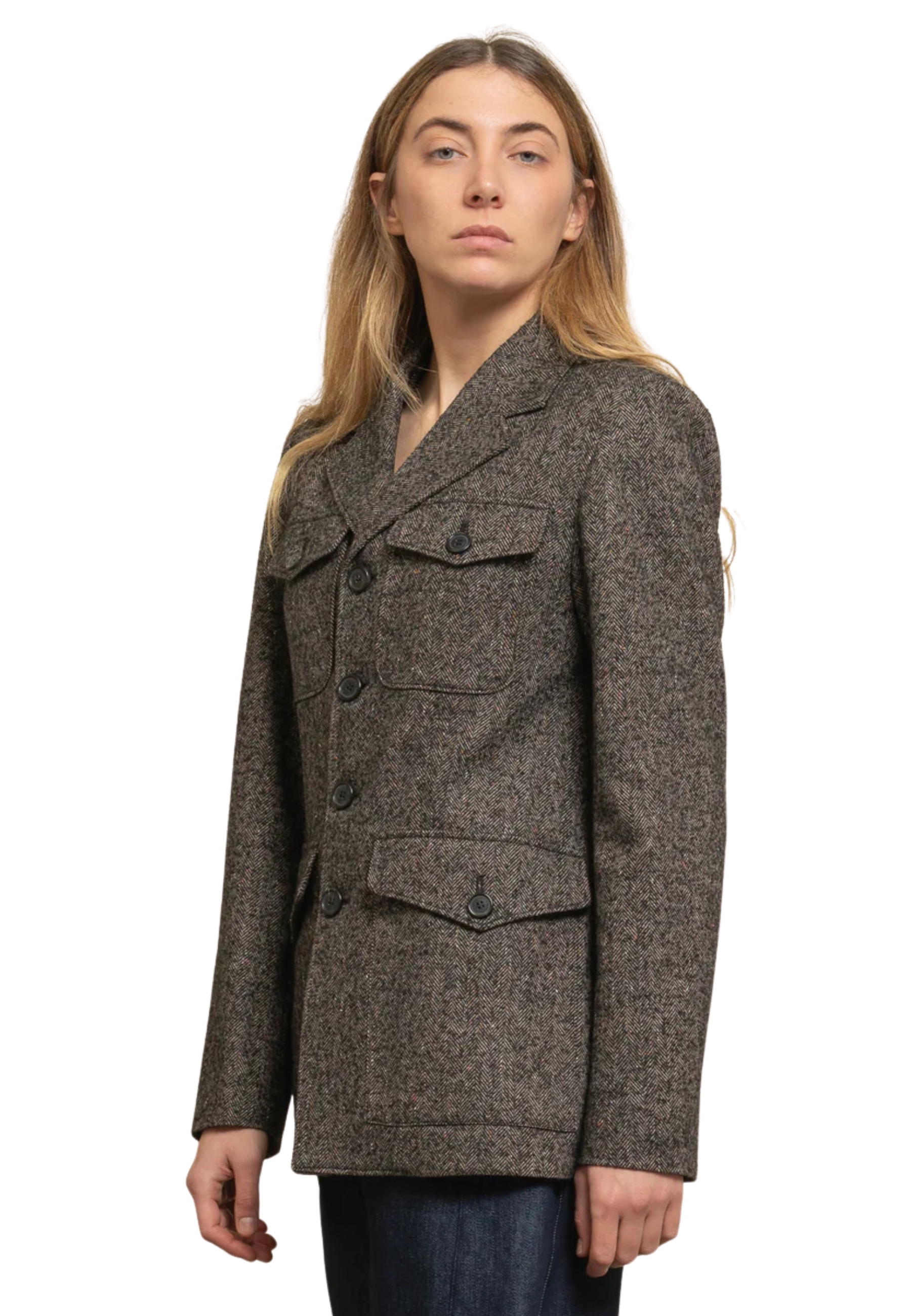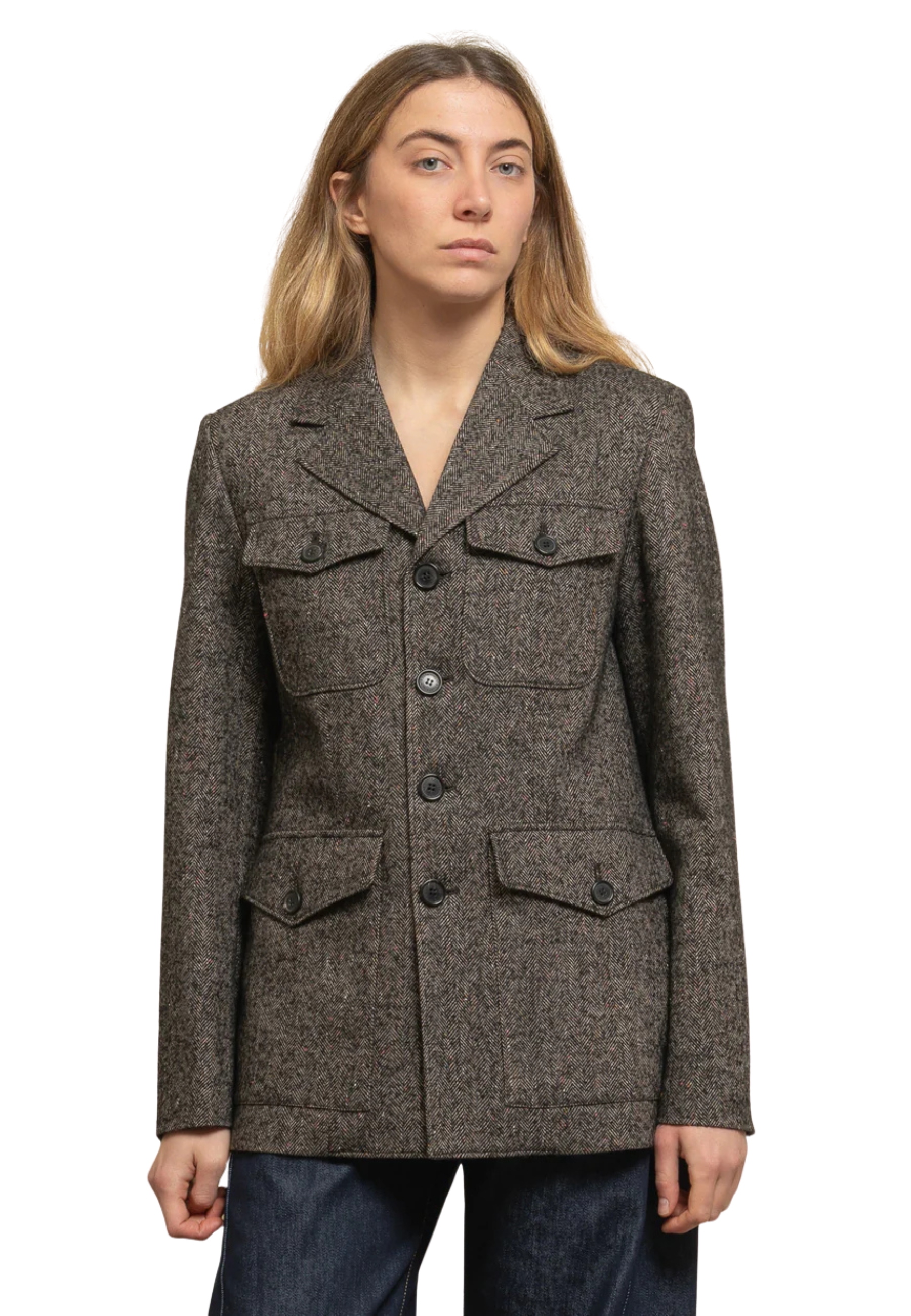 Military style jacket in barbed fabric. Fully lined interior, padded shoulder straps, classic revers, front closure with buttons, flap pockets