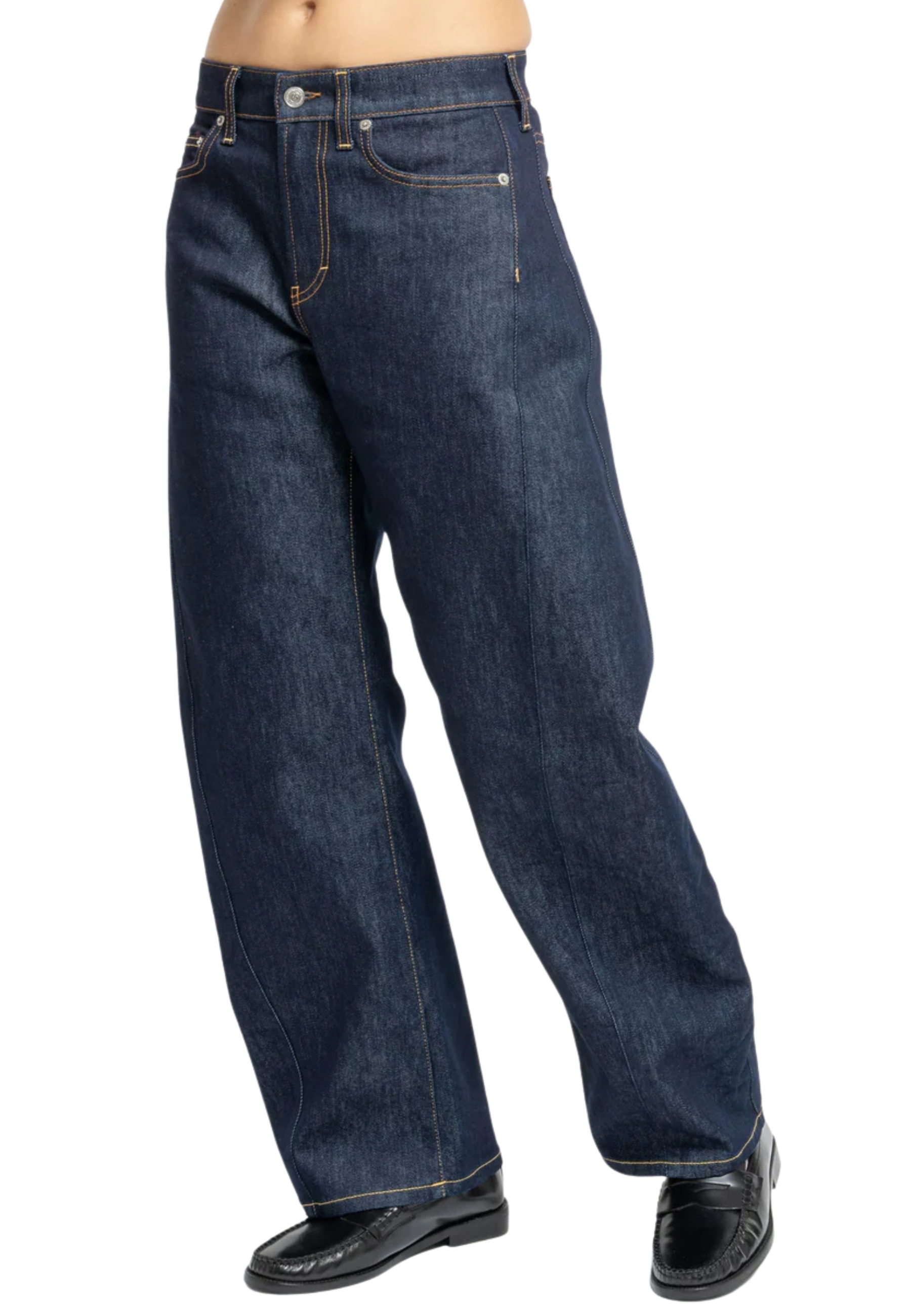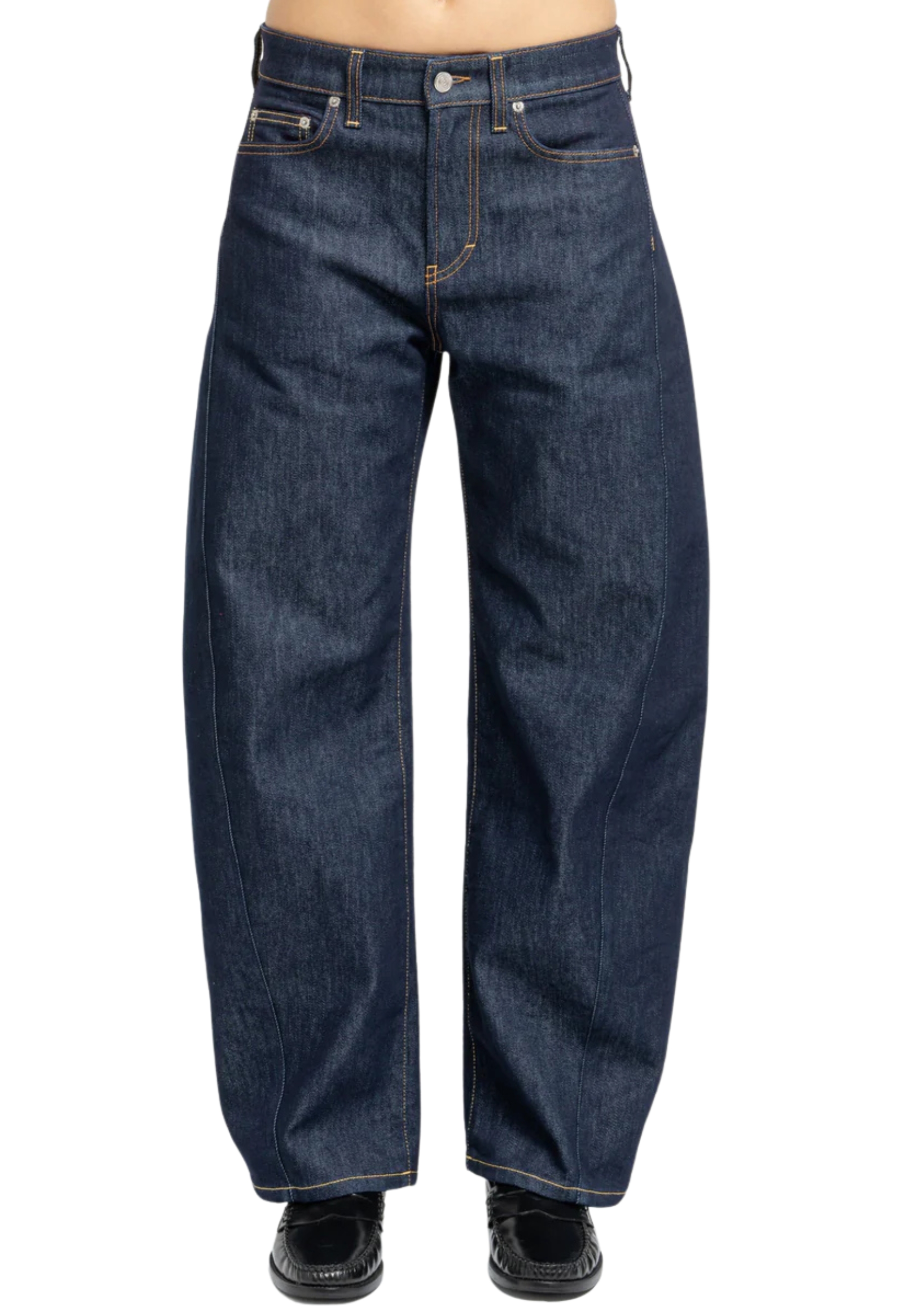 Classic five-pocket jeans, medium waist, loops, closure with personalized button and zip, logo label, balloon leg, crop, unwashed effect, raw denim