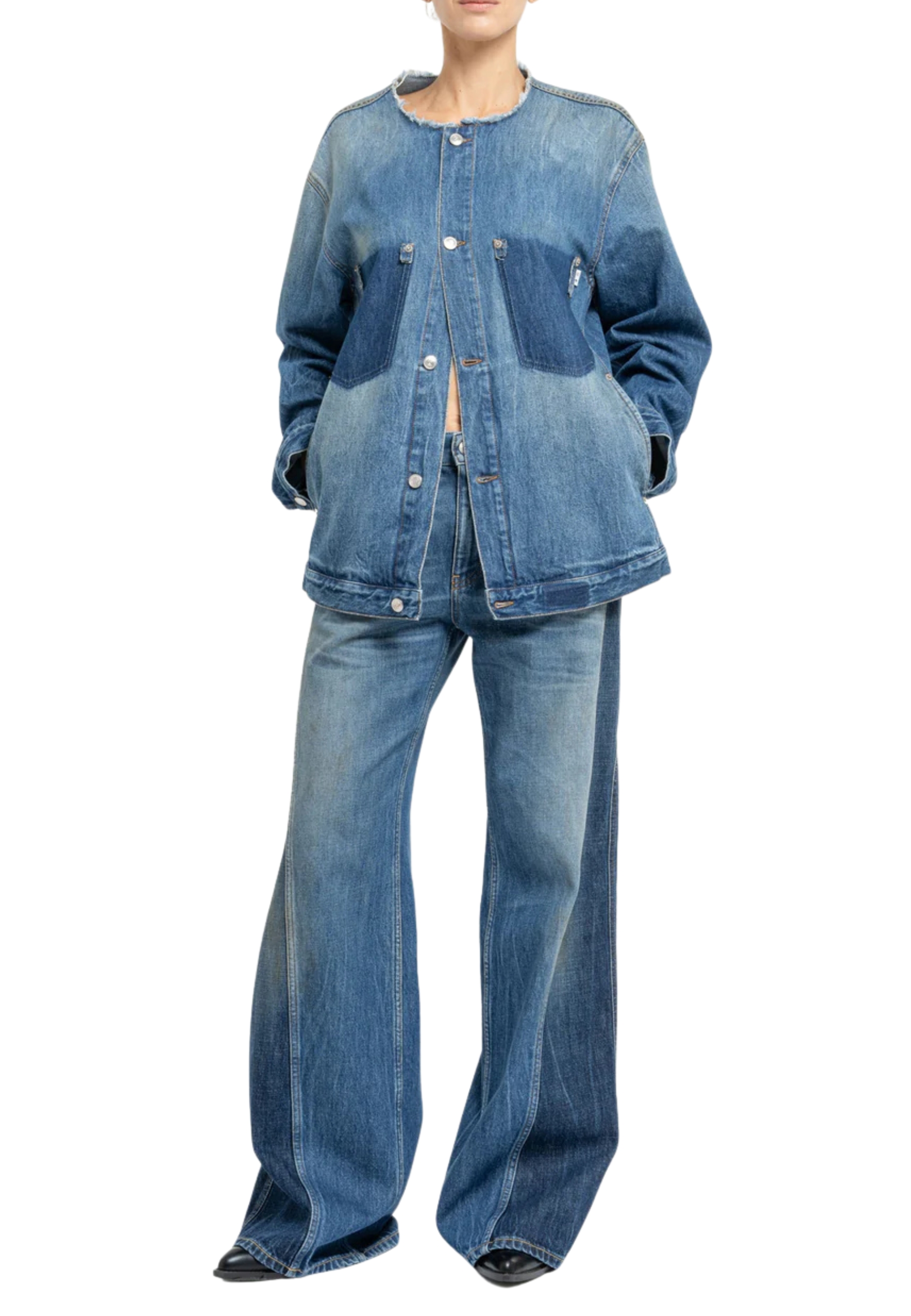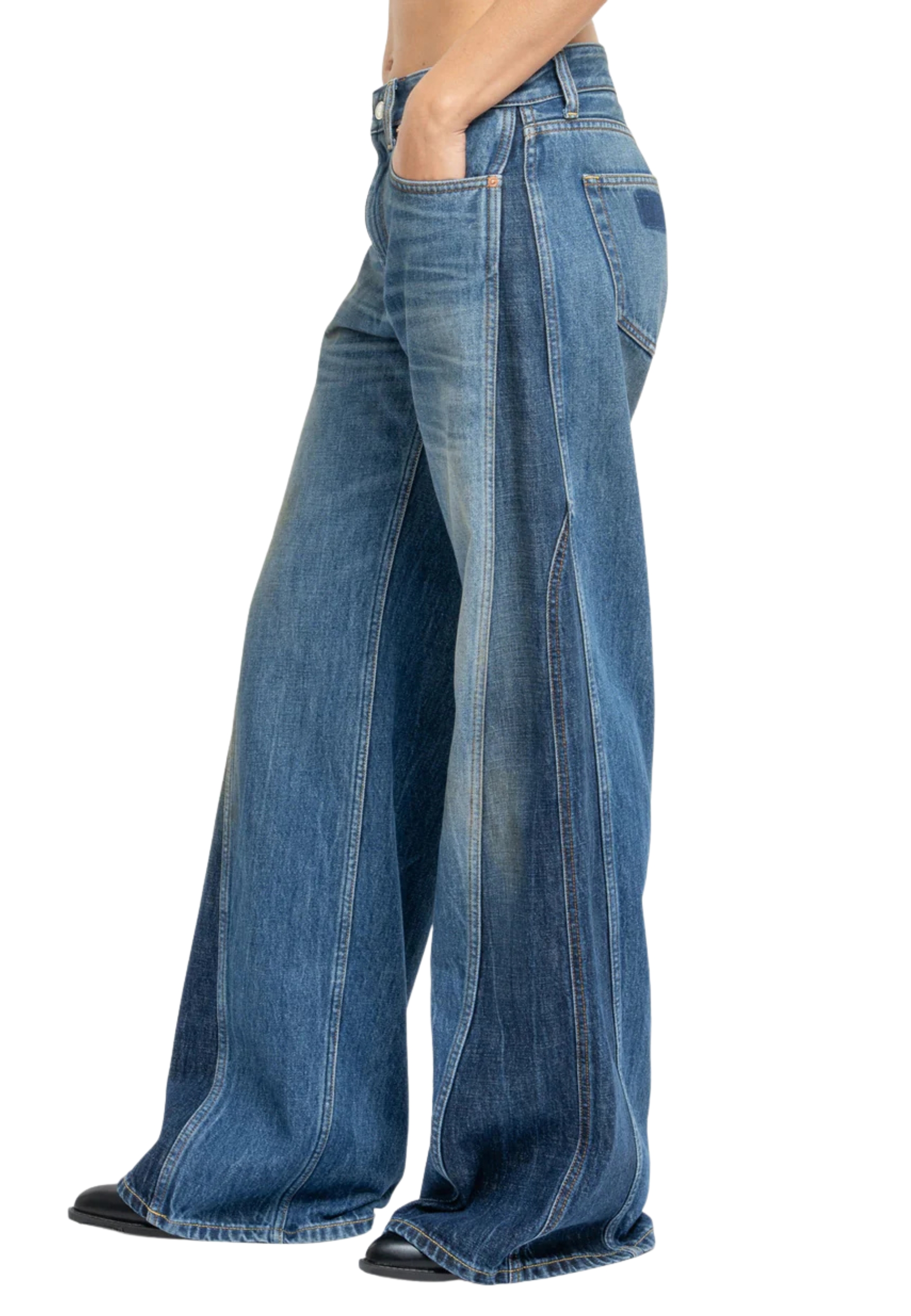 Wide leg jeans in firm denim. Classic design five pockets, loops, closure with personalized button and zip, logo label, average waist, side inserts, full length, blue denim, medium washed effect with mustache