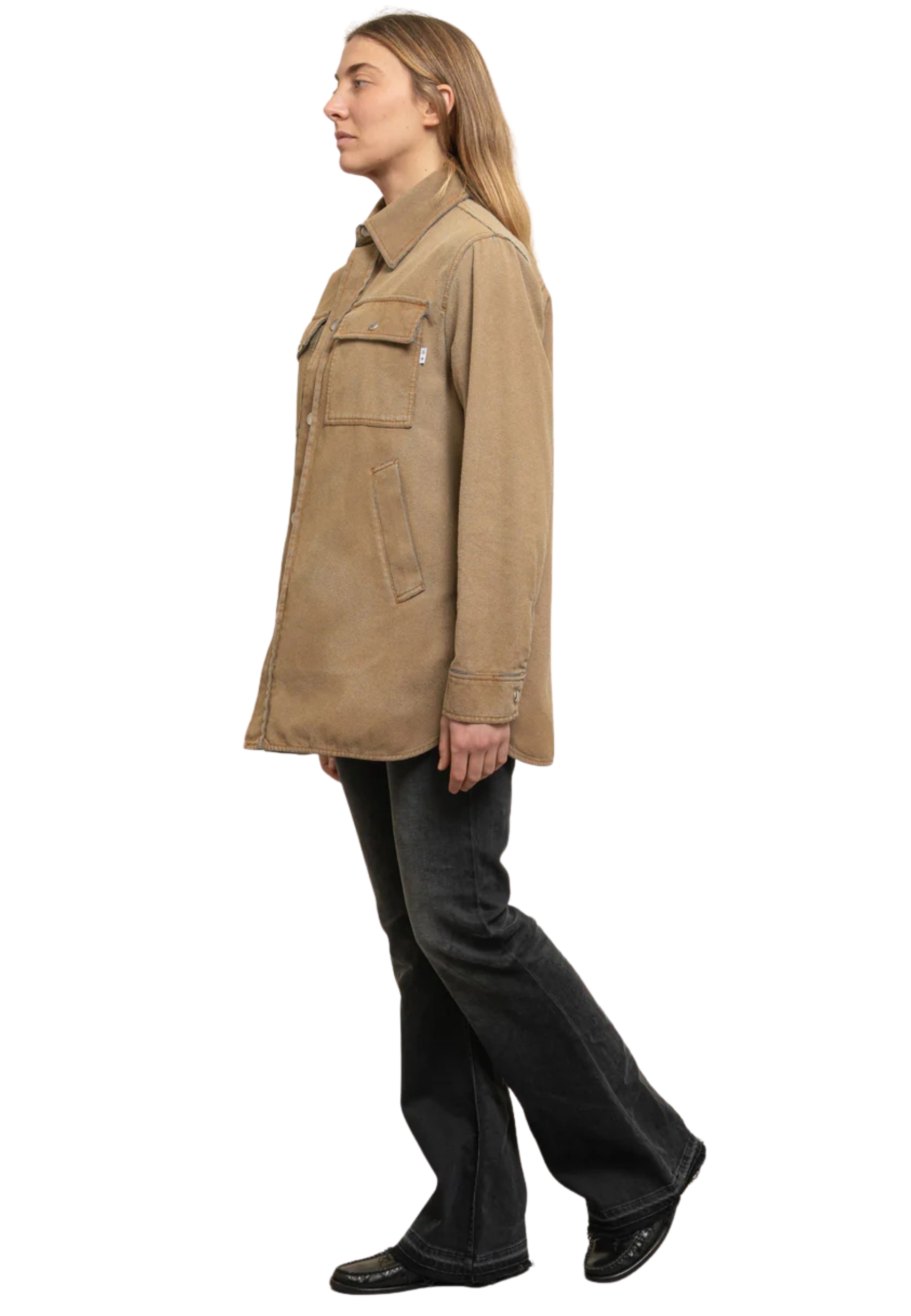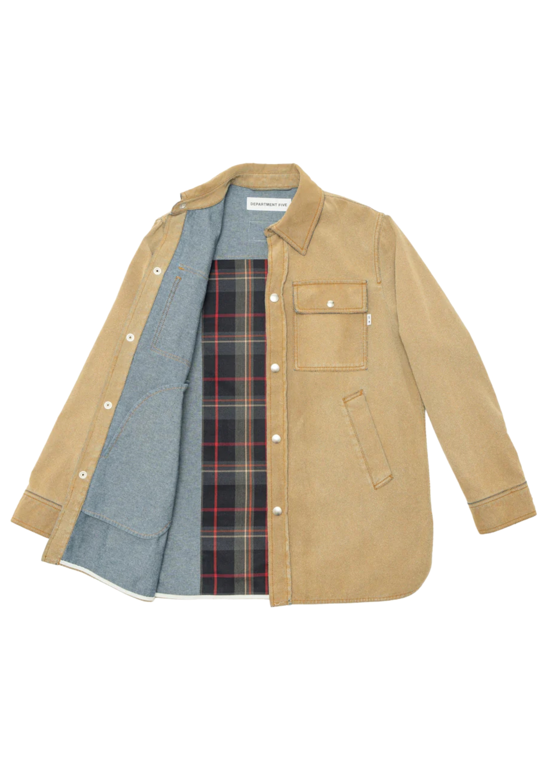 Flesh denim shirt jacket. Classic collar, front closure with pressure buttons, front pockets with skate, side pockets, long sleeves, cuffs with pressure button, logo label, floppy denim, vintage effect, tartan interior application