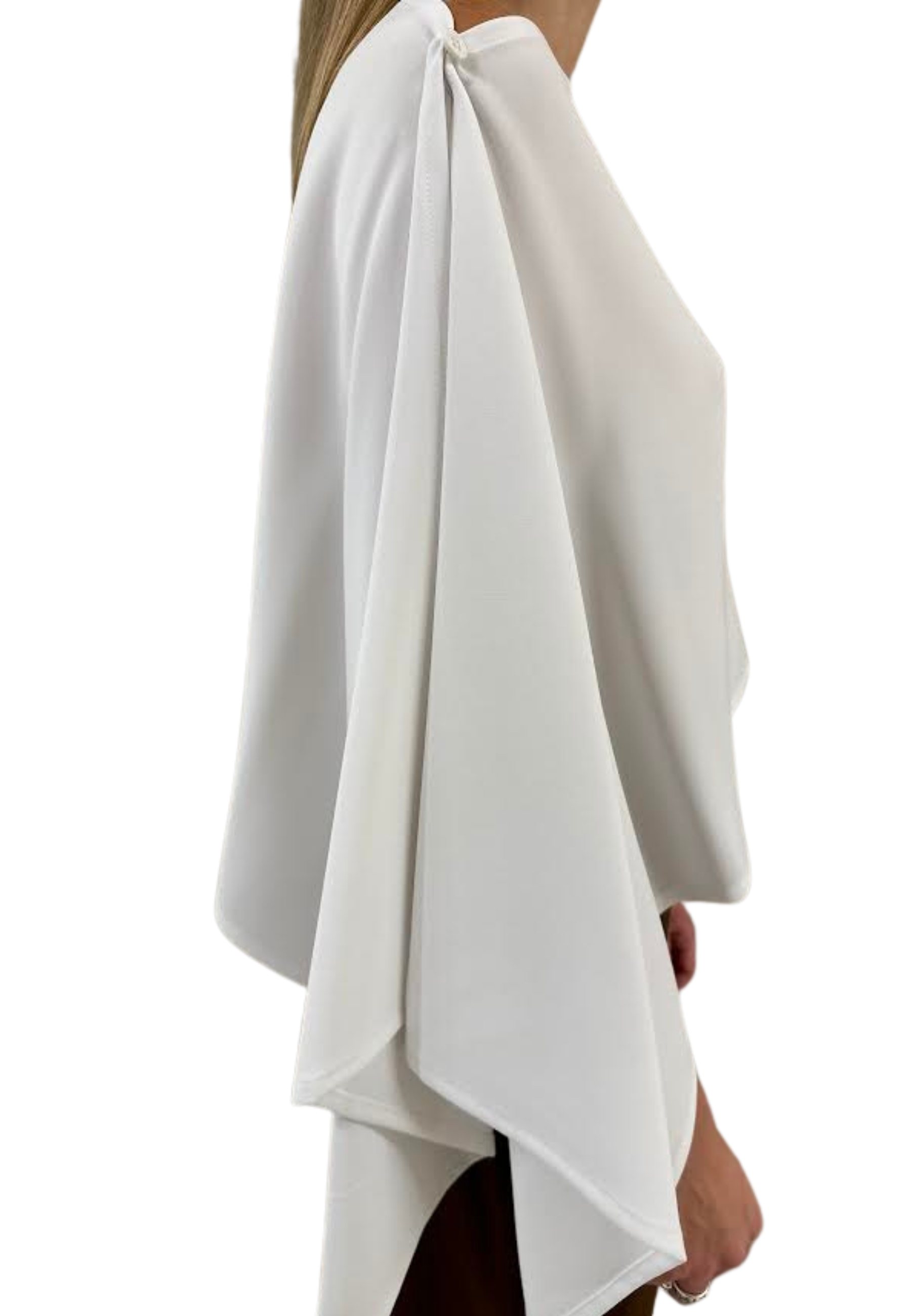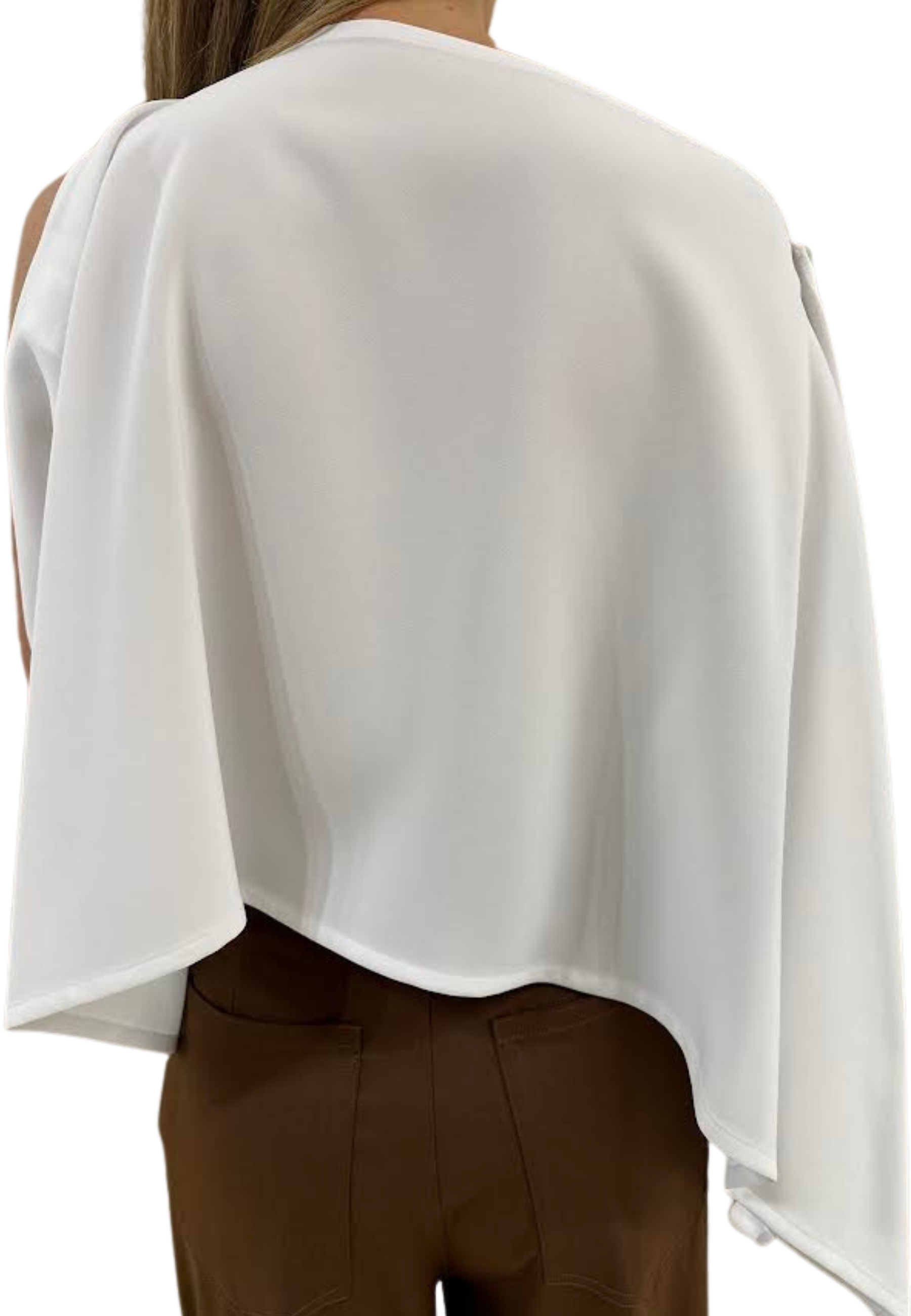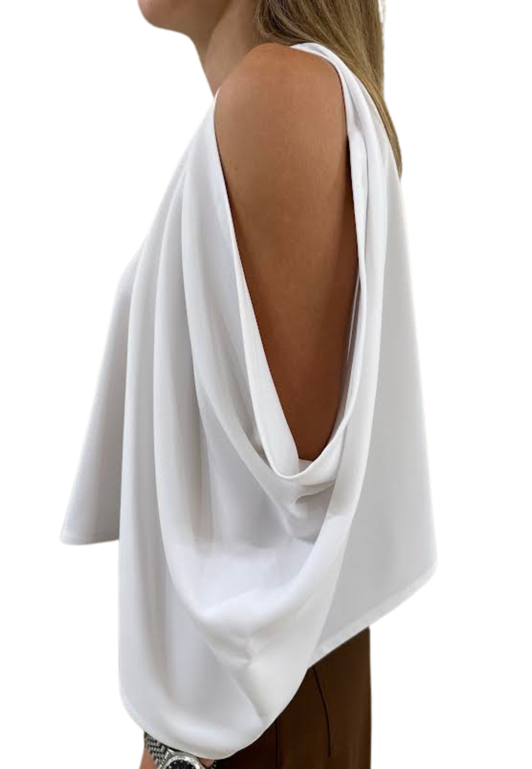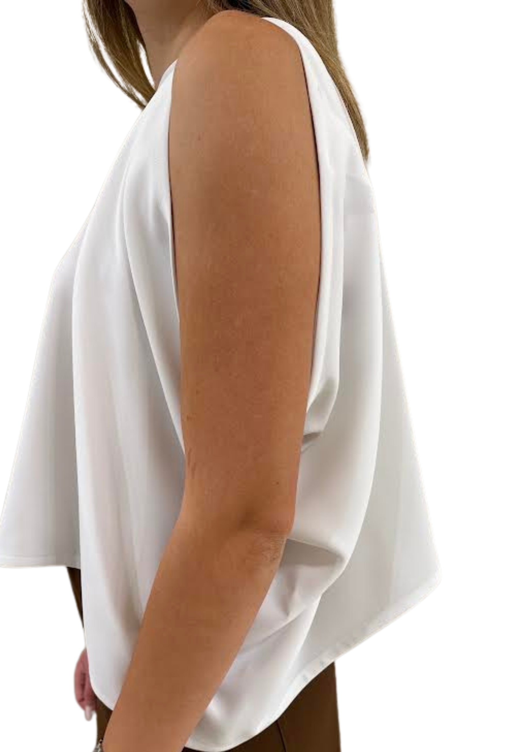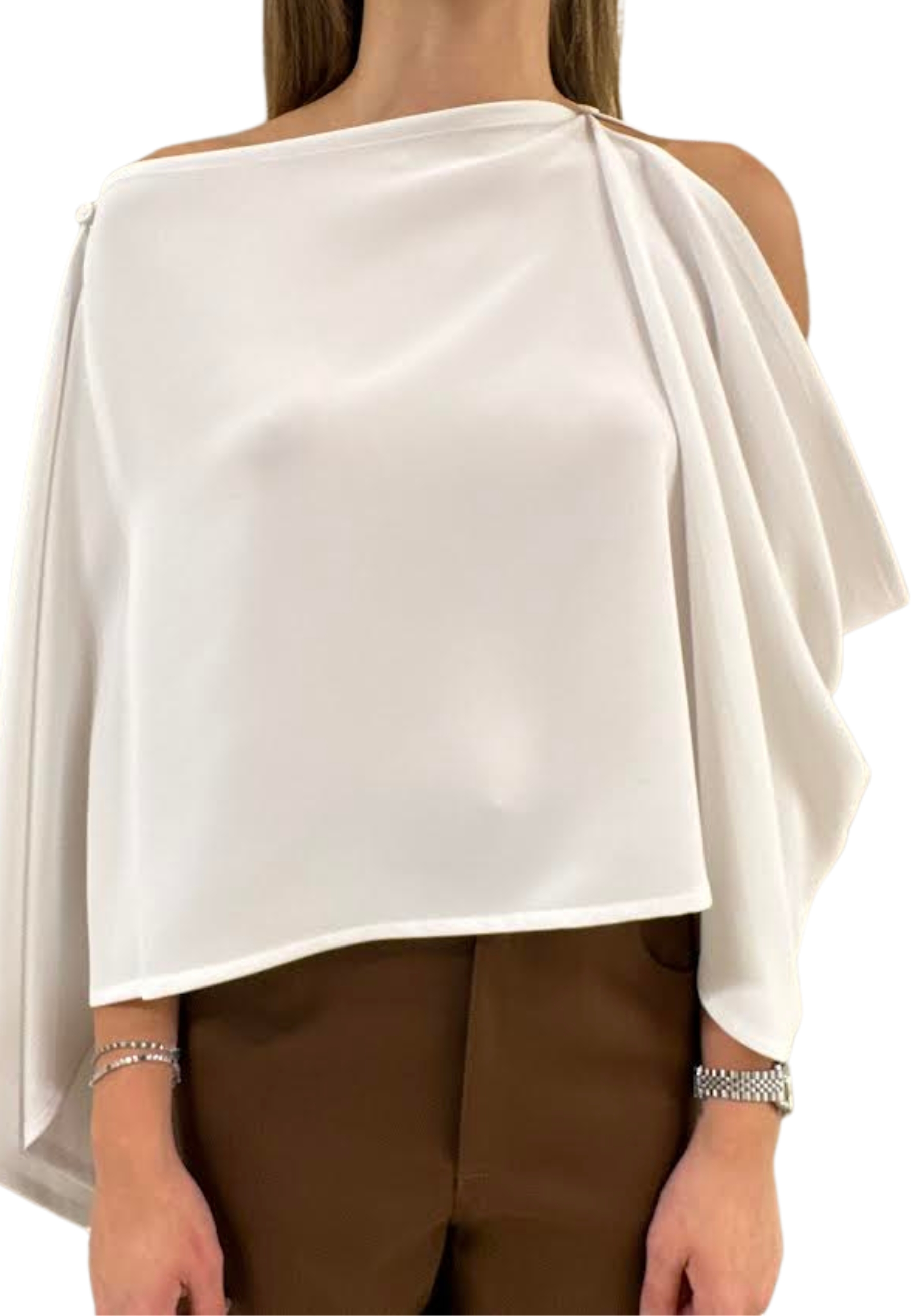 Elegant silhouette in light and fluid fabric, with asymmetric design with open arm and soft drapery, perfect to complete refined and sophisticated look.