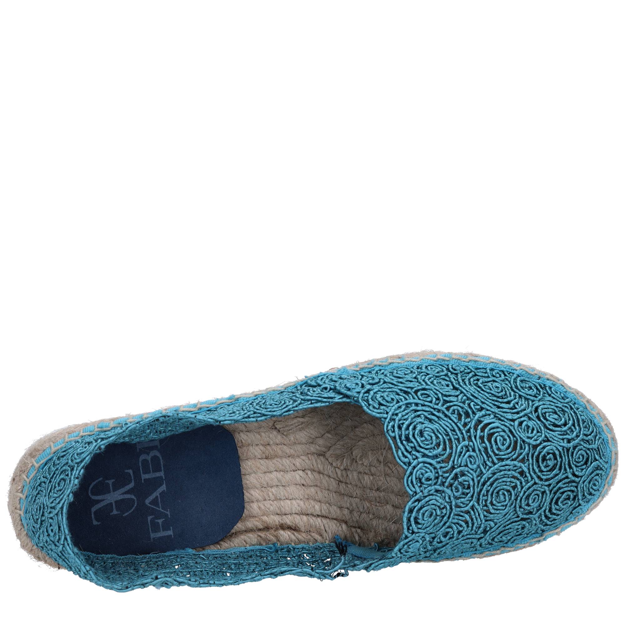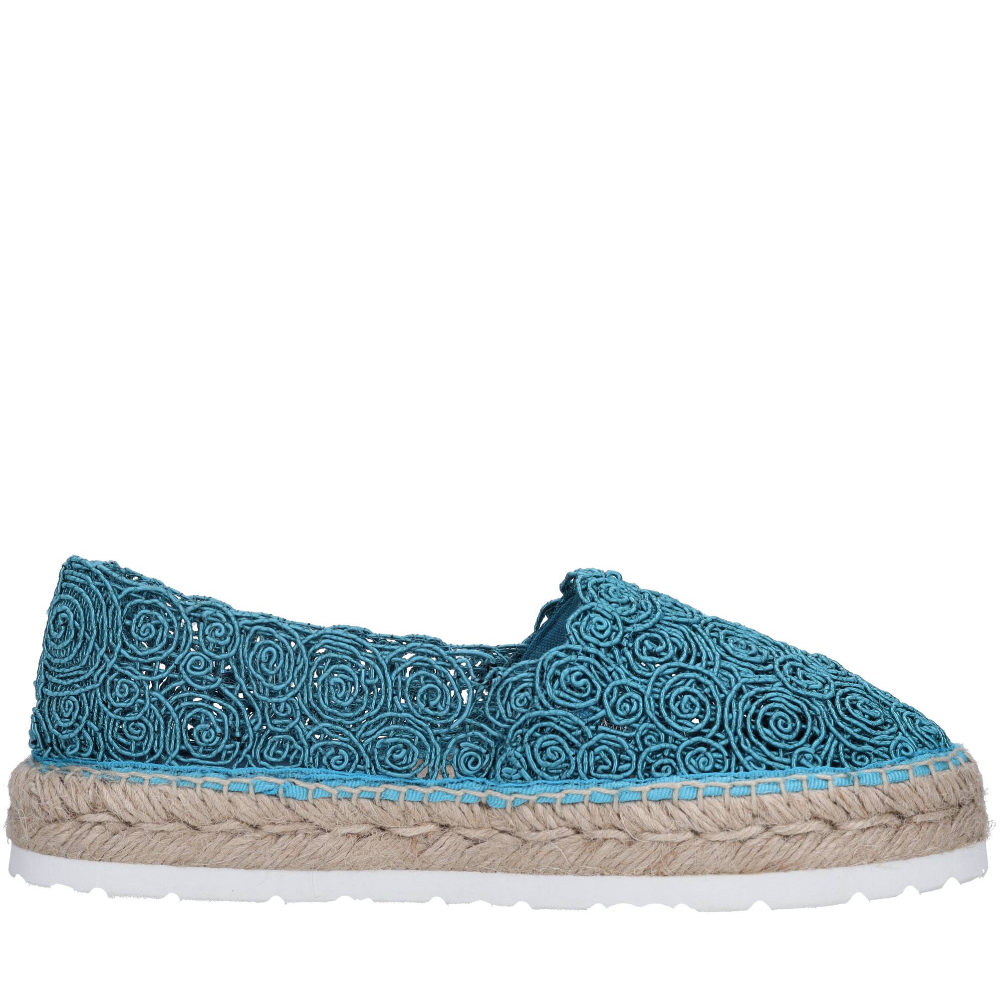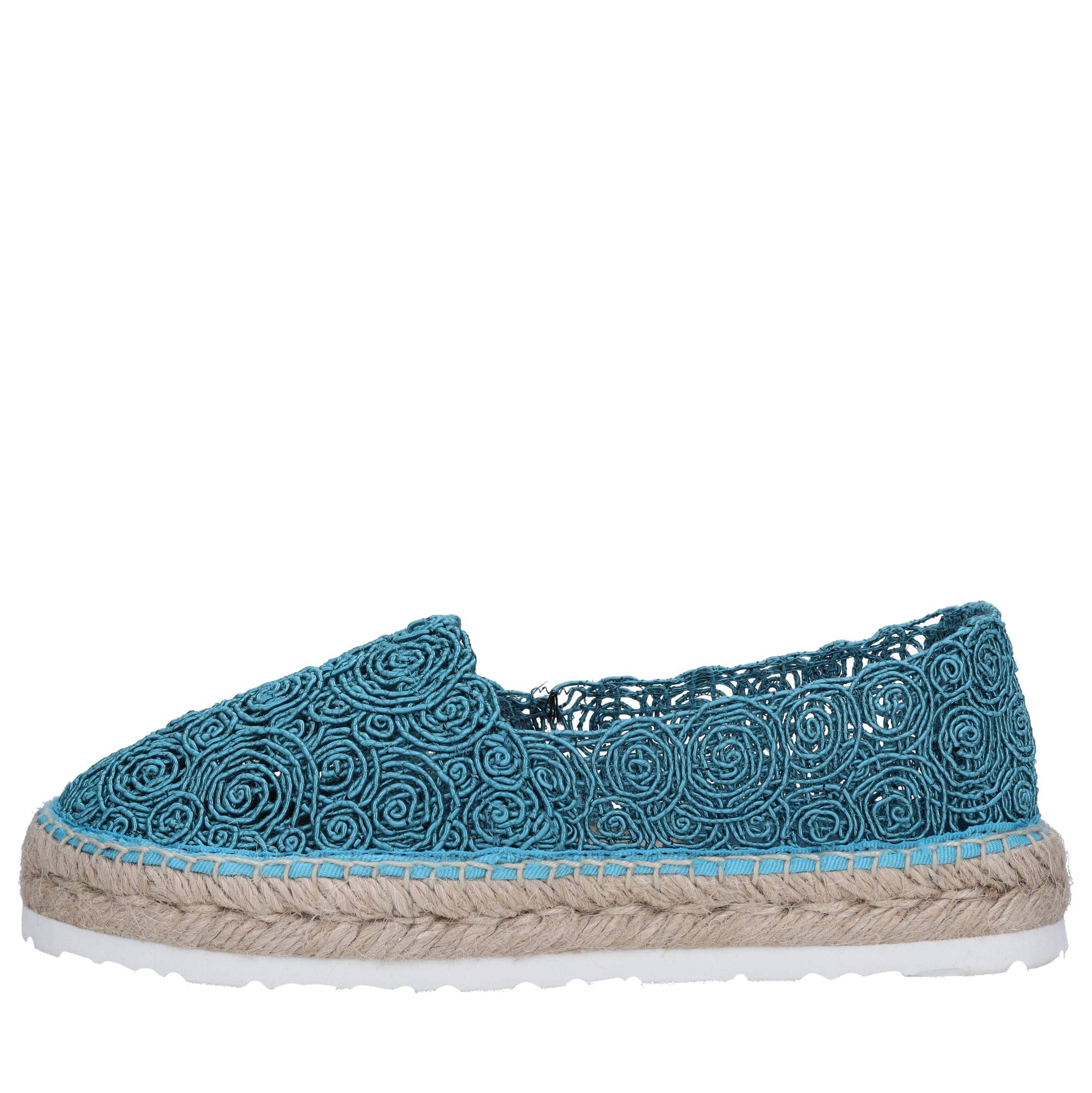 Fabric slip-on. Perforated. Rubber outsole. Fabric and rope inner upper.