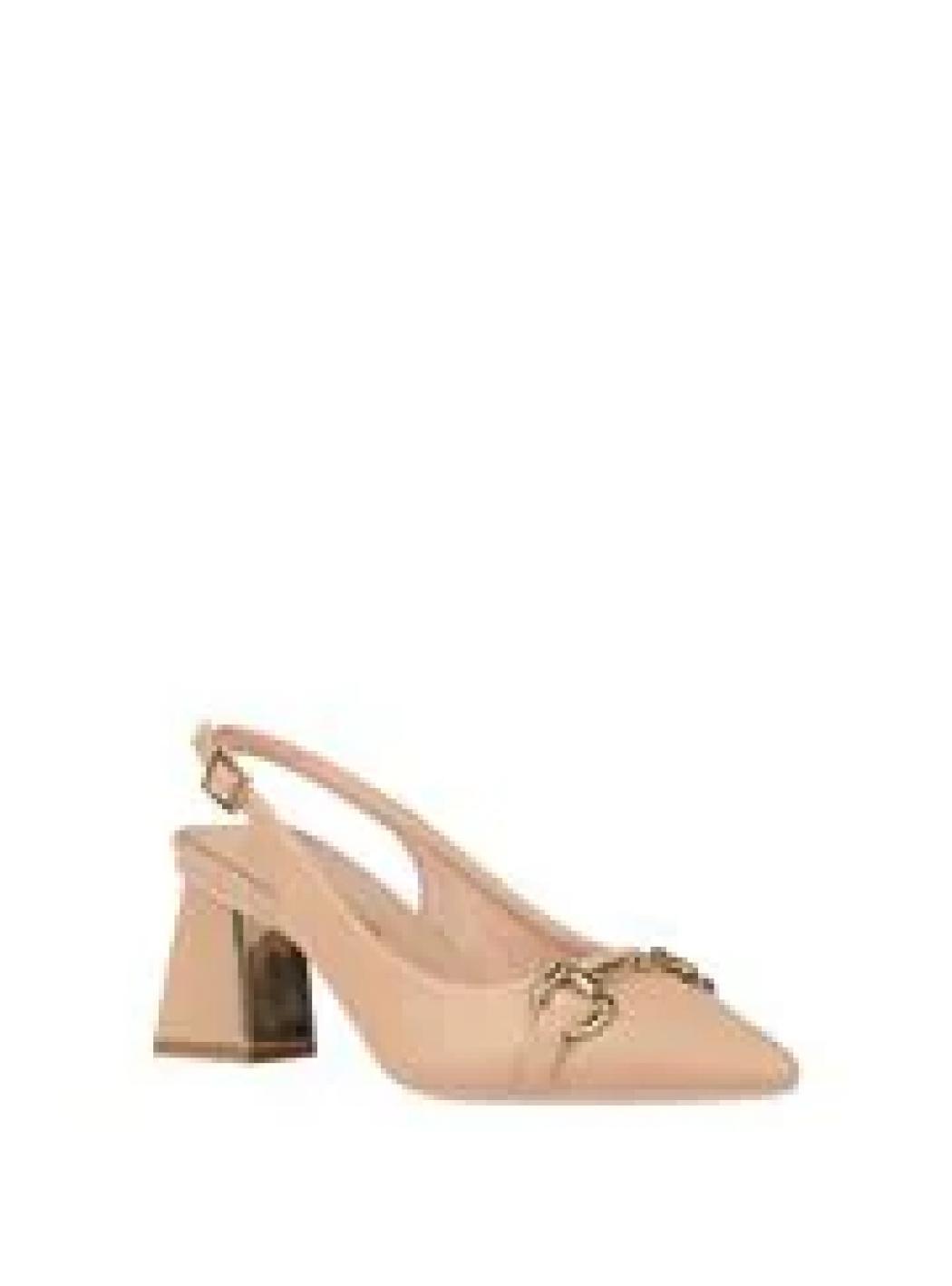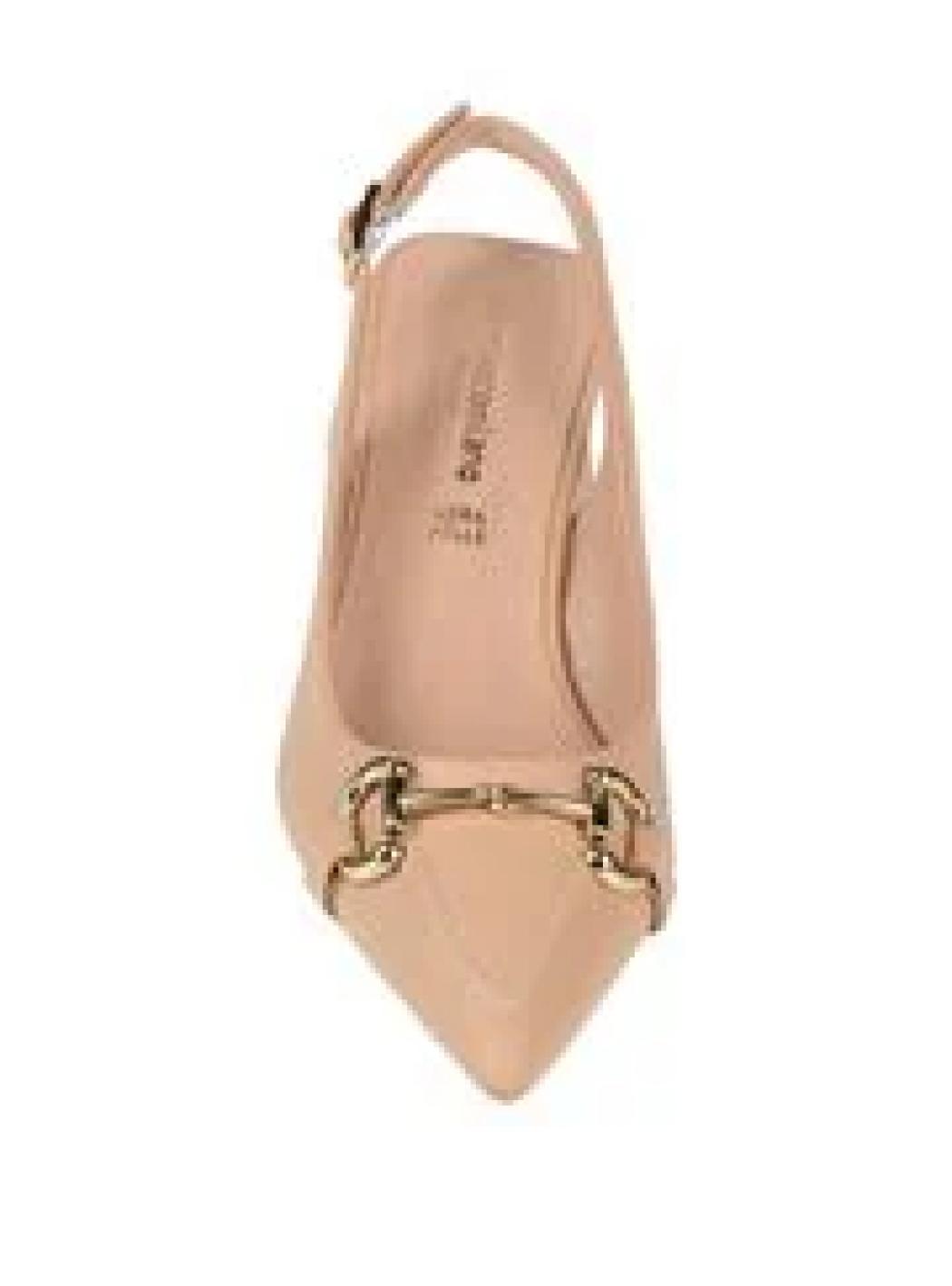 Leather with metal applications, solid leather interior, clasp with buckle, narrow tip, geometric heel, heel covered with 7.5 cm, rubber sole, contains non textile parts of animal origin, decolleté slingback.