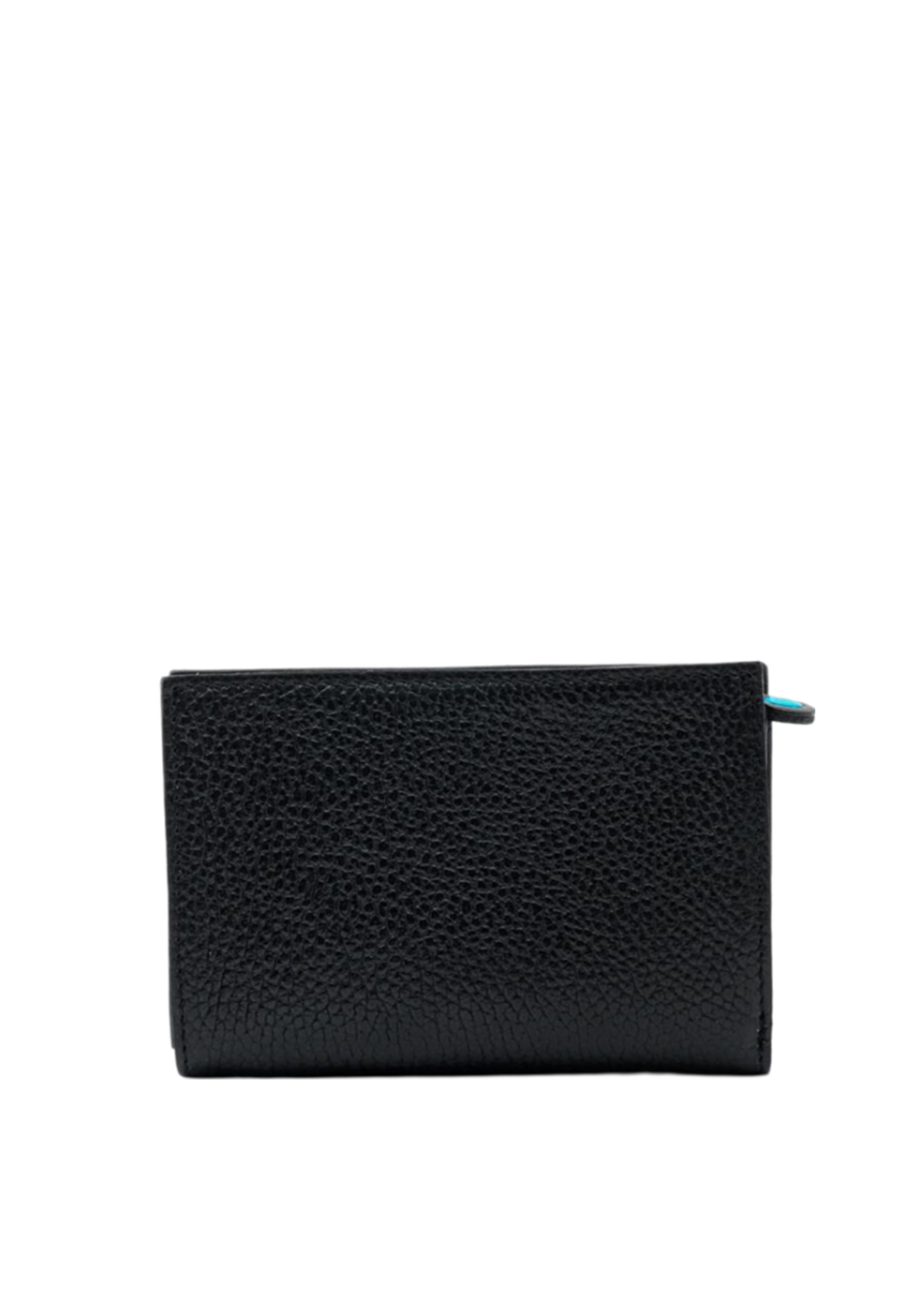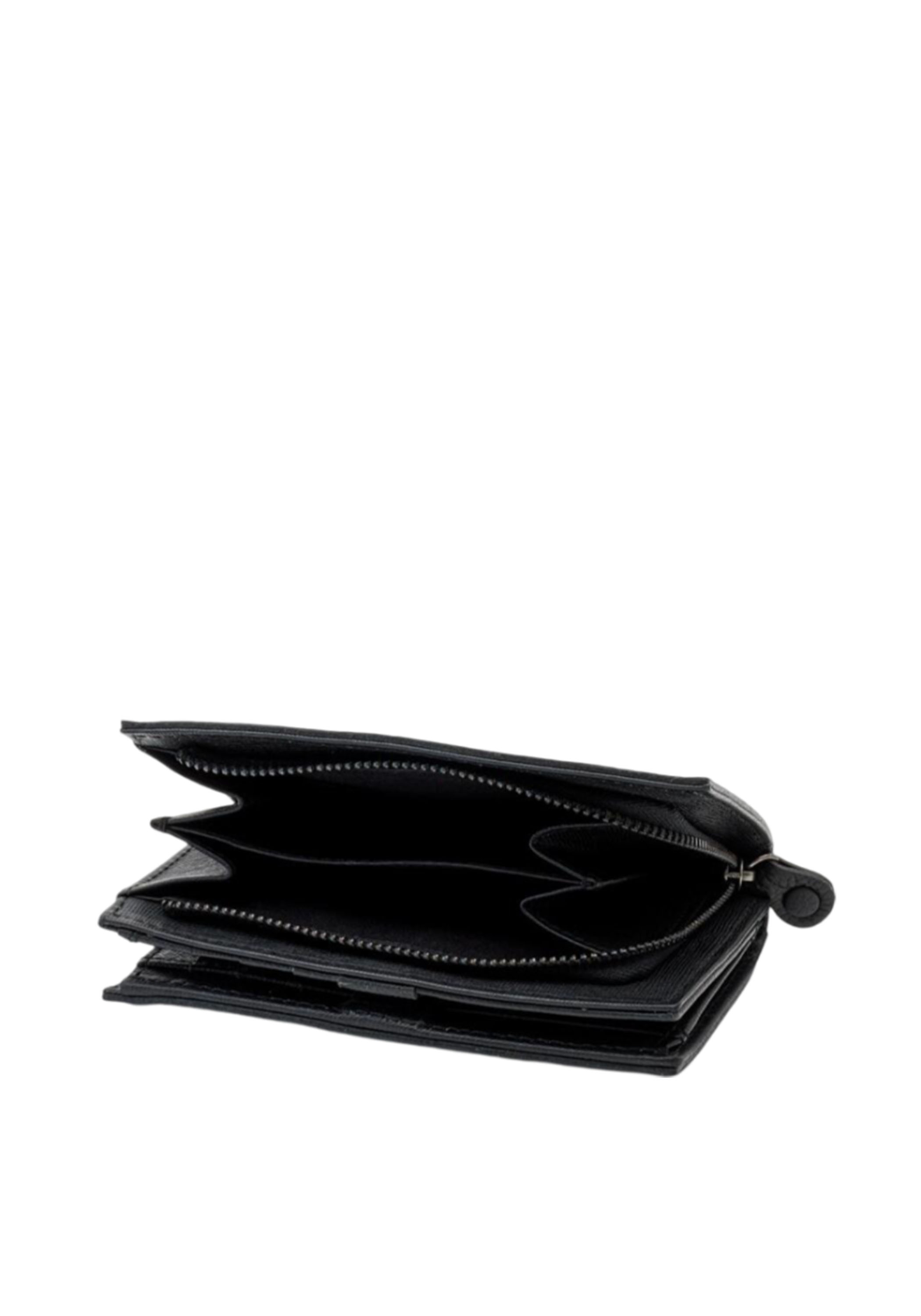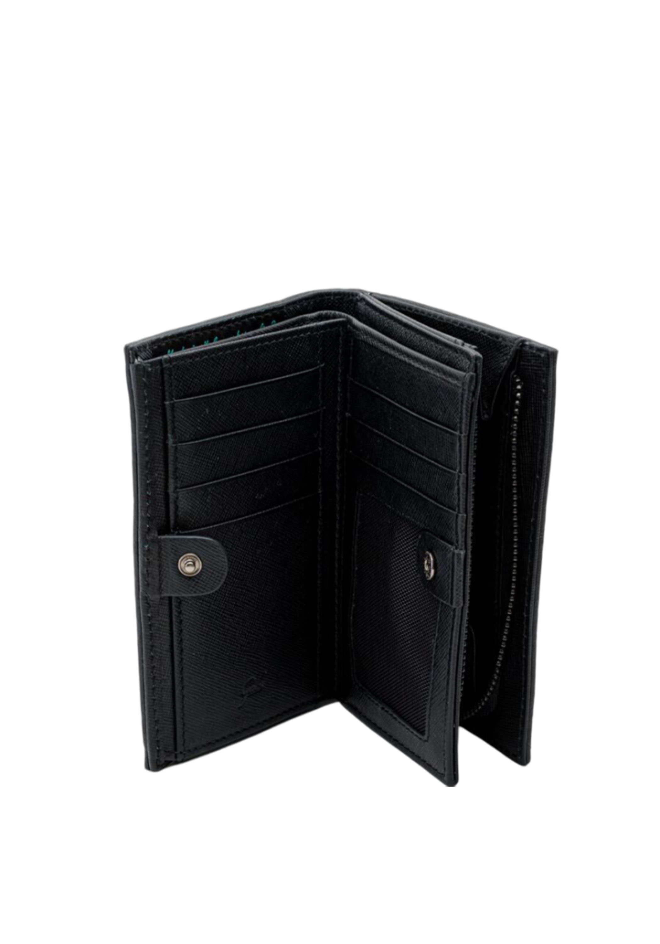 Black women's wallet with rounded workmanship and metallic logo on tone. Closure with skate and pressure button that leads to 7 compartments for tiles, large spaces for banknotes and documents. Hinge pocket for coins. Size: 14 X 2 X 10 cm approx. Material: 100% leather.