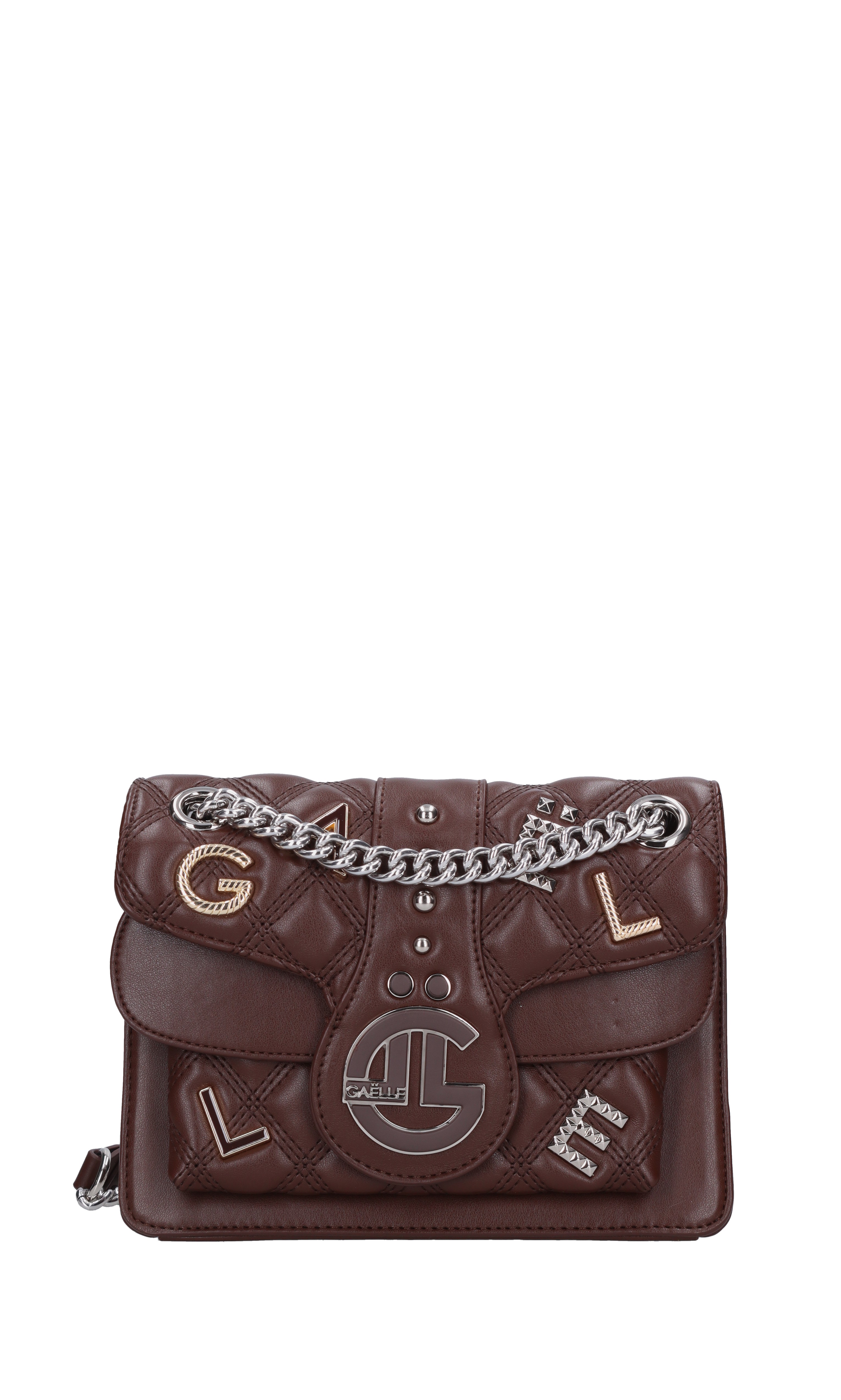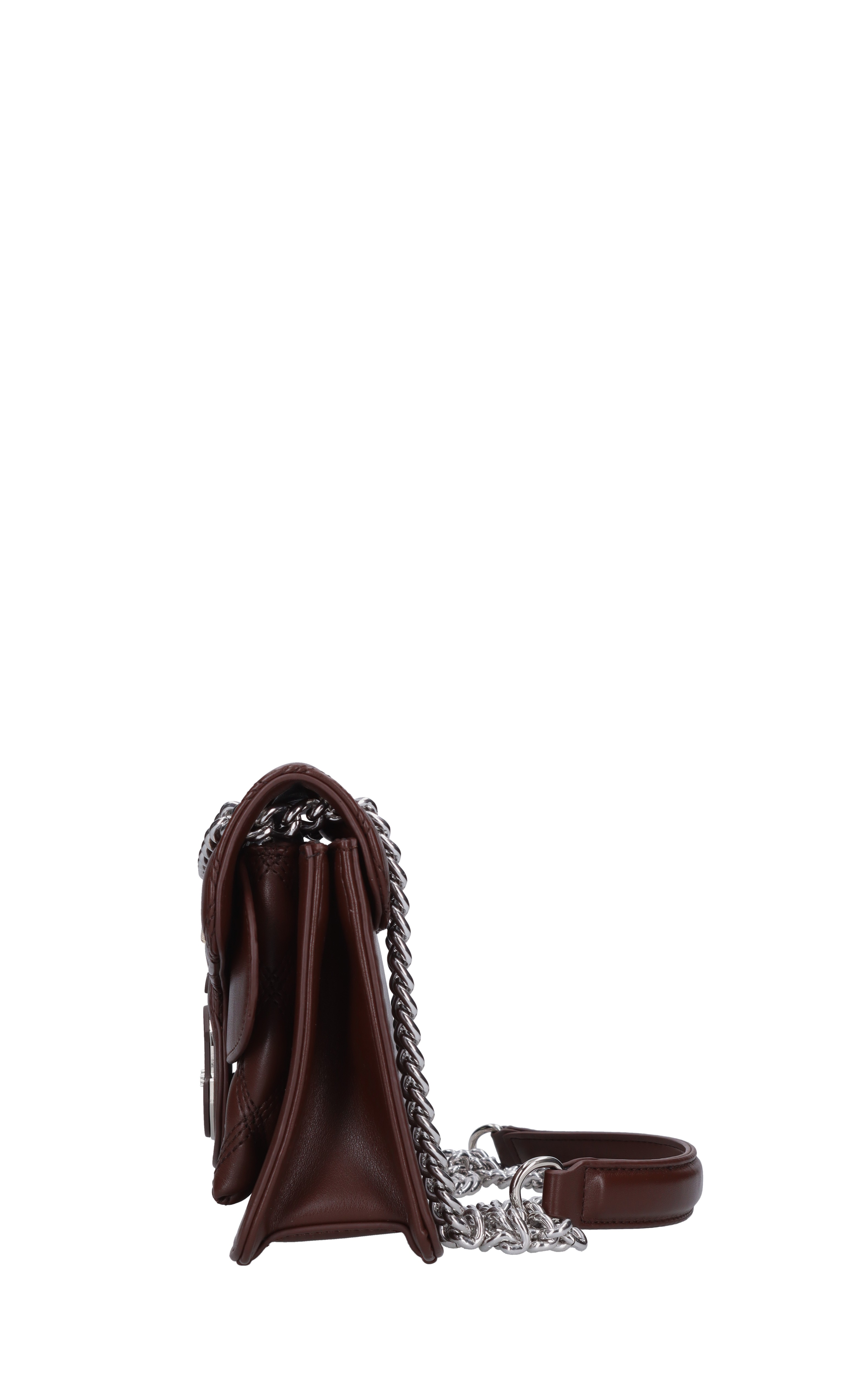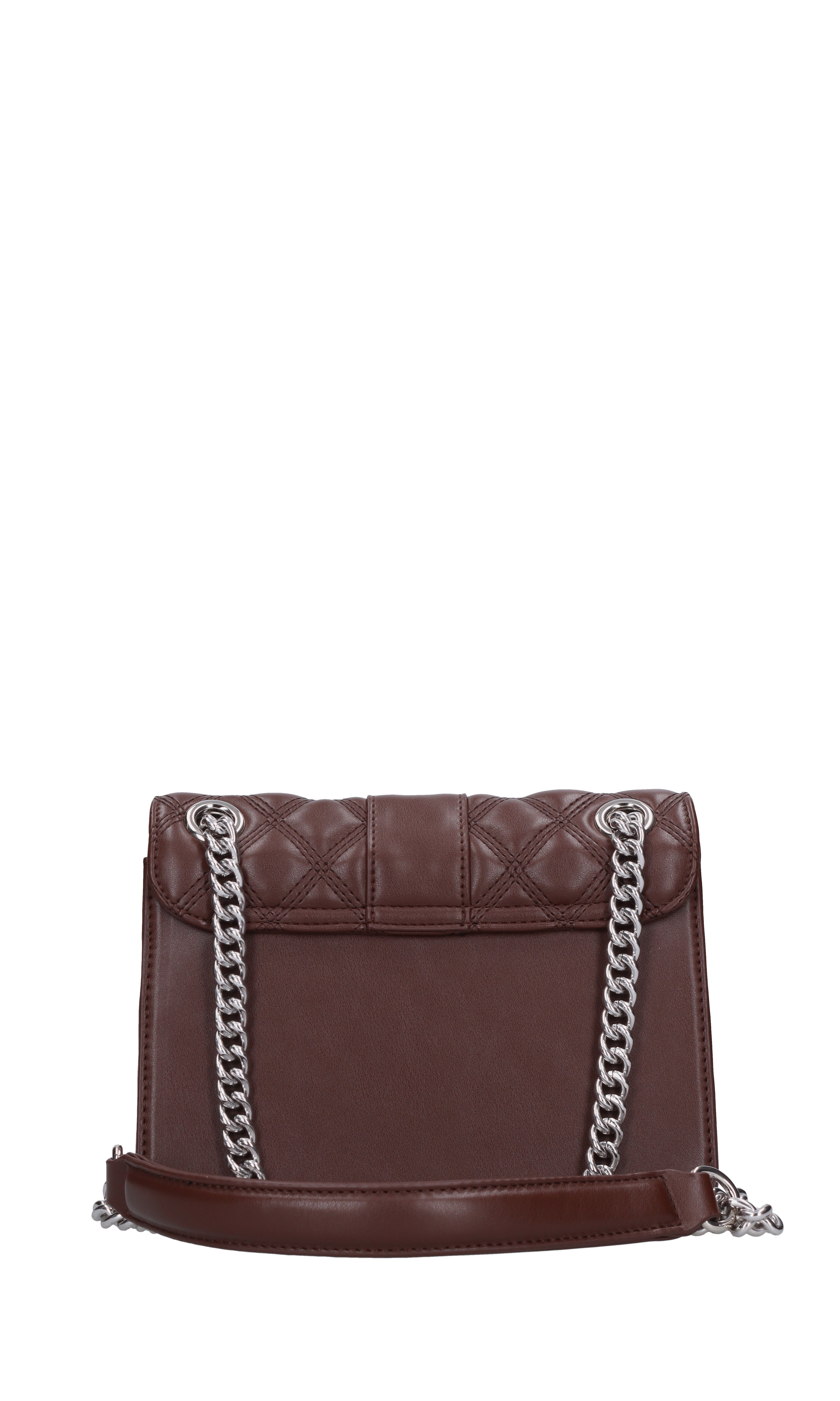 Faux leather bag. Flap and snap-button closure. 2 compartments. Non-adjustable chain shoulder strap.