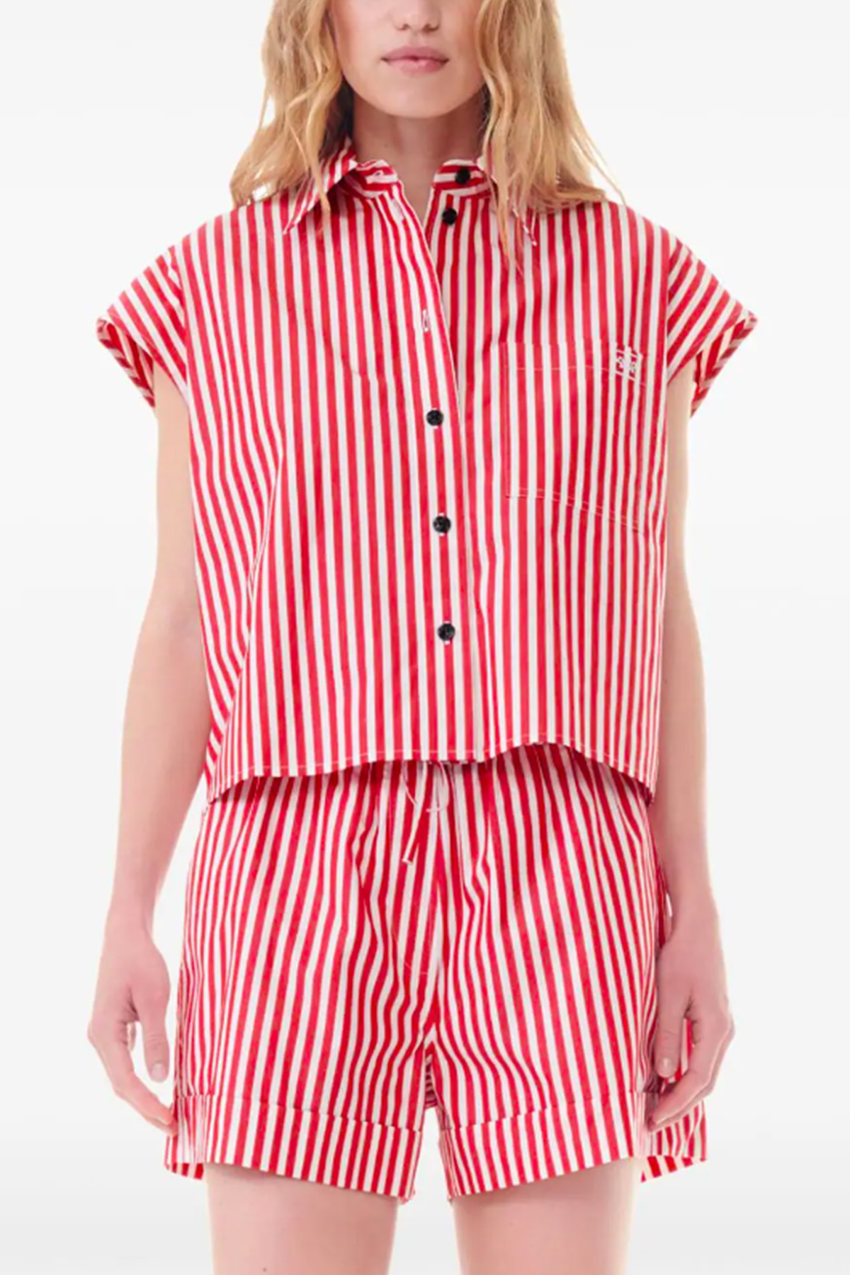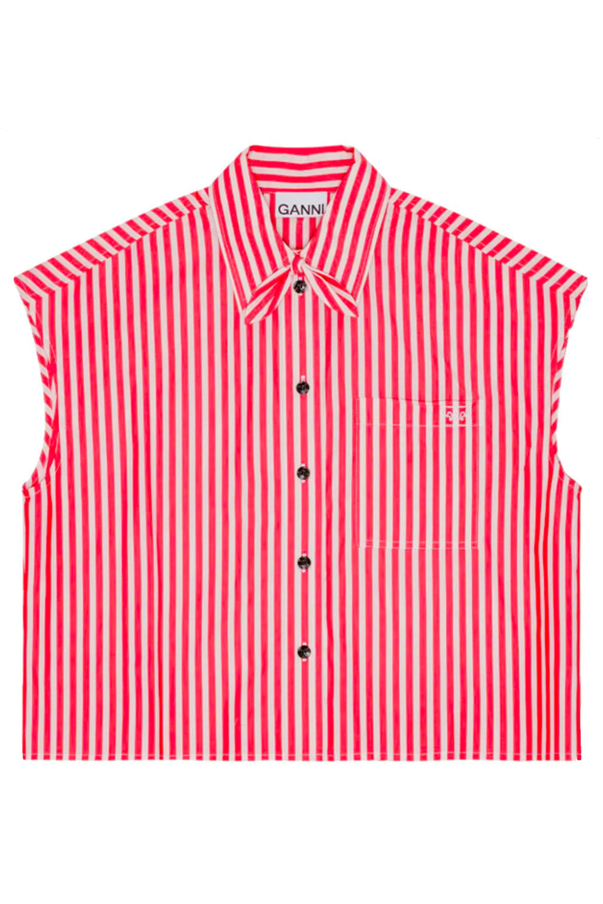 Organic cotton model, vertical stripe pattern, chest logo, classic collar, front button closure, chest patch pocket, sleeveless, straight hem. This item is made with at least 50% organic materials. Composition 100% organic cotton