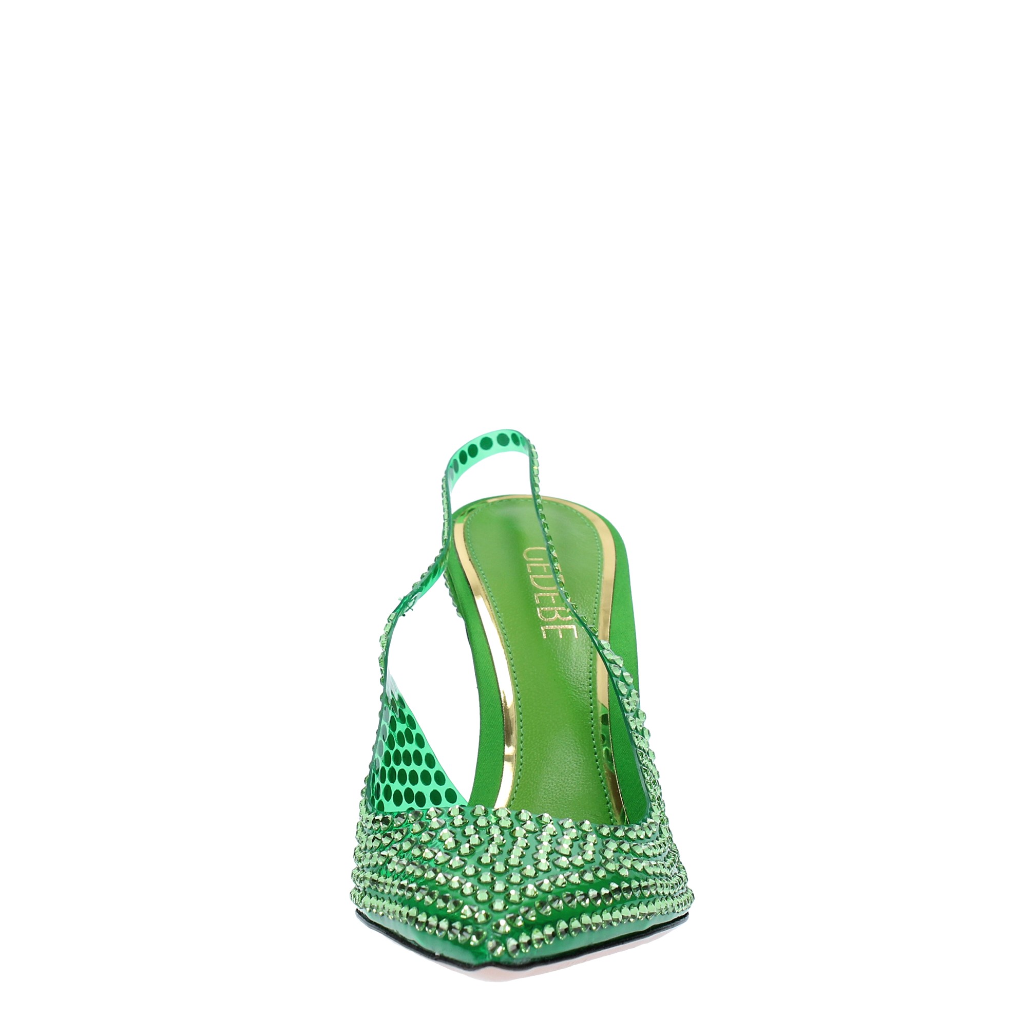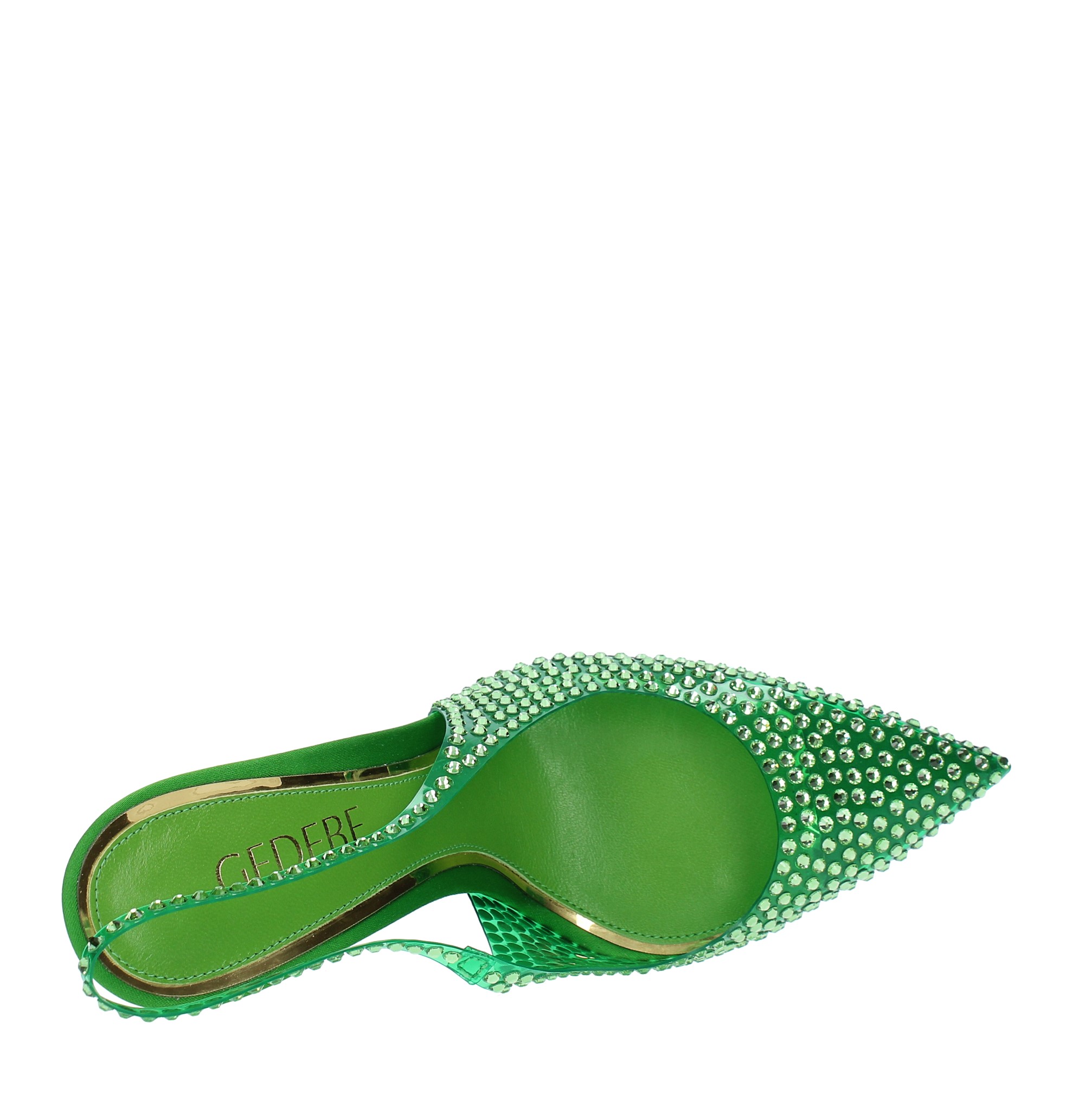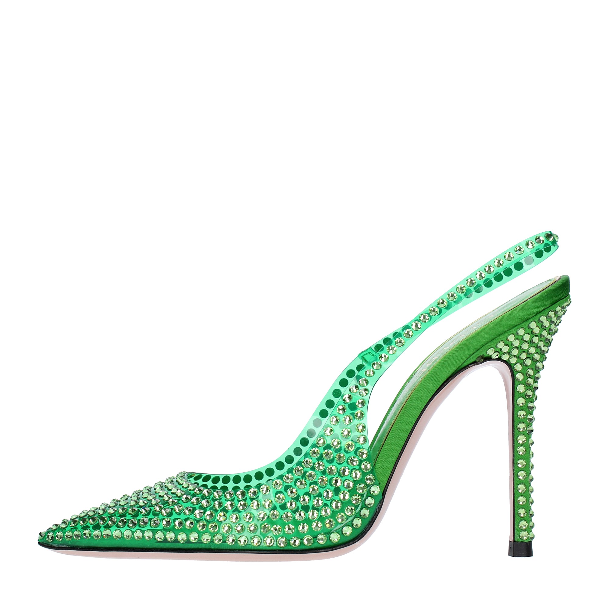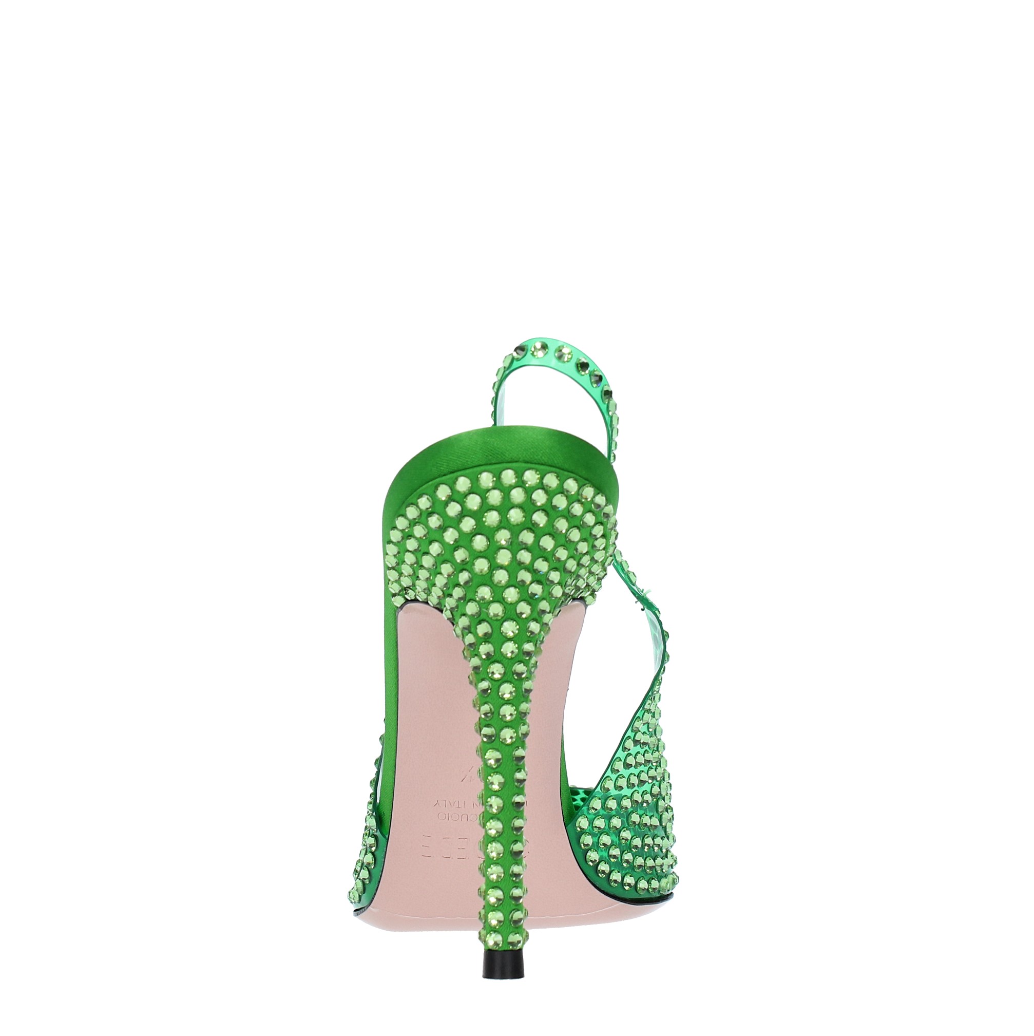 Slingback pumps model STELLA 105 in satin jelly and rhinestones. Leather outer sole. Leather internal upper.