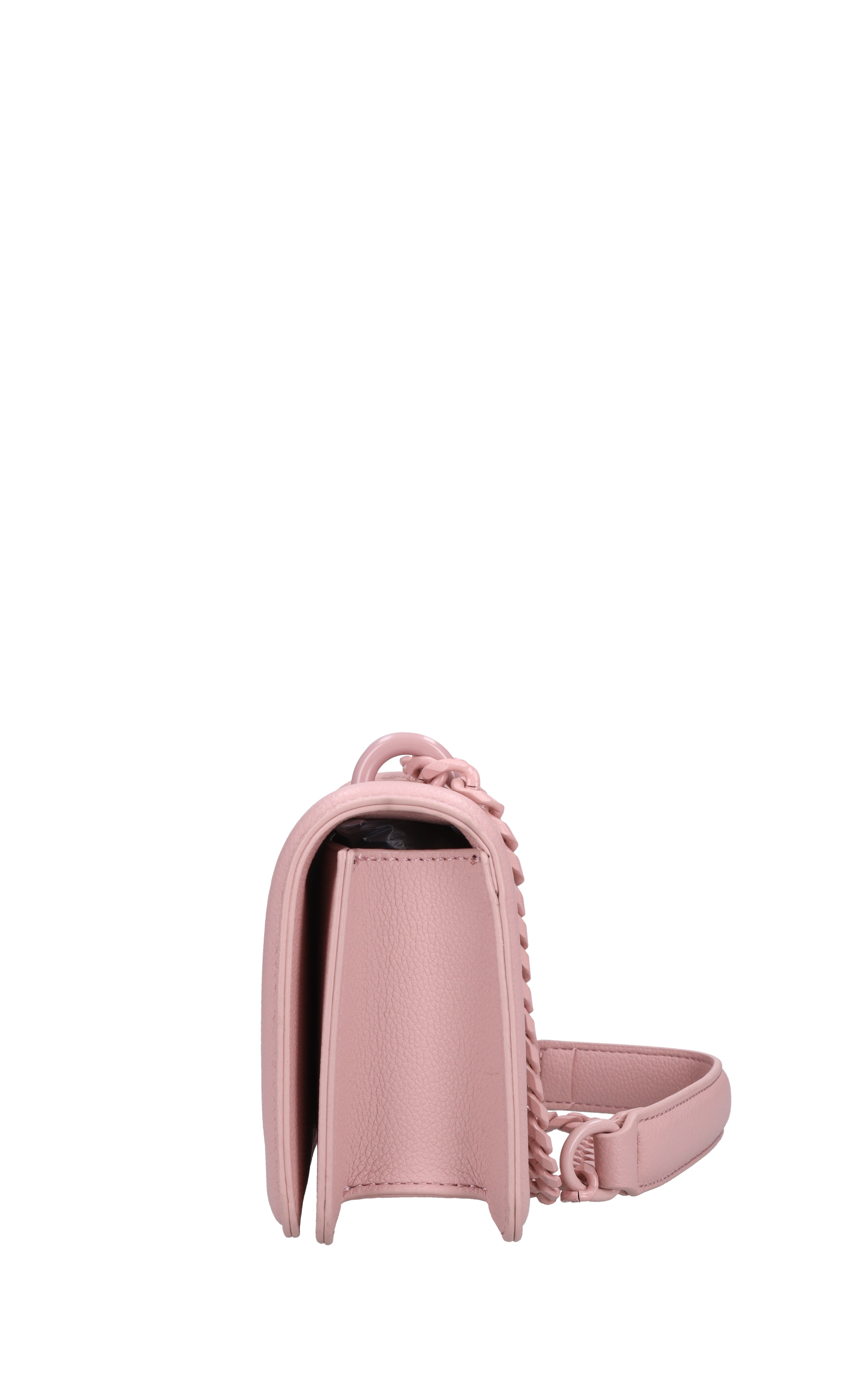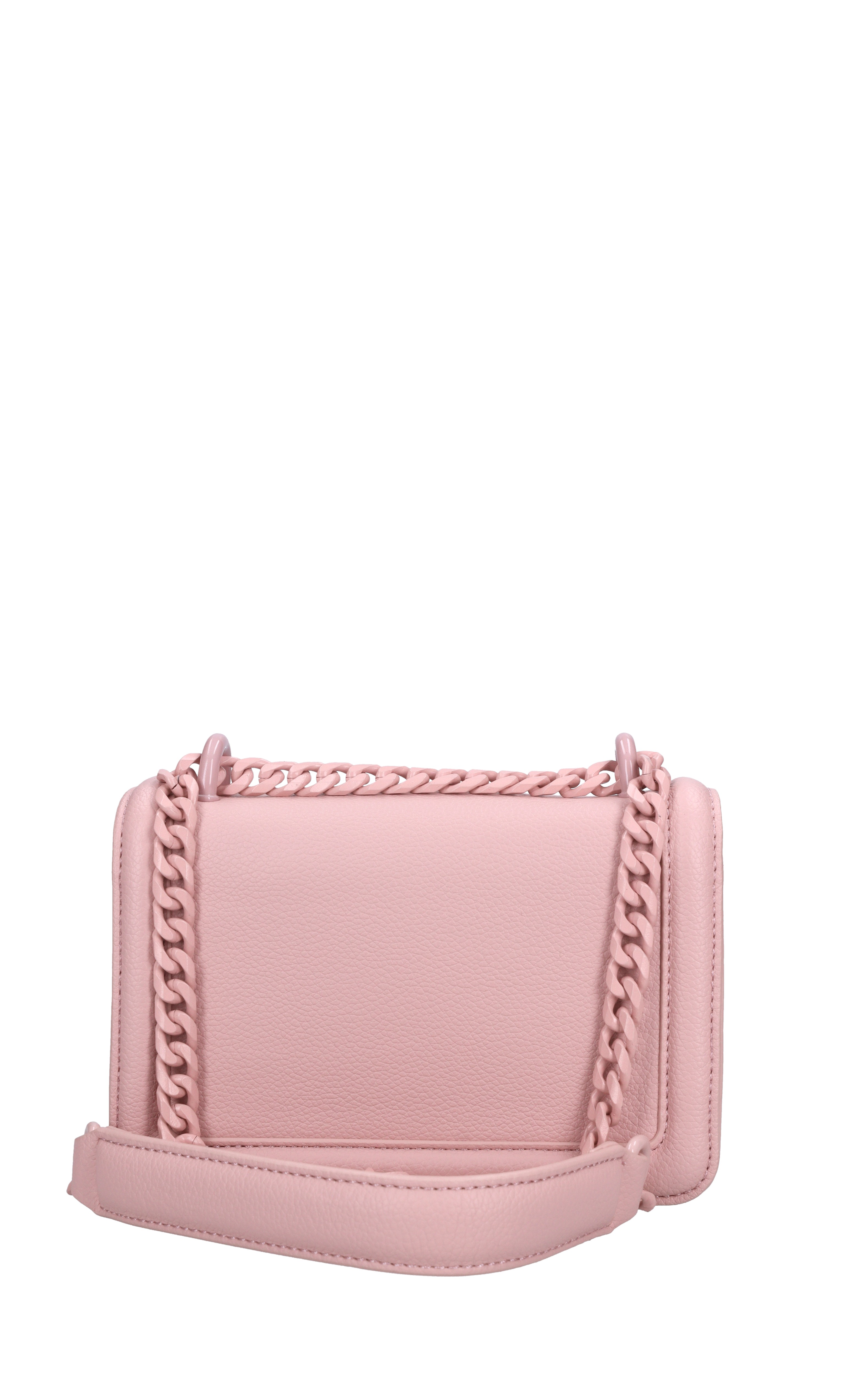 Faux leather bag. 1 Compartment. Flap closure with snap button. Non-adjustable chain shoulder strap. Shipped on clear pouch.